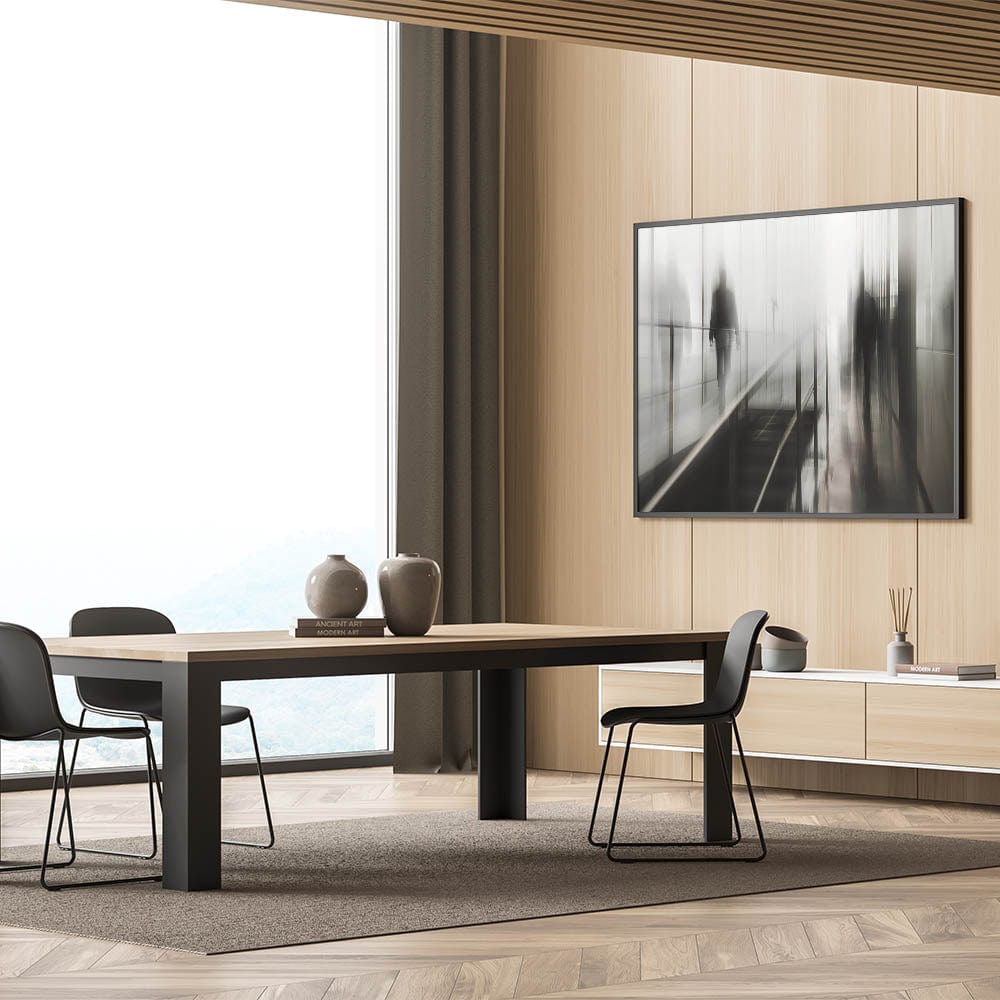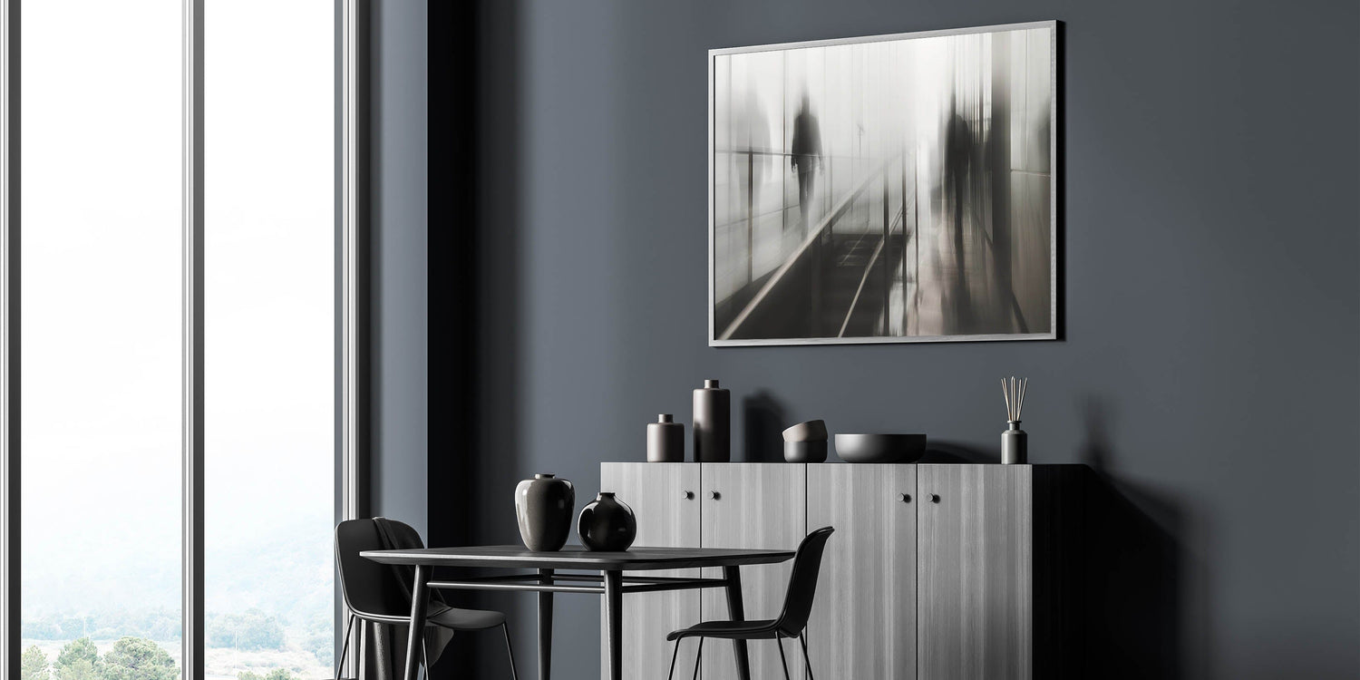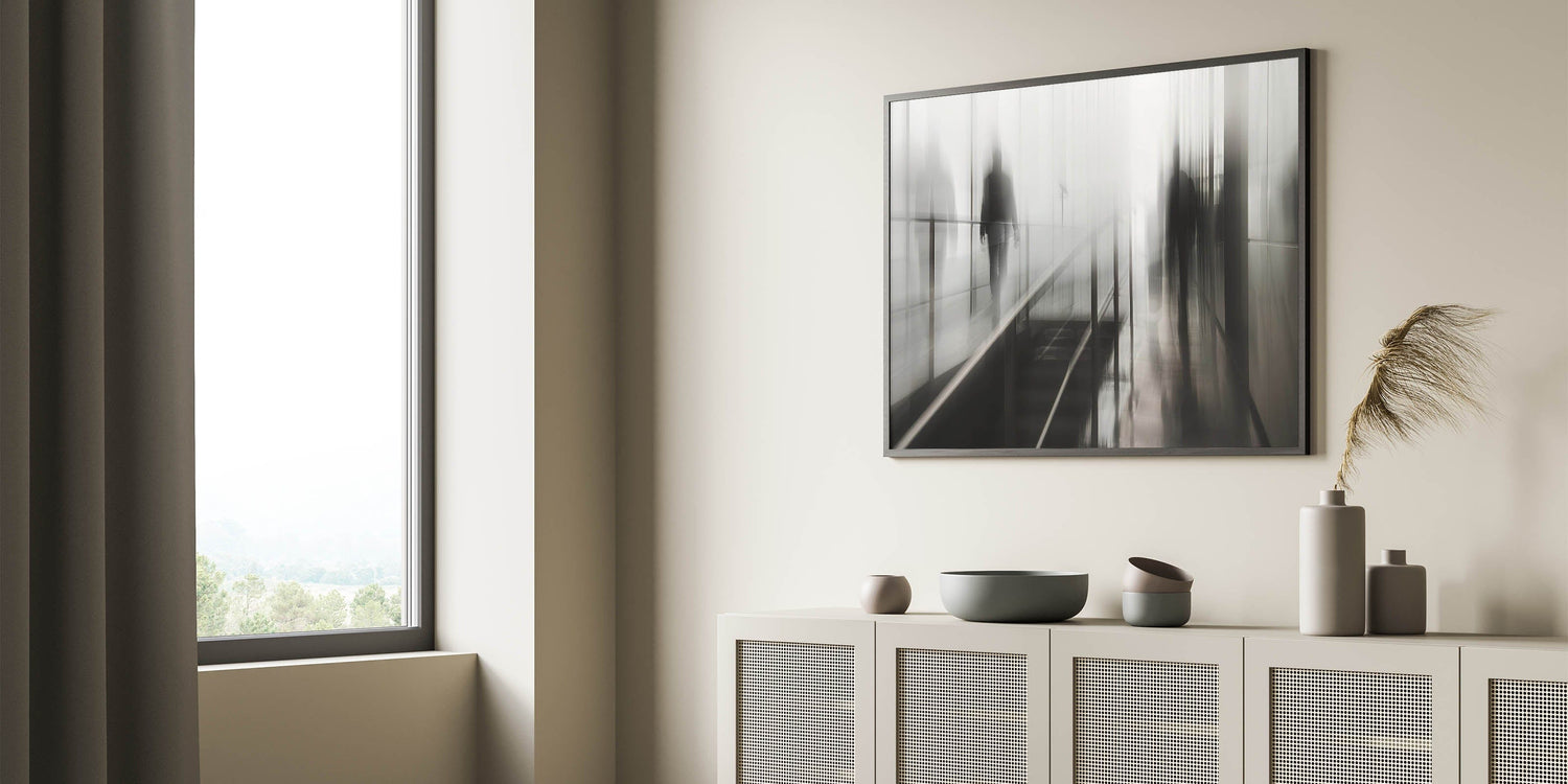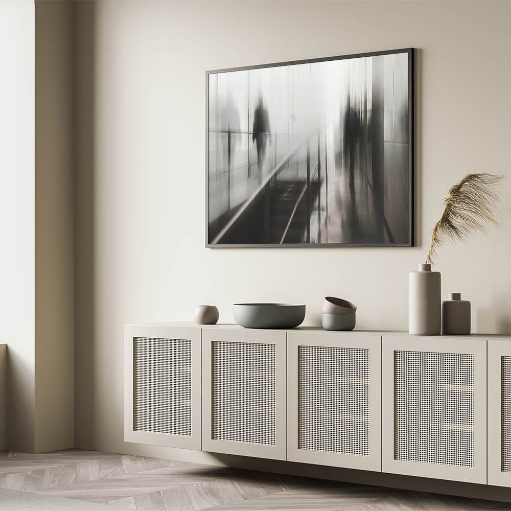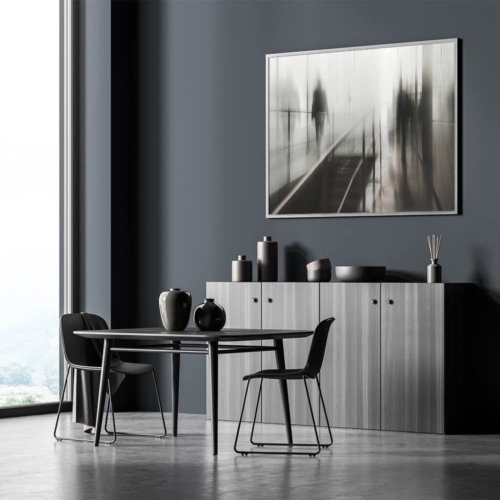 Immerse yourself in the dynamic energy of the city with this cityscape photography print. Featuring blurred silhouettes walking through a modern architectural space, this contemporary urban scenery print captures movement, mystery, and depth. The interplay of light, reflections, and motion adds a surreal touch, making this piece a striking addition to any space.