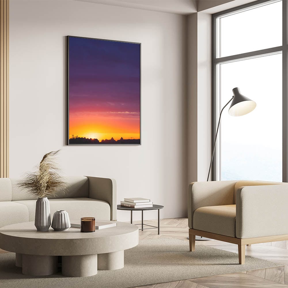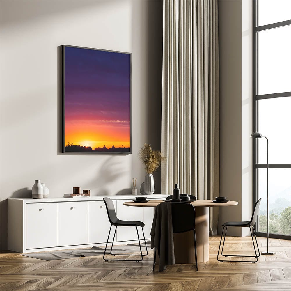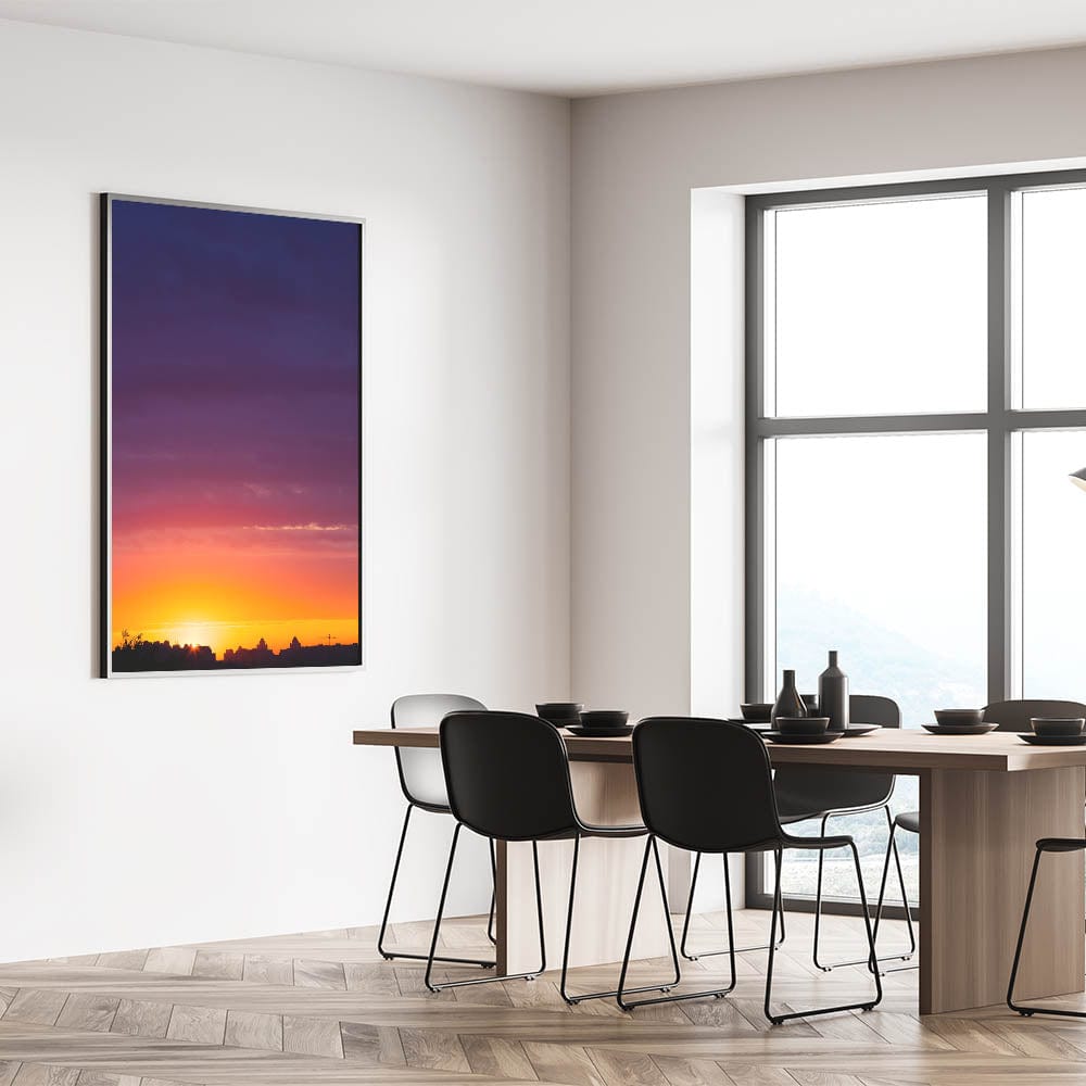 Transform your space with this breathtaking cityscape photography print, featuring a stunning skyline silhouetted against a radiant sunset. The deep purple, fiery orange, and golden hues blend seamlessly, creating a mesmerizing contrast between the city’s silhouette and the dramatic sky. This artwork is a perfect choice for those who appreciate the beauty of urban scenery wall art.