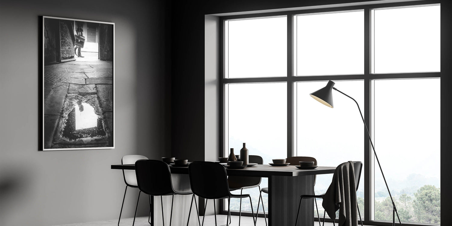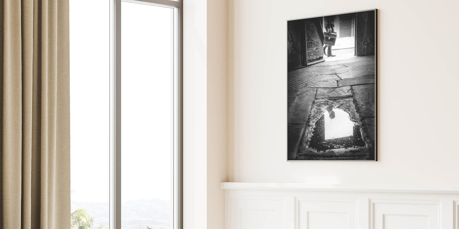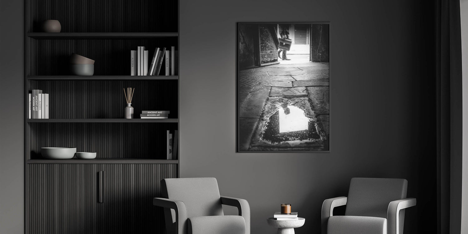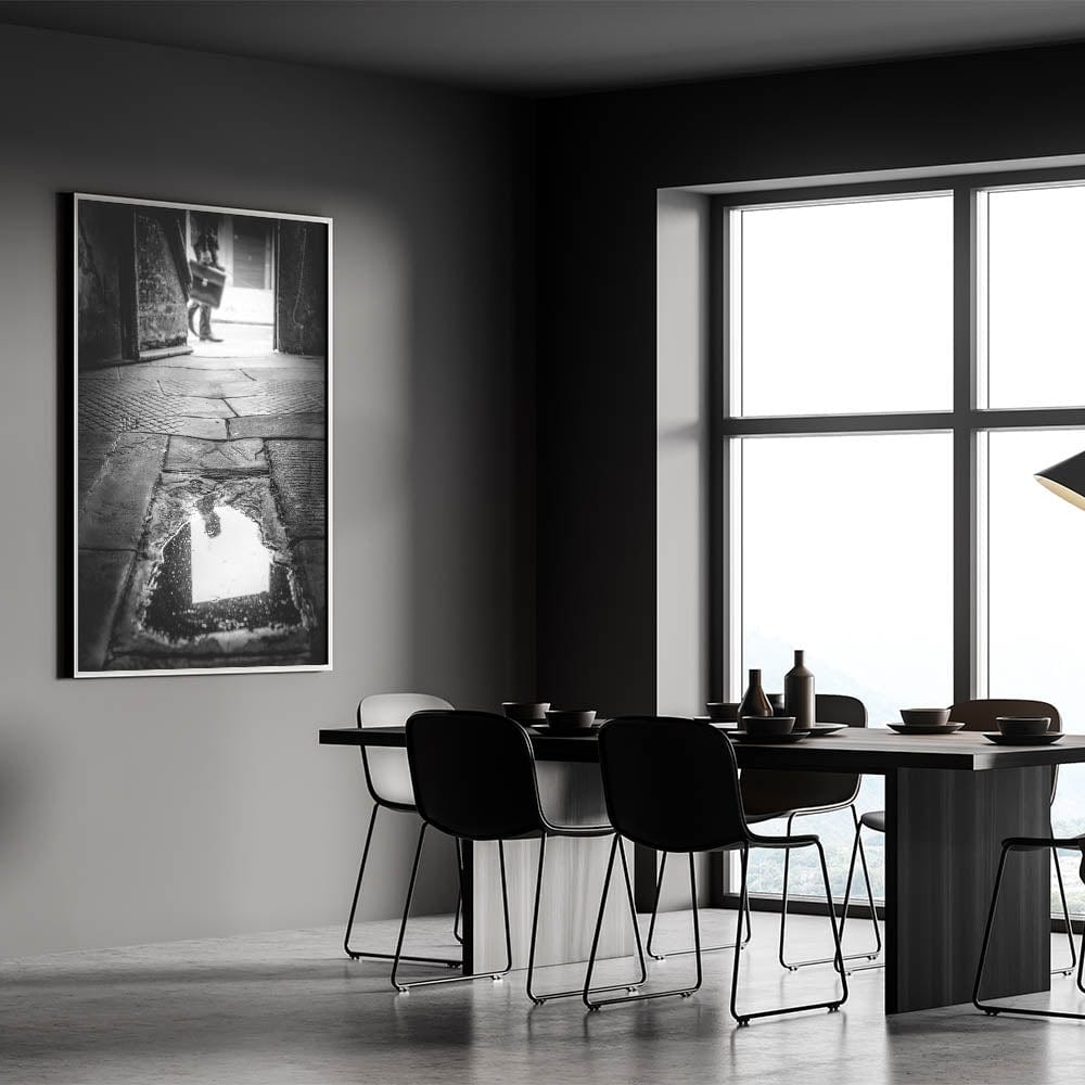 Capture the essence of city life with this stunning contemporary city wall decor, featuring a dramatic black-and-white reflection of an urban passerby in a rain puddle. The interplay of textures, light, and shadow creates a mysterious yet thought-provoking composition, making this piece a striking addition to any modern space.