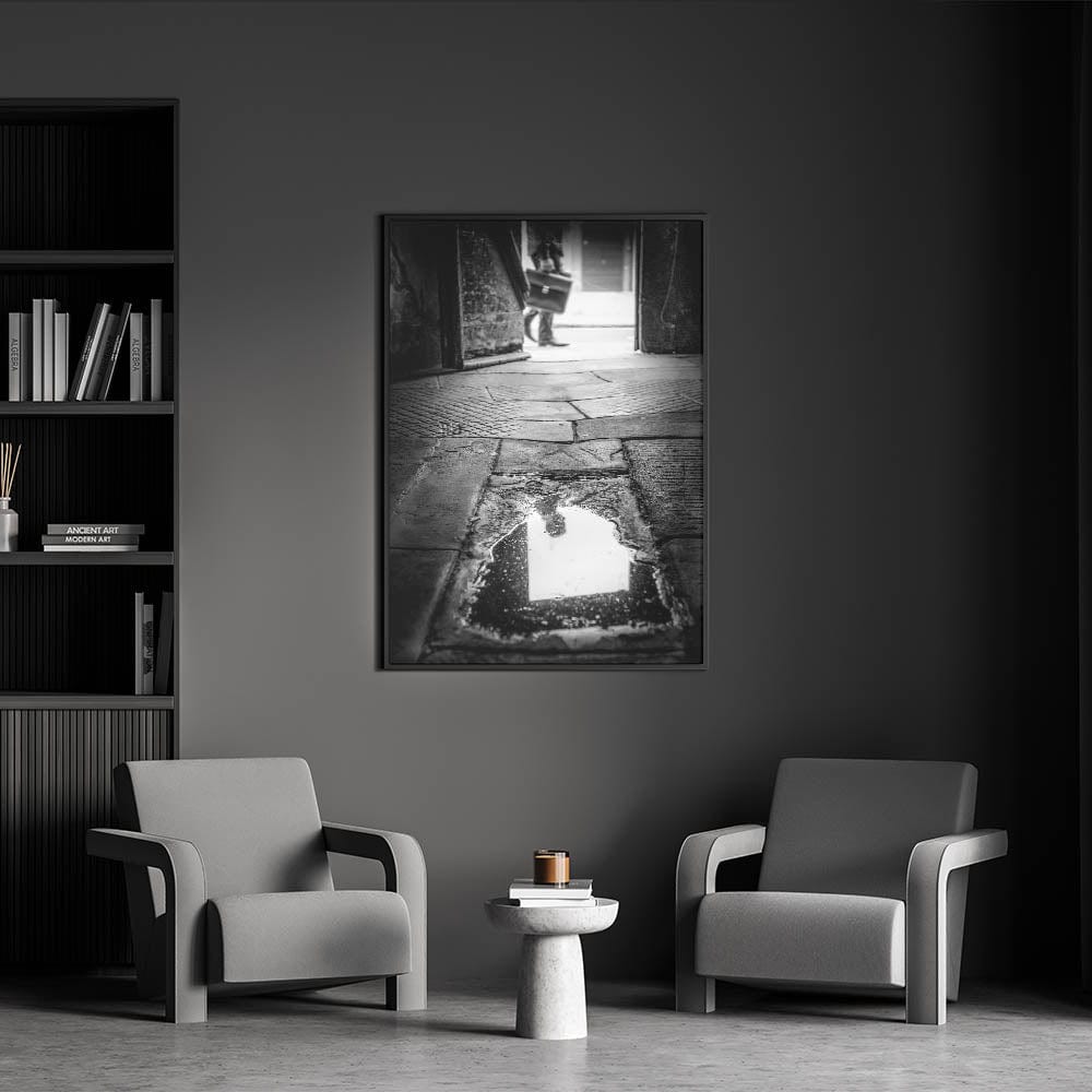 This modern cityscape wall art conveys movement, solitude, and the rhythm of daily life in an urban setting. The blurred figure walking in the background juxtaposed with the sharp reflection in the puddle adds depth and intrigue to the piece. Whether you're a fan of contemporary urban scenery prints or love minimalist, high-contrast artwork, this print will bring a sense of sophistication and storytelling to your decor.