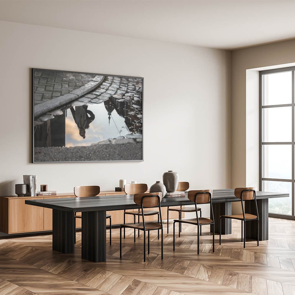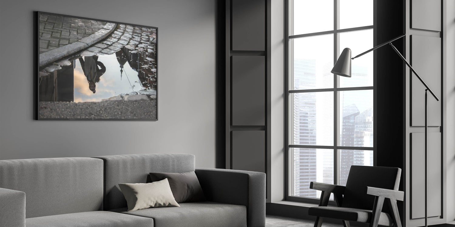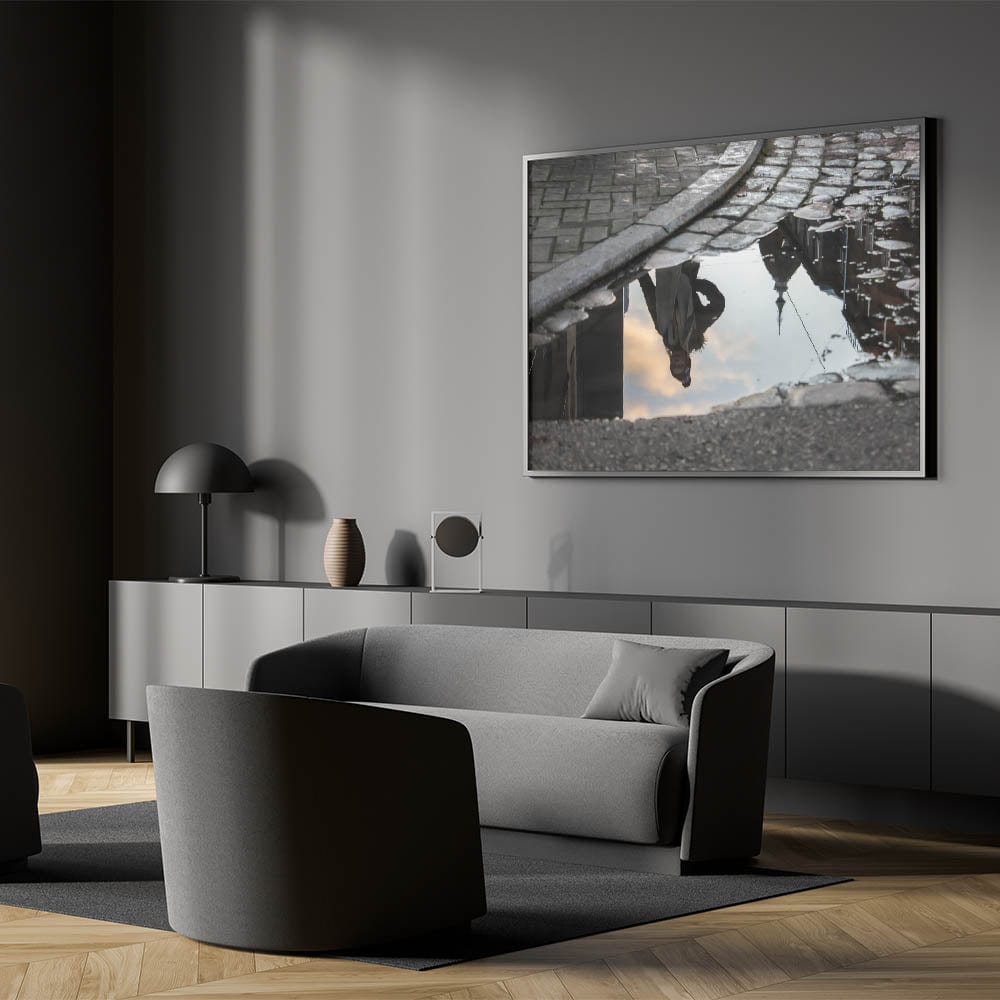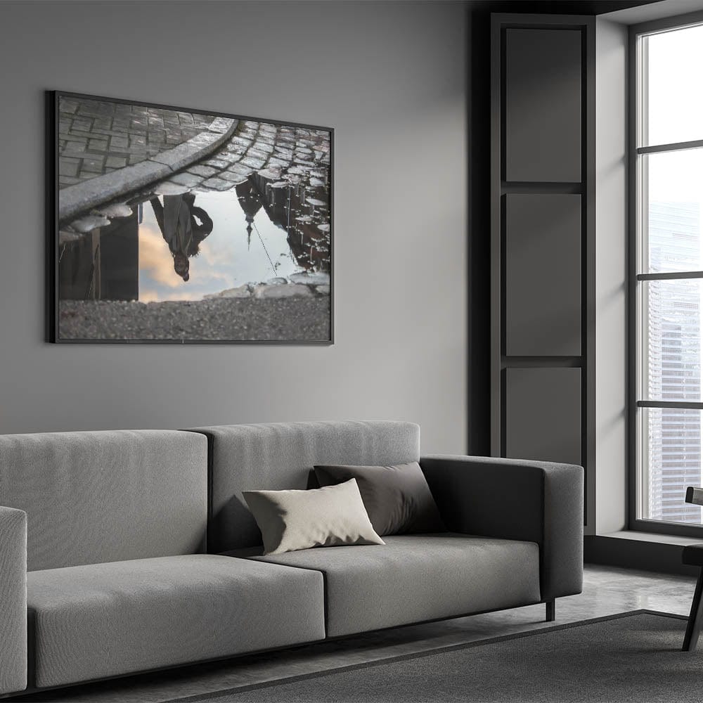 Capture the artistic beauty of the city with this high-quality urban photography print, featuring a captivating puddle reflection of a passerby and historic architecture. The blurred water ripples and soft golden hues of the sky create a dreamlike and poetic scene, making this contemporary city wall art a unique addition to any modern interior.