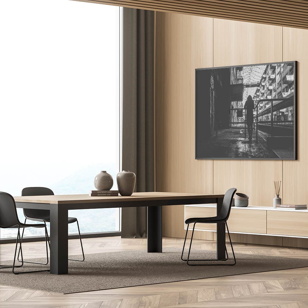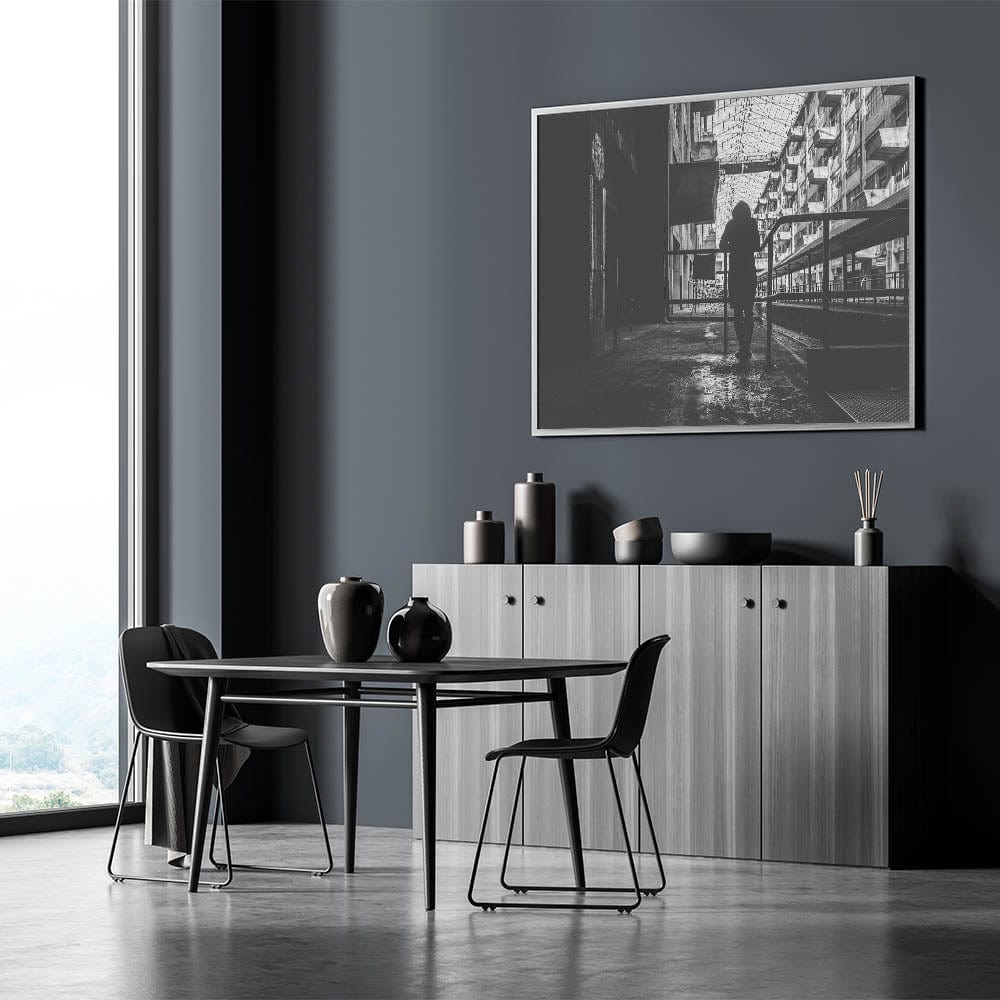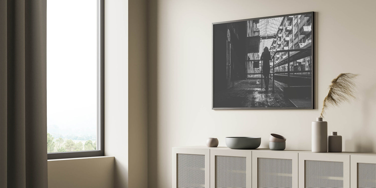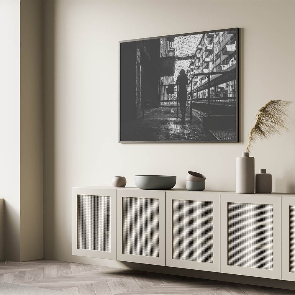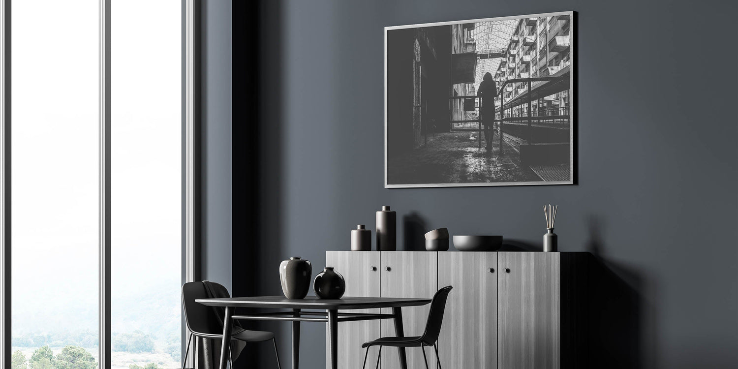 Bring a dramatic and thought-provoking touch to your space with this metropolitan photography art piece. Featuring the silhouette of a solitary figure standing against a backdrop of industrial architecture, this contemporary city wall decor captures the beauty of urban solitude. The intricate play of shadows, geometric patterns, and aged textures makes this artwork a powerful statement piece.