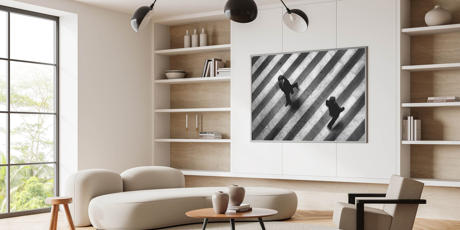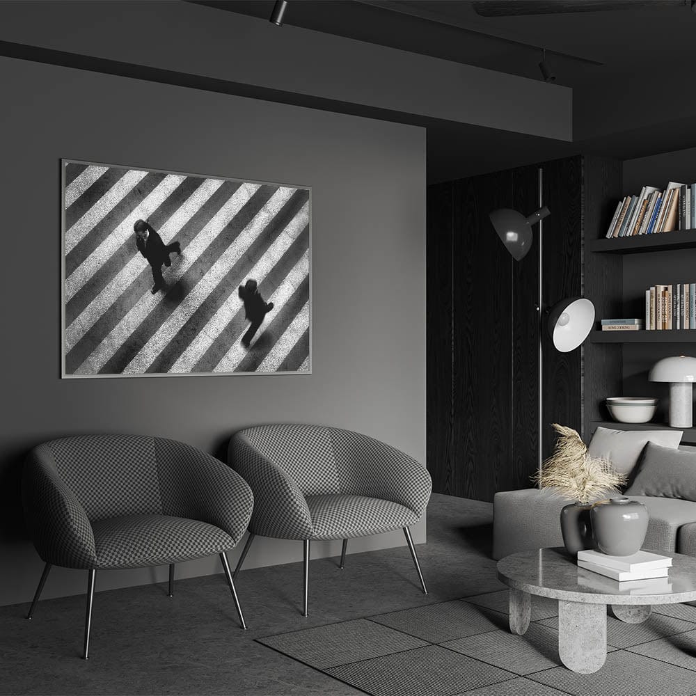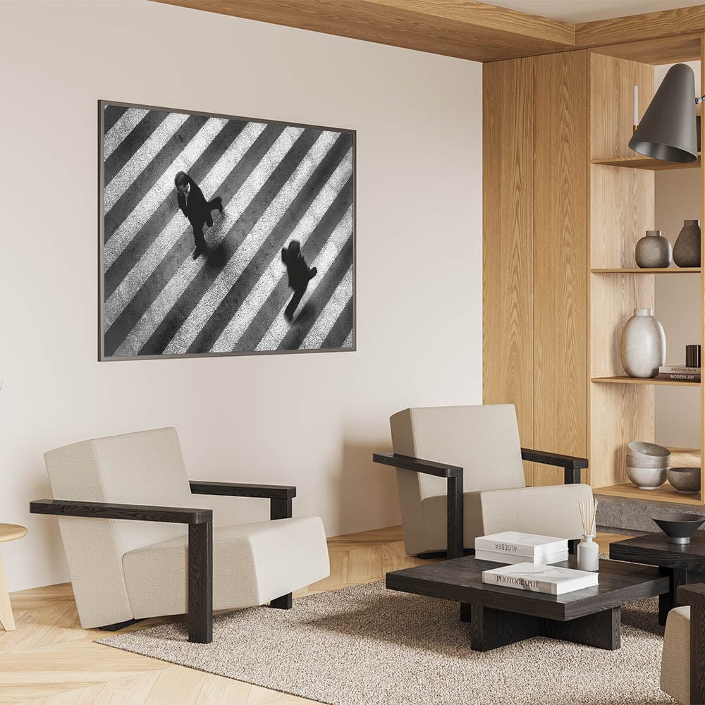 Elevate your space with this metropolitan photography art, featuring a dynamic overhead view of two individuals crossing a striped pedestrian walkway. The contemporary urban scenery print captures movement and contrast in a striking black-and-white composition, making it a compelling addition to modern interiors. The geometric lines and blurred motion create a unique artistic statement, embodying the rhythm of city life.