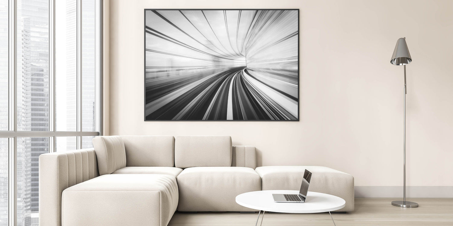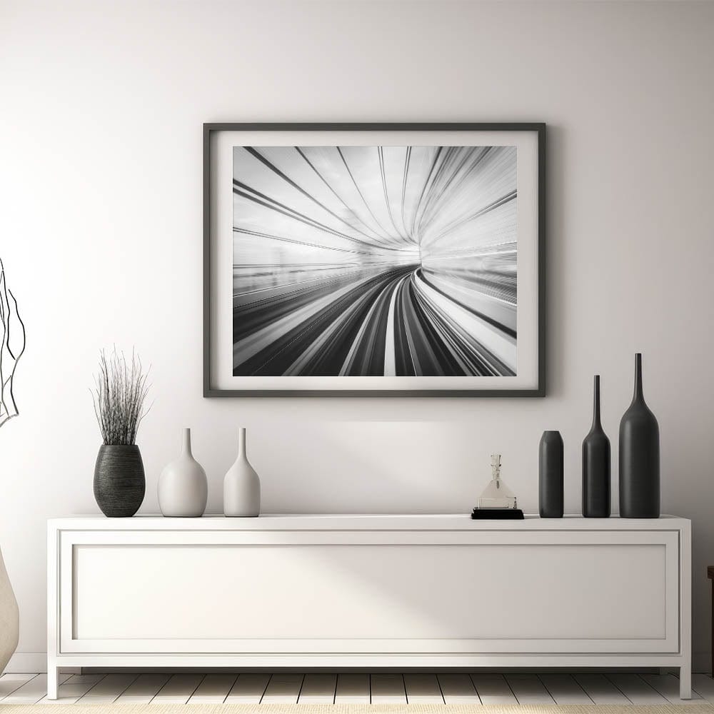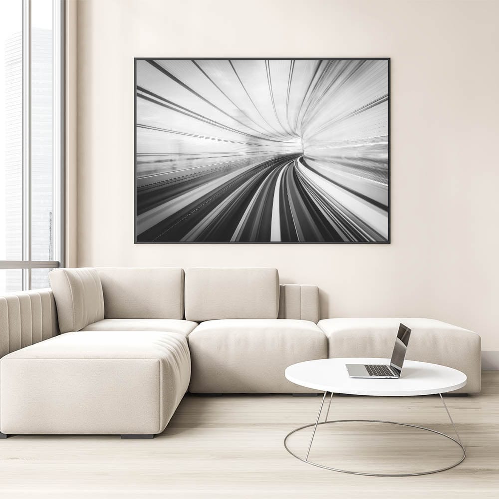 Immerse yourself in the speed and energy of city life with this metropolitan photography art. Featuring a high-speed motion blur of a modern rail system, this black-and-white urban scenery wall art captures the futuristic essence of contemporary transportation and architectural design. The sleek curves and striking perspective make it a dynamic statement piece for any modern interior.