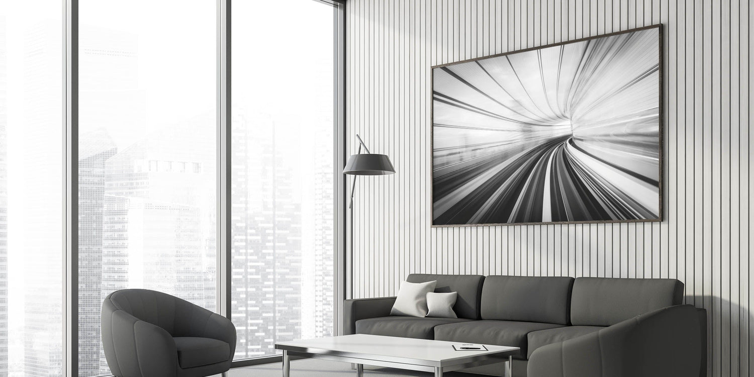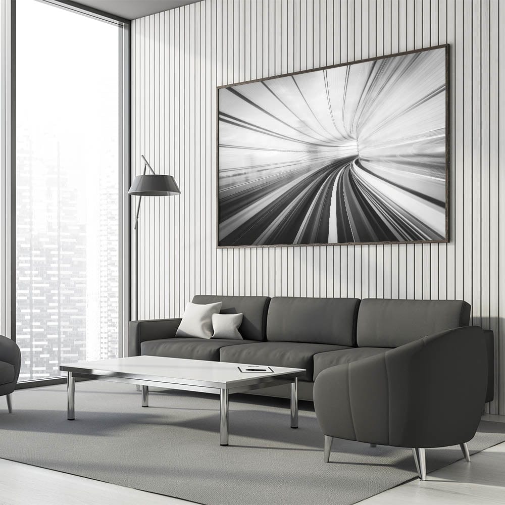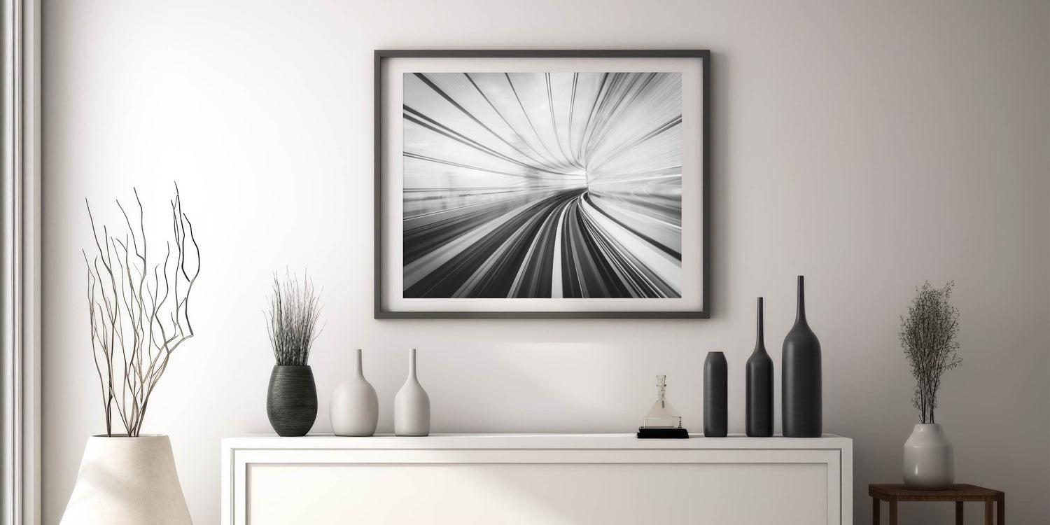 Immerse yourself in the speed and energy of city life with this metropolitan photography art. Featuring a high-speed motion blur of a modern rail system, this black-and-white urban scenery wall art captures the futuristic essence of contemporary transportation and architectural design. The sleek curves and striking perspective make it a dynamic statement piece for any modern interior.