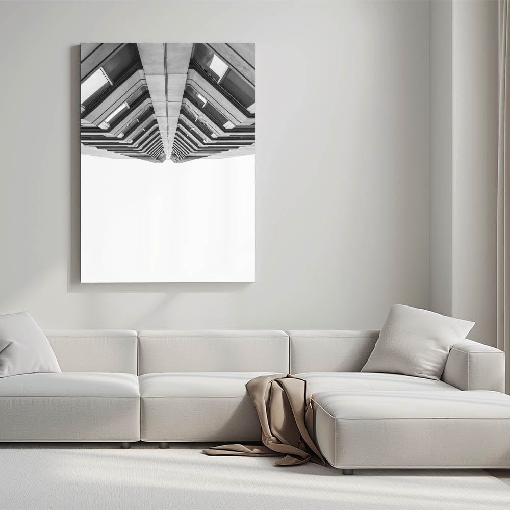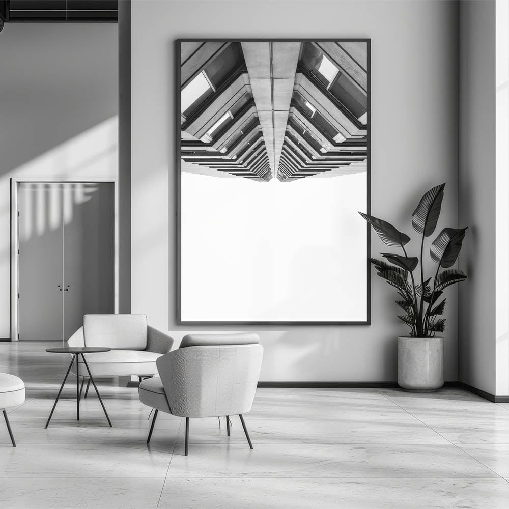 Discover the beauty of modern architecture with this striking metropolitan photography art. This contemporary black-and-white cityscape print captures a high-rise building from a bold, upward perspective, emphasizing its geometric symmetry and architectural depth. Perfect for lovers of urban architectural photography.
