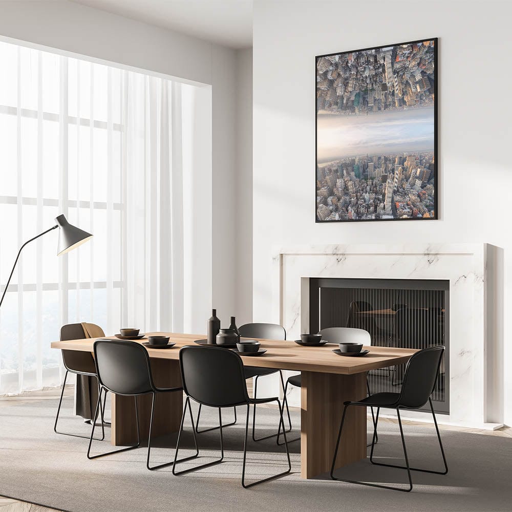 Step into a futuristic cityscape with this stunning metropolitan photography art. Featuring a mirrored skyline that blends into the sky, this surreal urban wall art challenges perception and transforms your space into a modern masterpiece.
