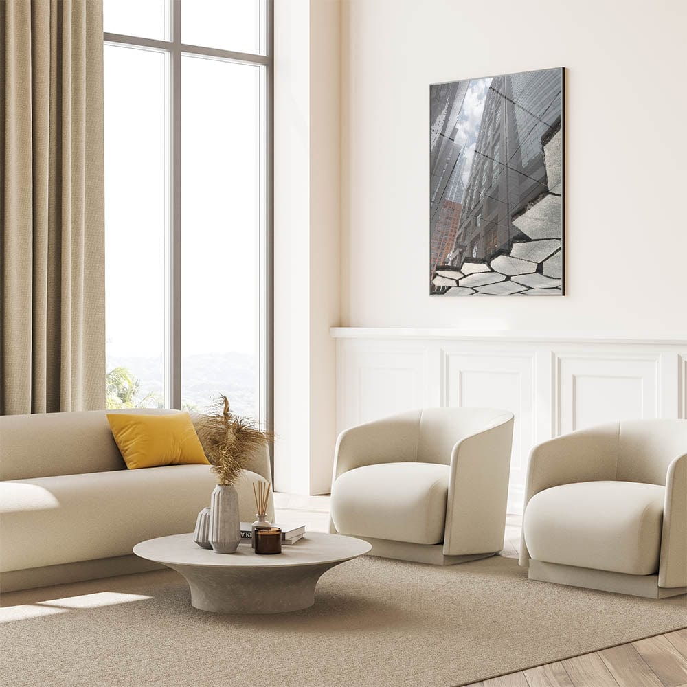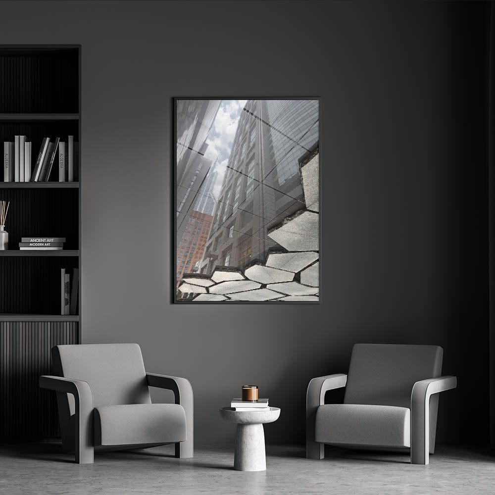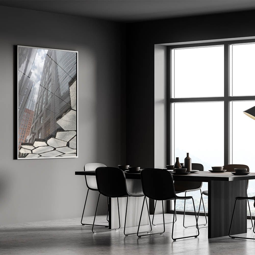 Immerse yourself in the beauty of urban architectural photography with this stunning depiction of towering city skyscrapers reflected on fragmented pavement. This contemporary city wall decor blends modern design with an artistic perspective, making it a perfect addition to any stylish interior.