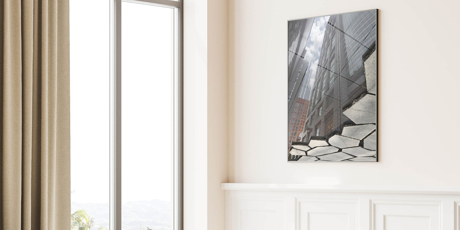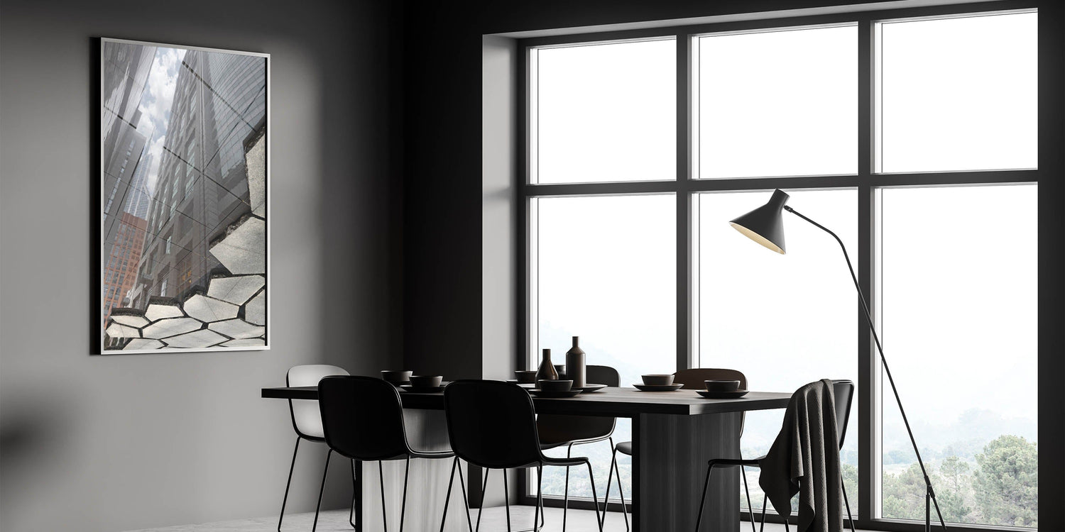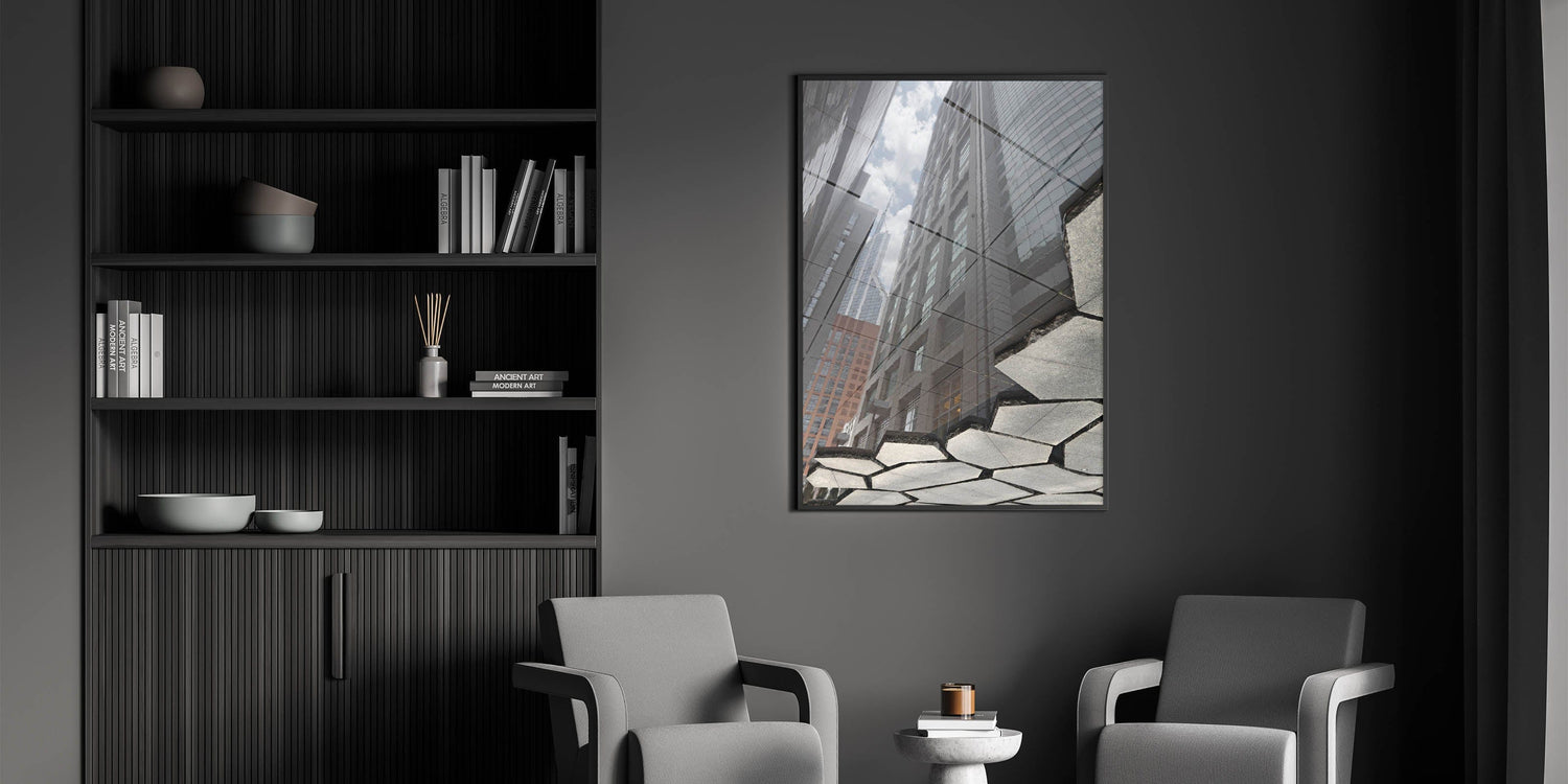 Immerse yourself in the beauty of urban architectural photography with this stunning depiction of towering city skyscrapers reflected on fragmented pavement. This contemporary city wall decor blends modern design with an artistic perspective, making it a perfect addition to any stylish interior.
