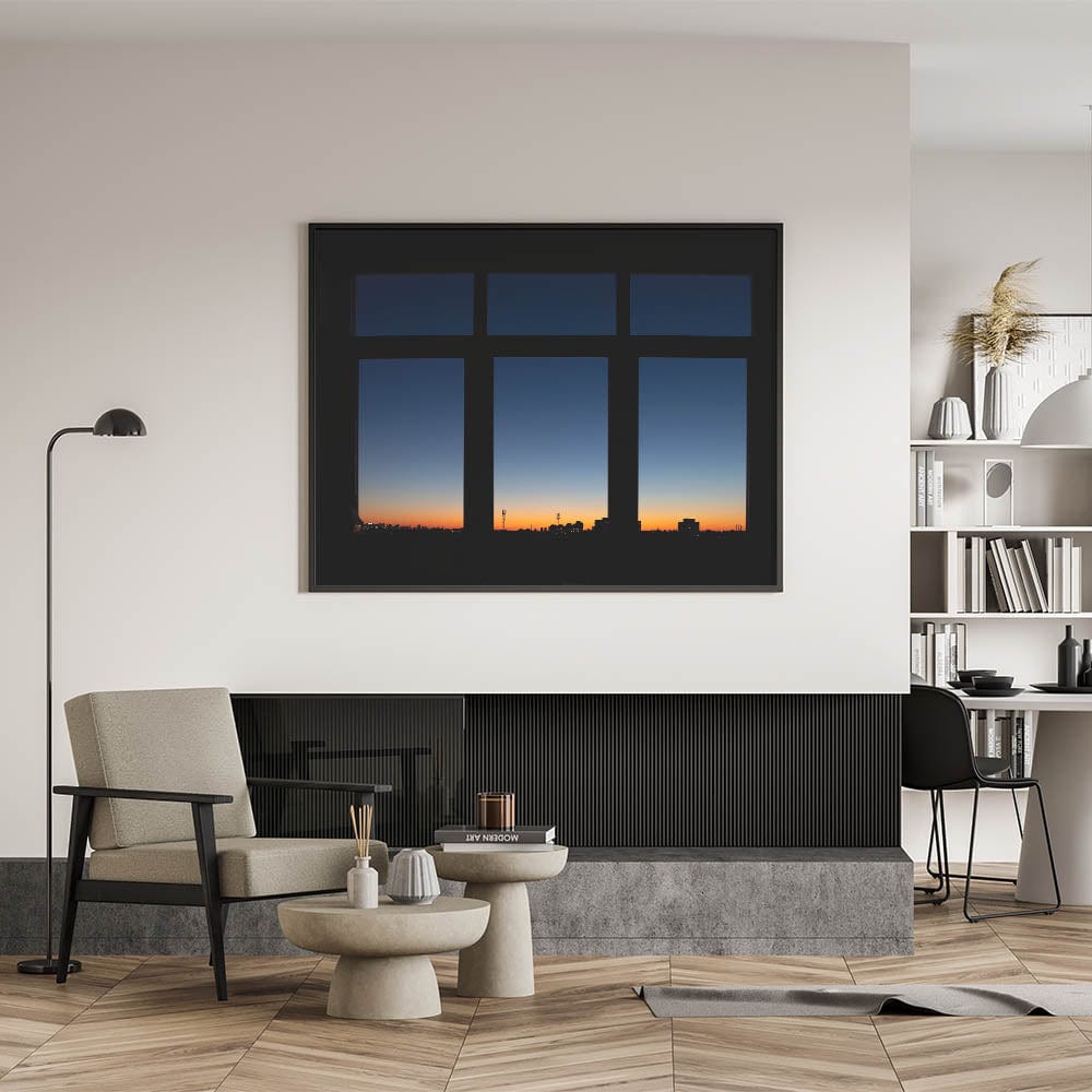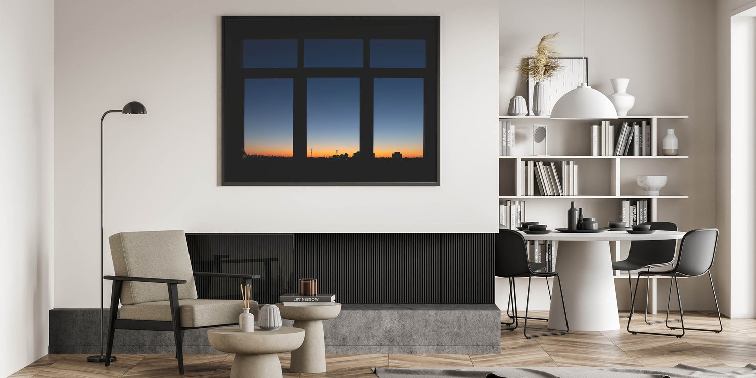 Capture the beauty of a city at dusk with this stunning metropolitan photography art print. Showcasing an urban skyline silhouetted against a breathtaking sunset, this piece blends deep blues with warm orange and yellow tones. The view from a window creates a sense of depth and tranquility, making it an excellent choice for contemporary city wall decor. Whether you're drawn to vibrant cityscape canvas prints or appreciate the calming effect of a skyline at twilight, this artwork makes a sophisticated statement.
