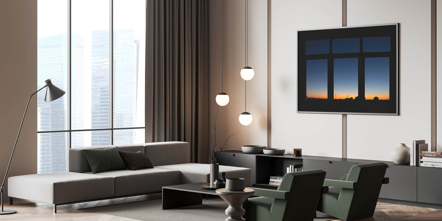 - High-resolution city skyline wall art with vivid color transitions