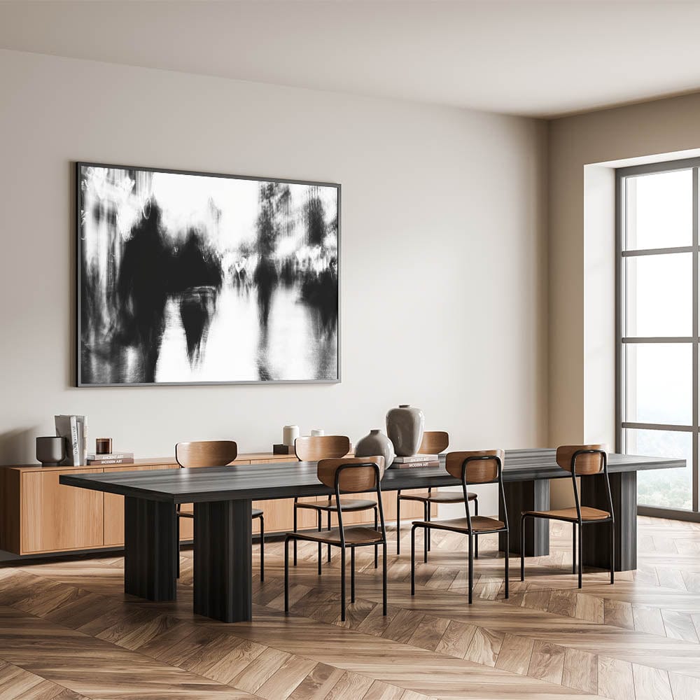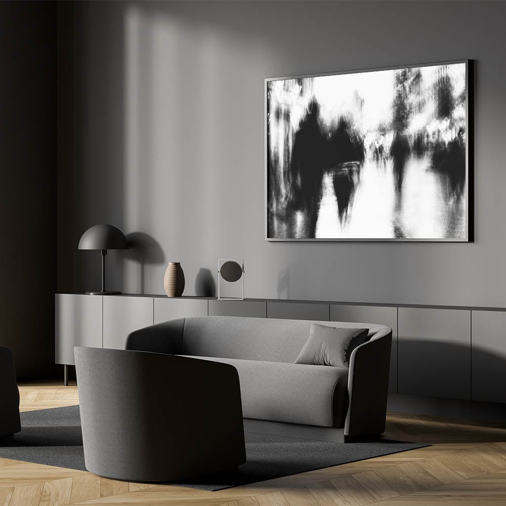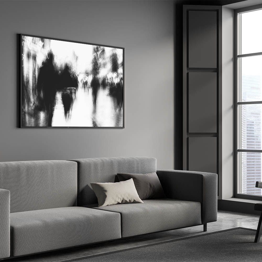 Capture the energy of city life with this modern urban landscape art piece. Featuring blurred silhouettes walking through a glowing street, this high-contrast black-and-white print transforms movement into abstract art.
