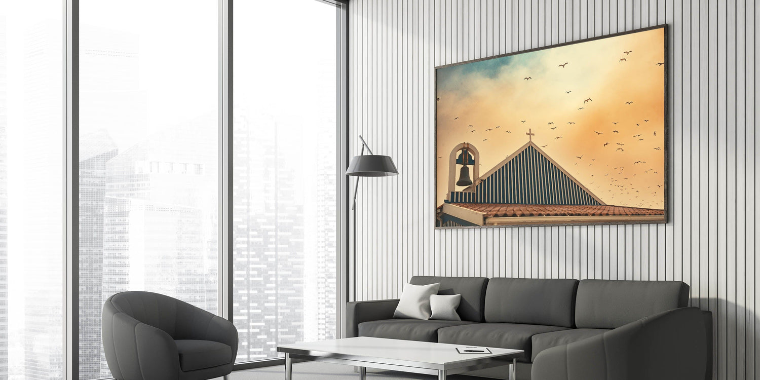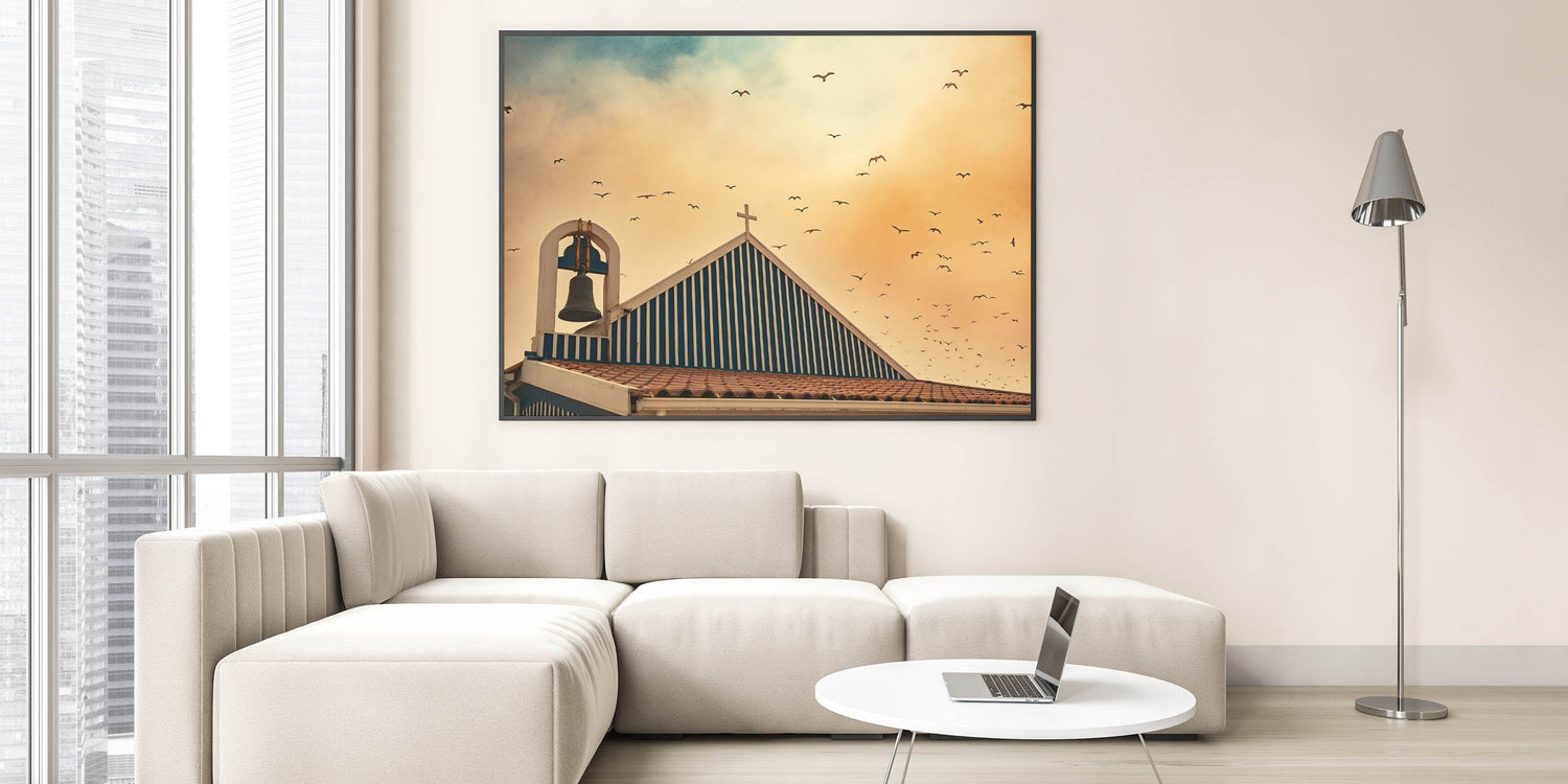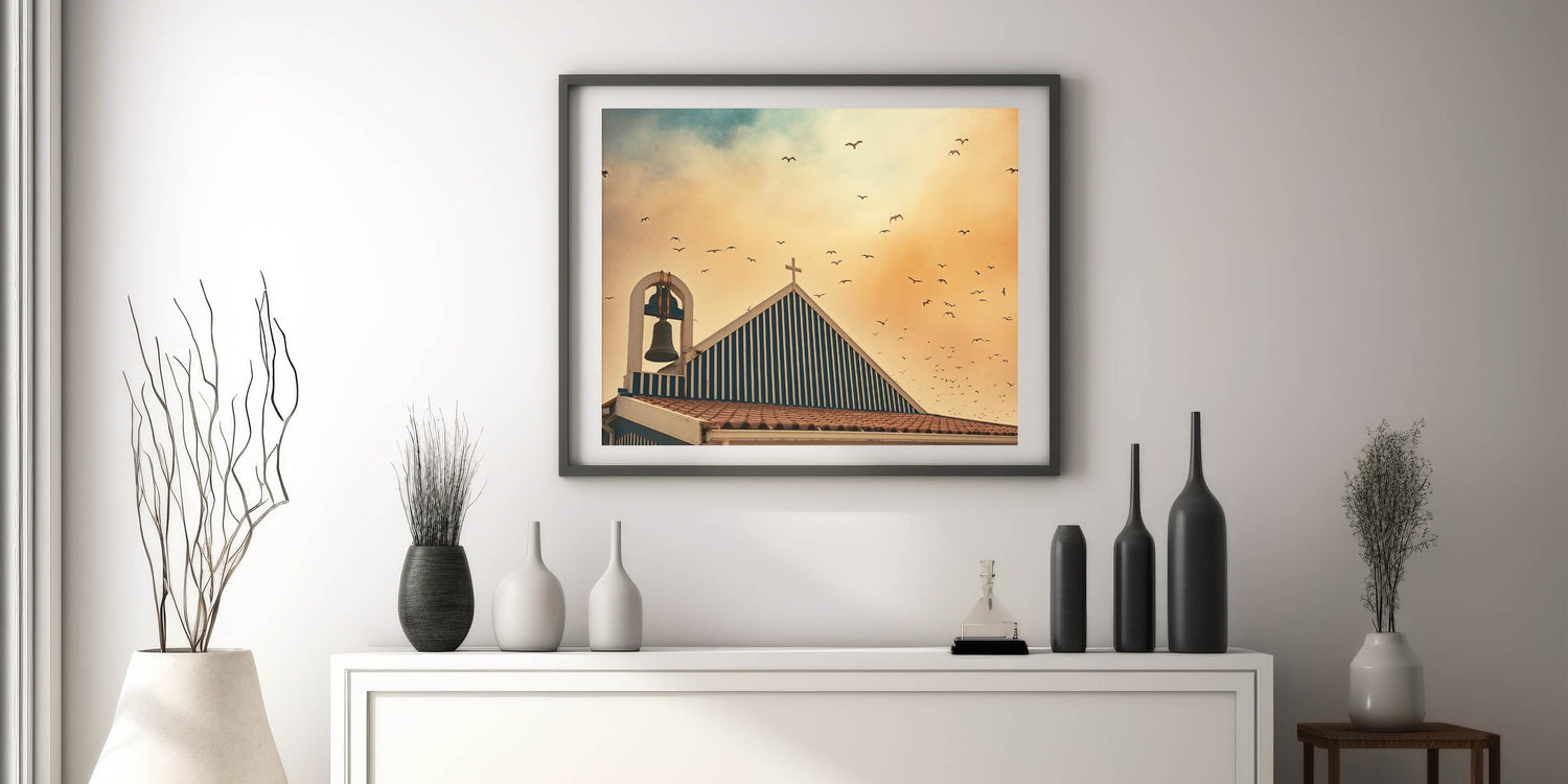 Capture serenity and contrast with this modern urban landscape art, showcasing a peaceful church rooftop beneath a vivid, color-soaked sky. Birds fly freely above the sharp lines of the striped architecture, blending human design with nature’s organic rhythm. The combination of warm golden tones and cool blues makes this piece visually compelling while maintaining a sense of calm and balance.