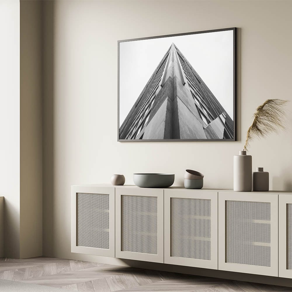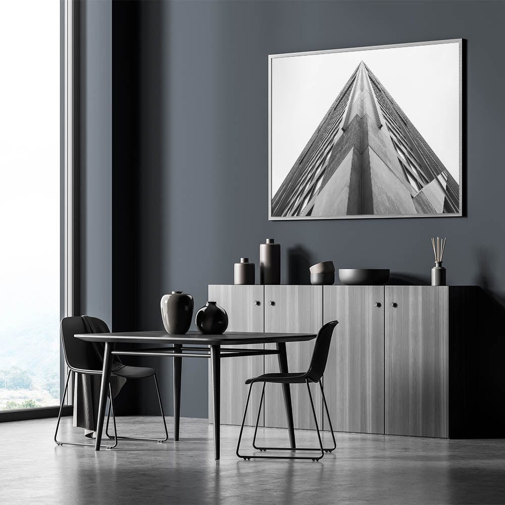 Celebrate the elegance of modern architecture with this striking urban architectural photography print. Captured from a low-angle perspective, this black-and-white image showcases the powerful geometry of a towering skyscraper, emphasizing its sharp lines and bold symmetry. This artwork is perfect for those who appreciate contemporary urban design and minimalist aesthetics.