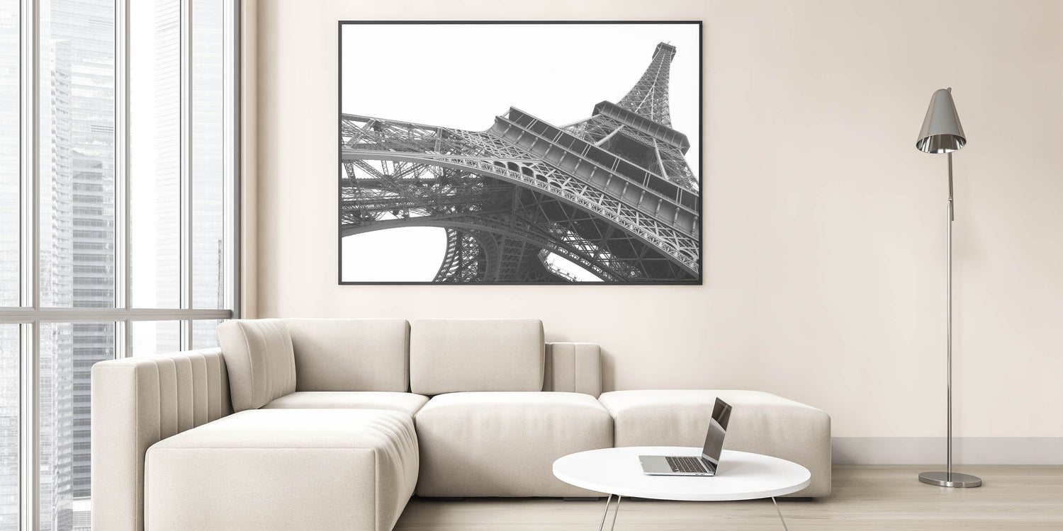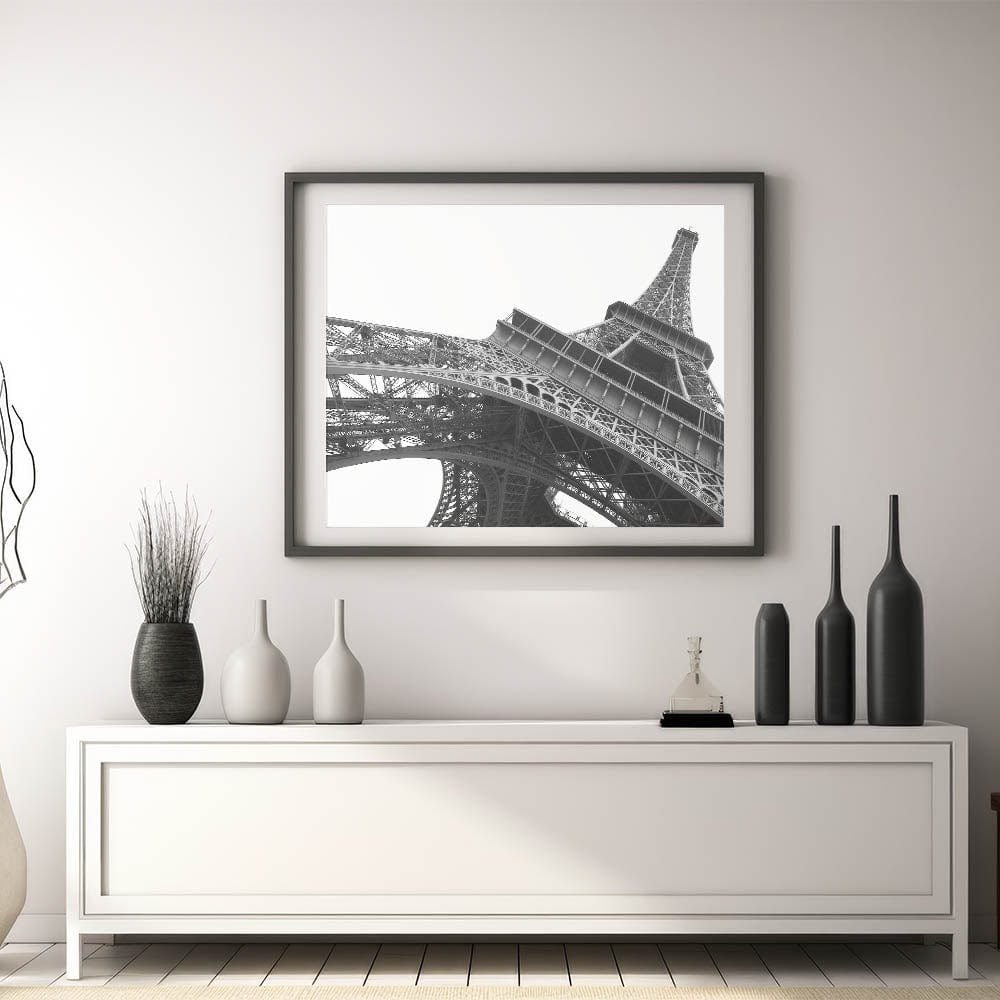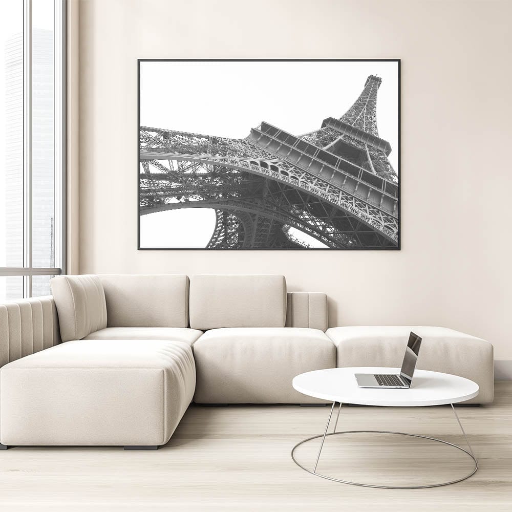 Celebrate the elegance of modern engineering with this urban architectural wall art, featuring a striking black-and-white perspective of the Eiffel Tower. The intricate metal framework and towering structure make this cityscape photography print a timeless and sophisticated statement piece for any space. The dynamic upward angle enhances the tower’s grandeur, capturing the beauty of Parisian architecture in a contemporary style.