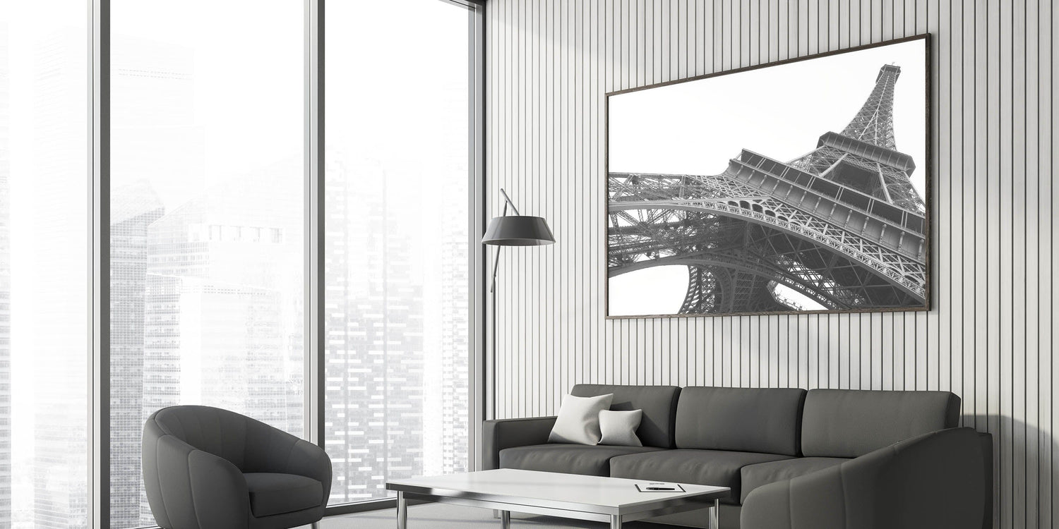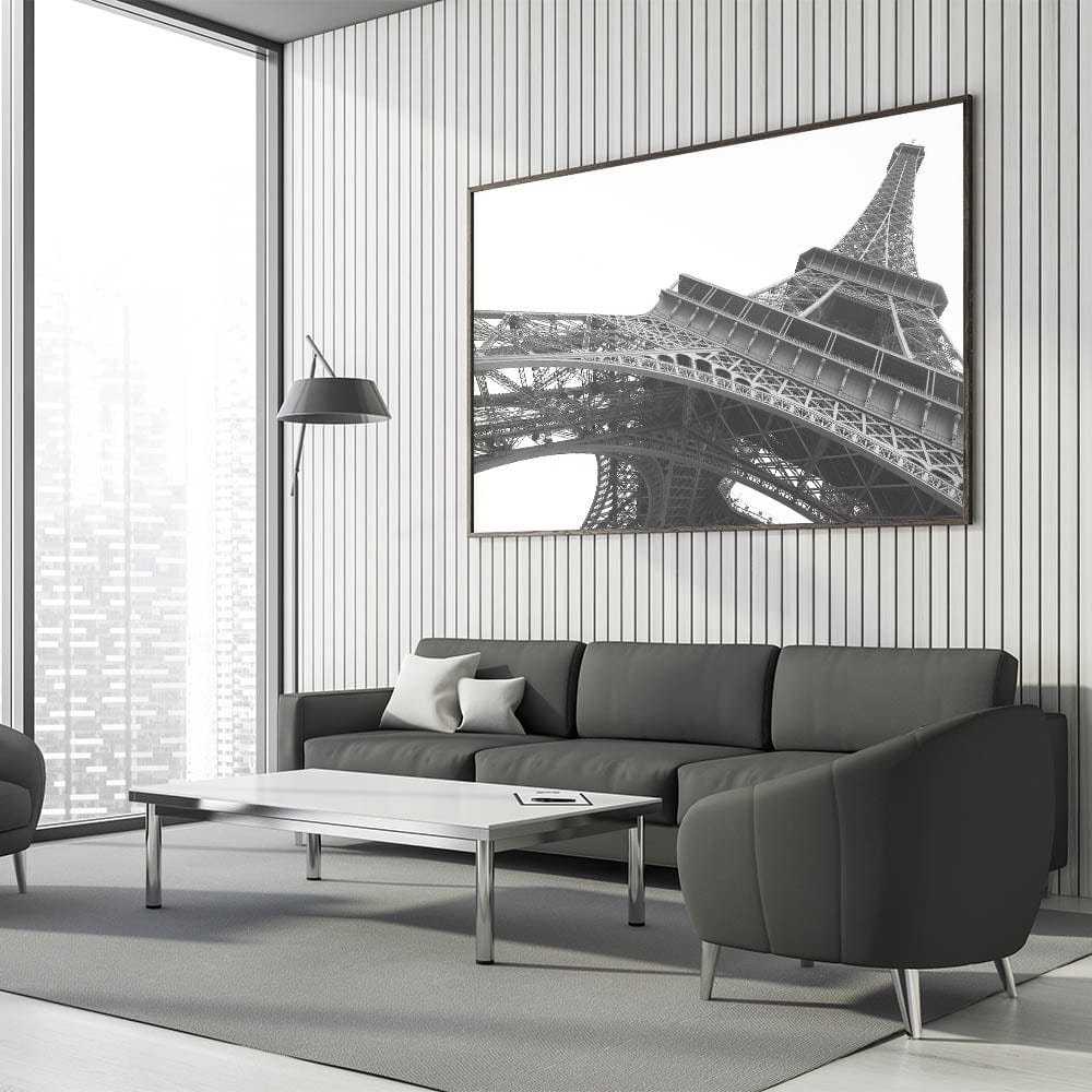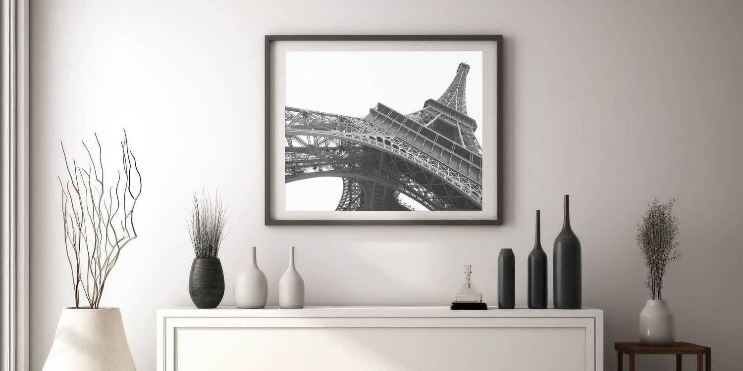 Celebrate the elegance of modern engineering with this urban architectural wall art, featuring a striking black-and-white perspective of the Eiffel Tower. The intricate metal framework and towering structure make this cityscape photography print a timeless and sophisticated statement piece for any space. The dynamic upward angle enhances the tower’s grandeur, capturing the beauty of Parisian architecture in a contemporary style.