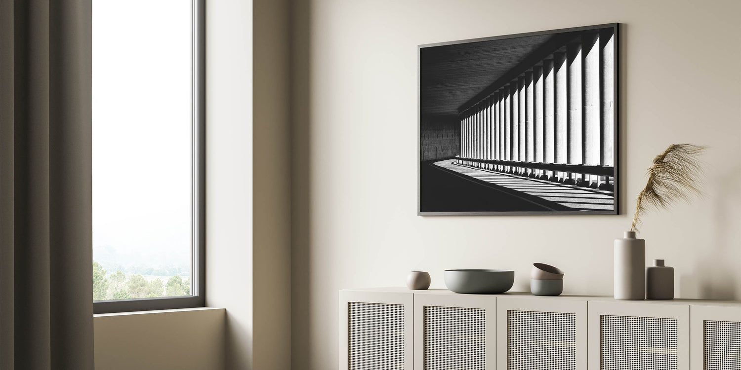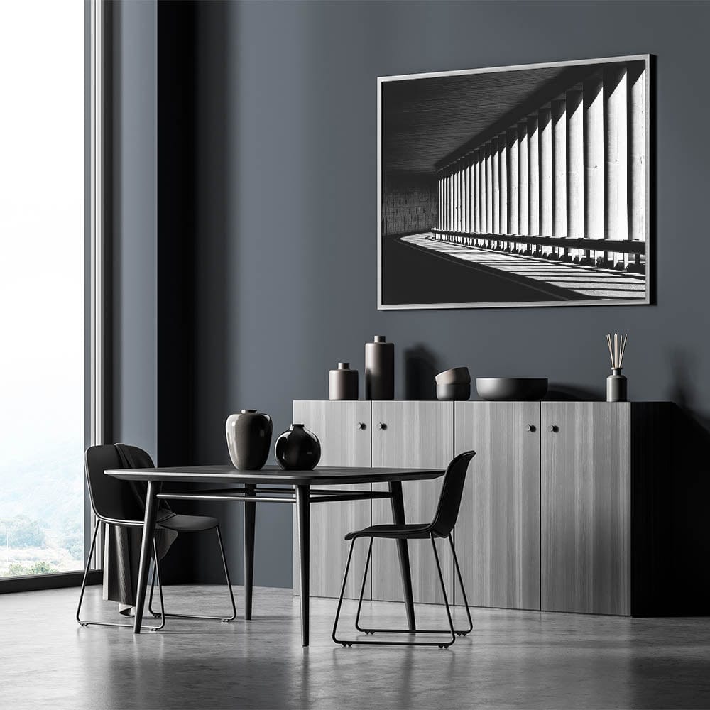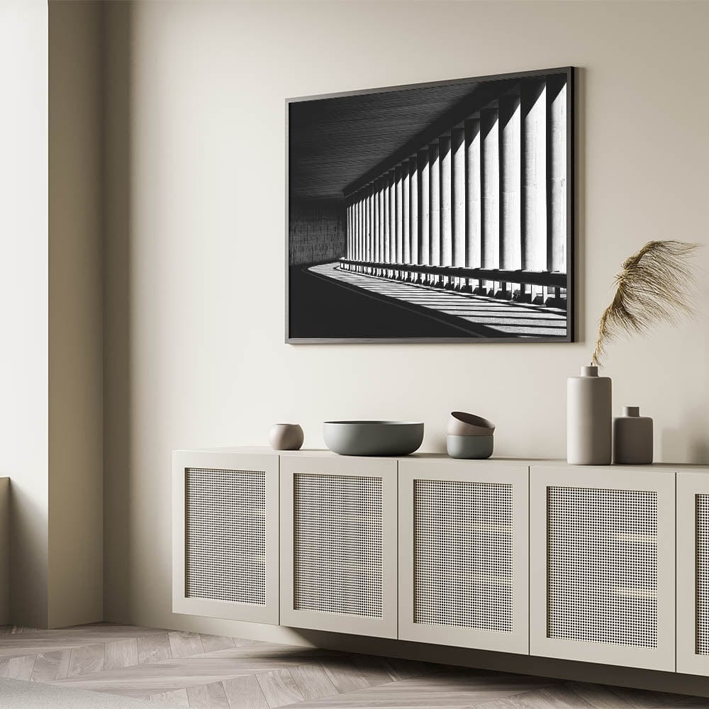 Experience the beauty of geometric design and light play with this stunning urban architectural wall art. Featuring a series of concrete columns casting dramatic shadows, this high-contrast black-and-white composition captures the essence of modern architecture. The sleek symmetry and bold contrast make it an ideal statement piece for contemporary interiors.