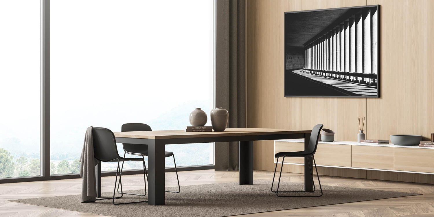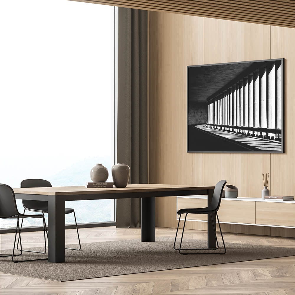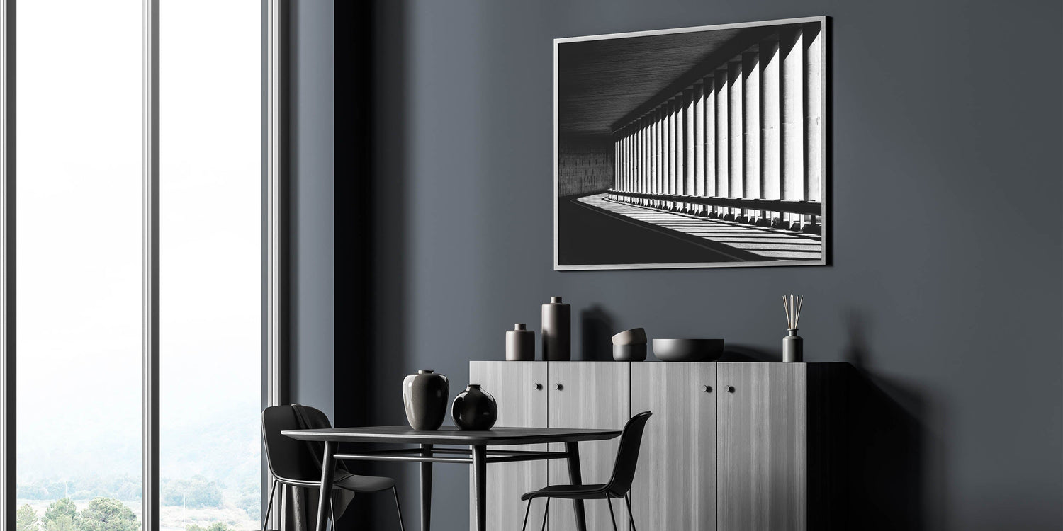 Experience the beauty of geometric design and light play with this stunning urban architectural wall art. Featuring a series of concrete columns casting dramatic shadows, this high-contrast black-and-white composition captures the essence of modern architecture. The sleek symmetry and bold contrast make it an ideal statement piece for contemporary interiors.