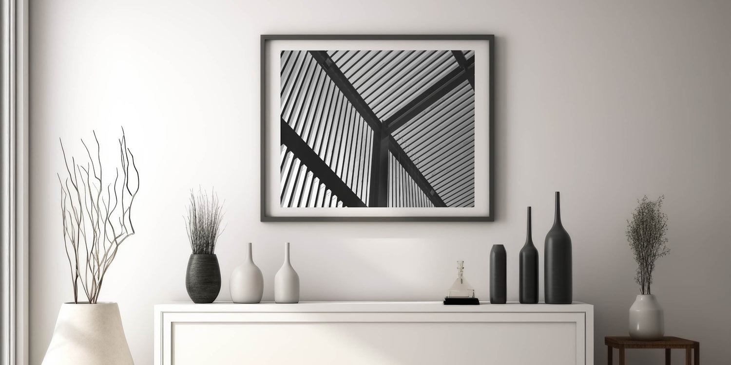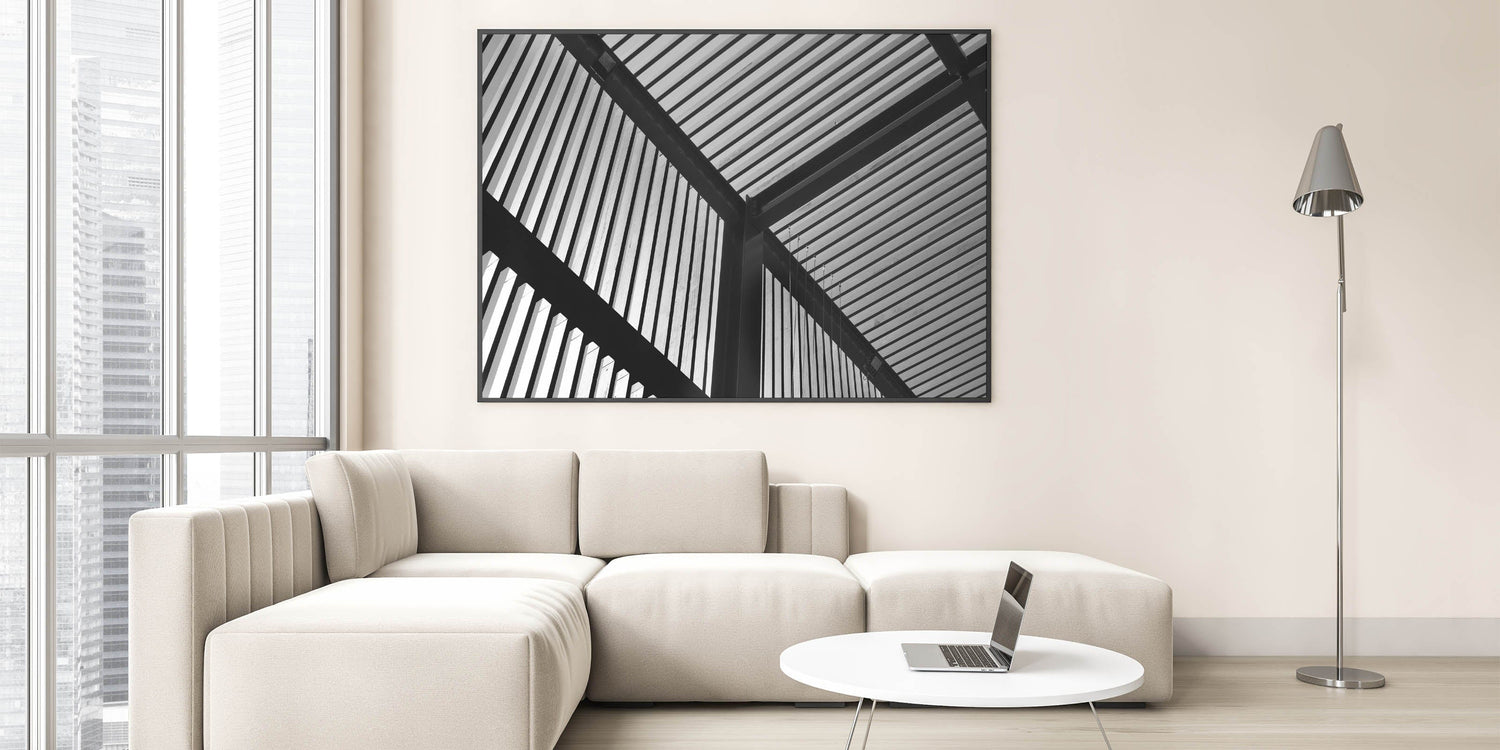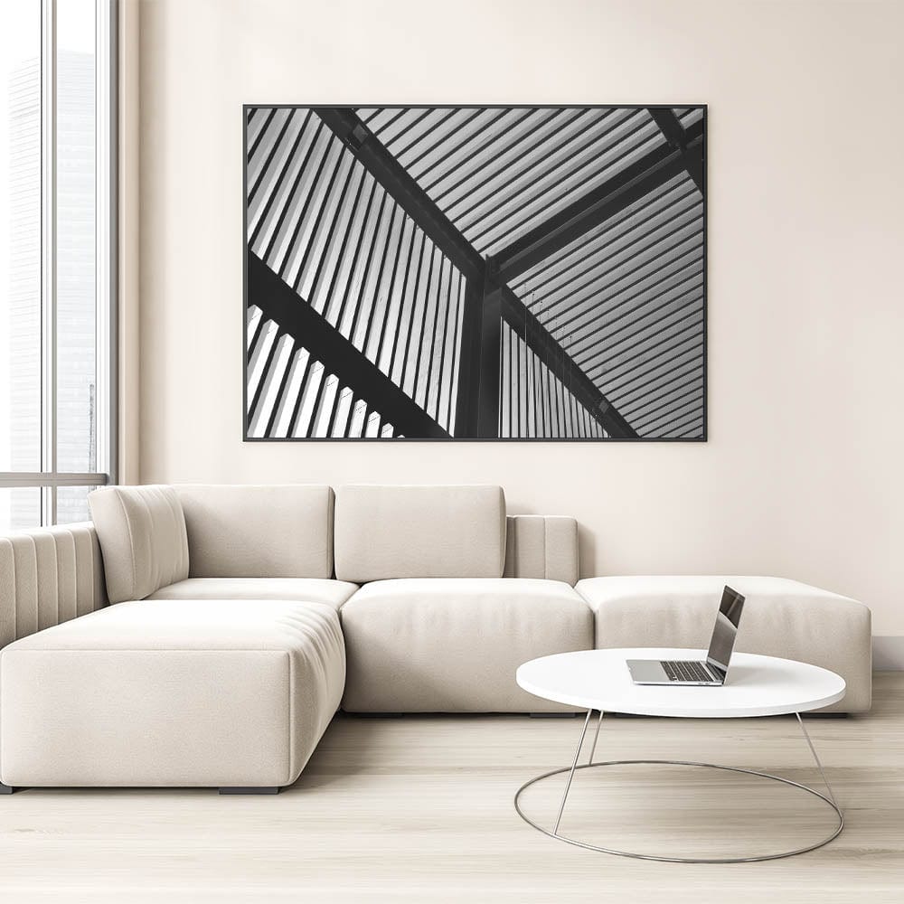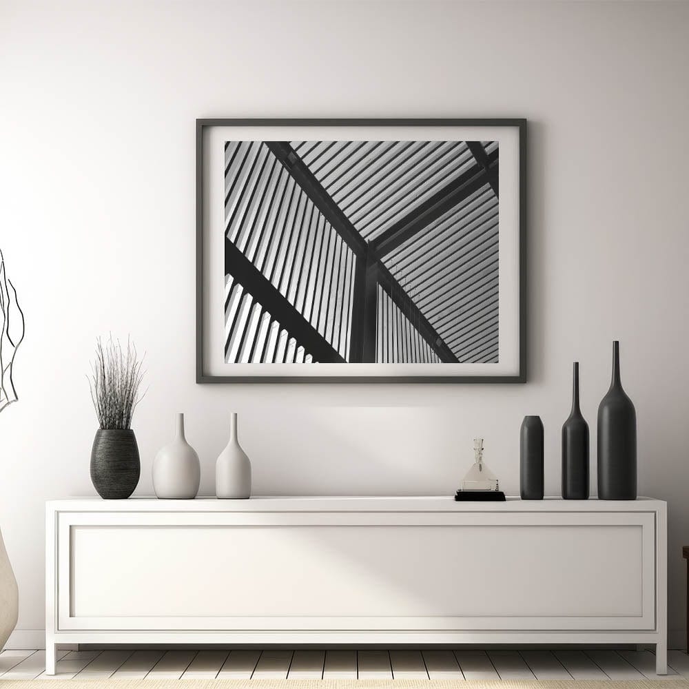 Celebrate the beauty of structure and symmetry with this stunning urban architectural wall art. Featuring a striking black-and-white perspective of a geometric ceiling design, this modern cityscape photography print captures the interplay of light, shadow, and form, making it an ideal statement piece for contemporary interiors.