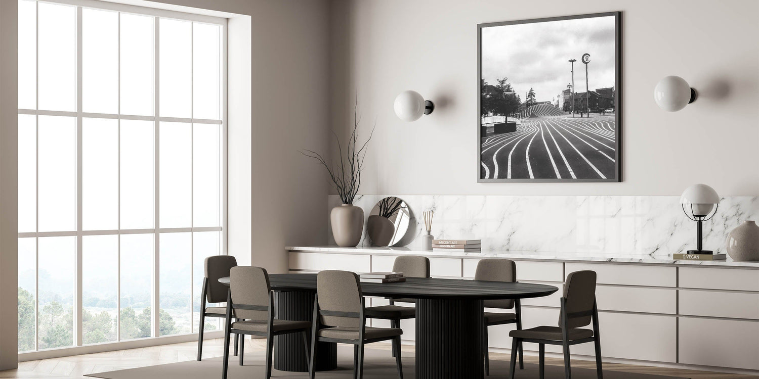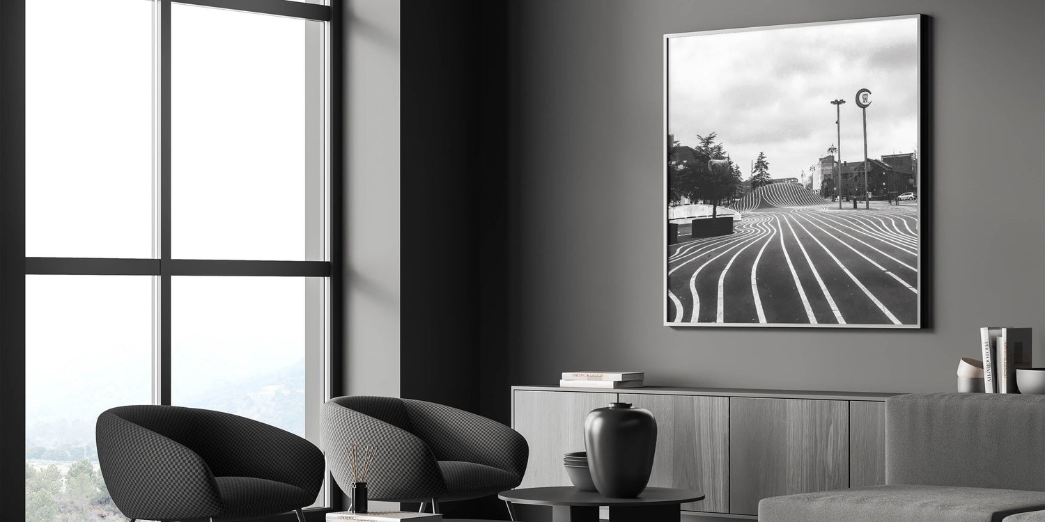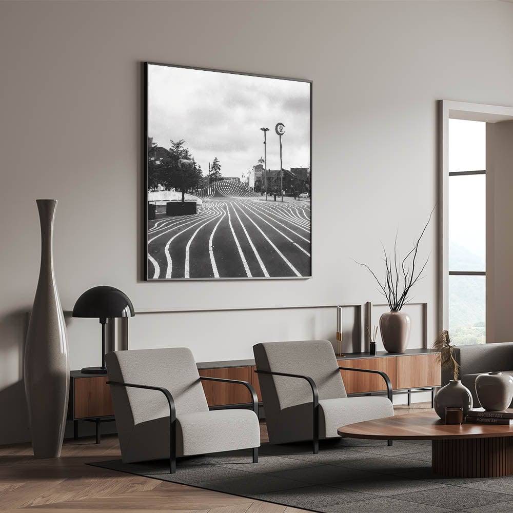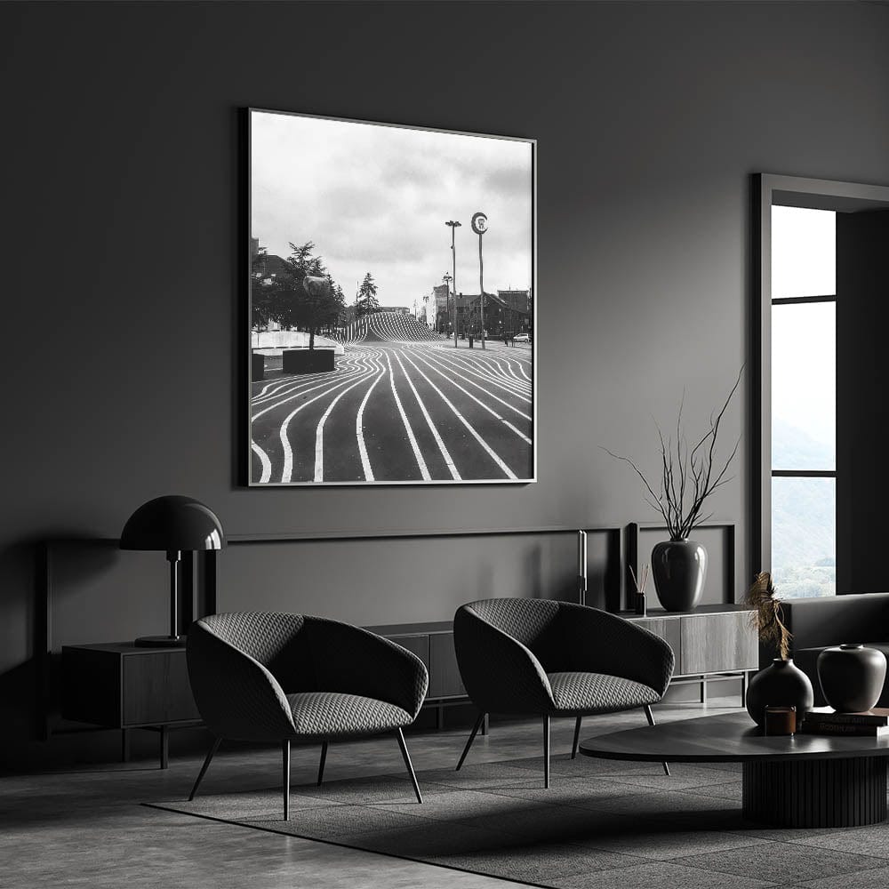 Add a touch of modern abstraction to your space with this urban landscape photography decor. Capturing a surreal city scene with bold, flowing white lines against dark pavement, this high-quality urban photography print blends contemporary architecture with artistic street design. The black-and-white composition enhances the striking contrast, making it a unique statement piece for any interior.