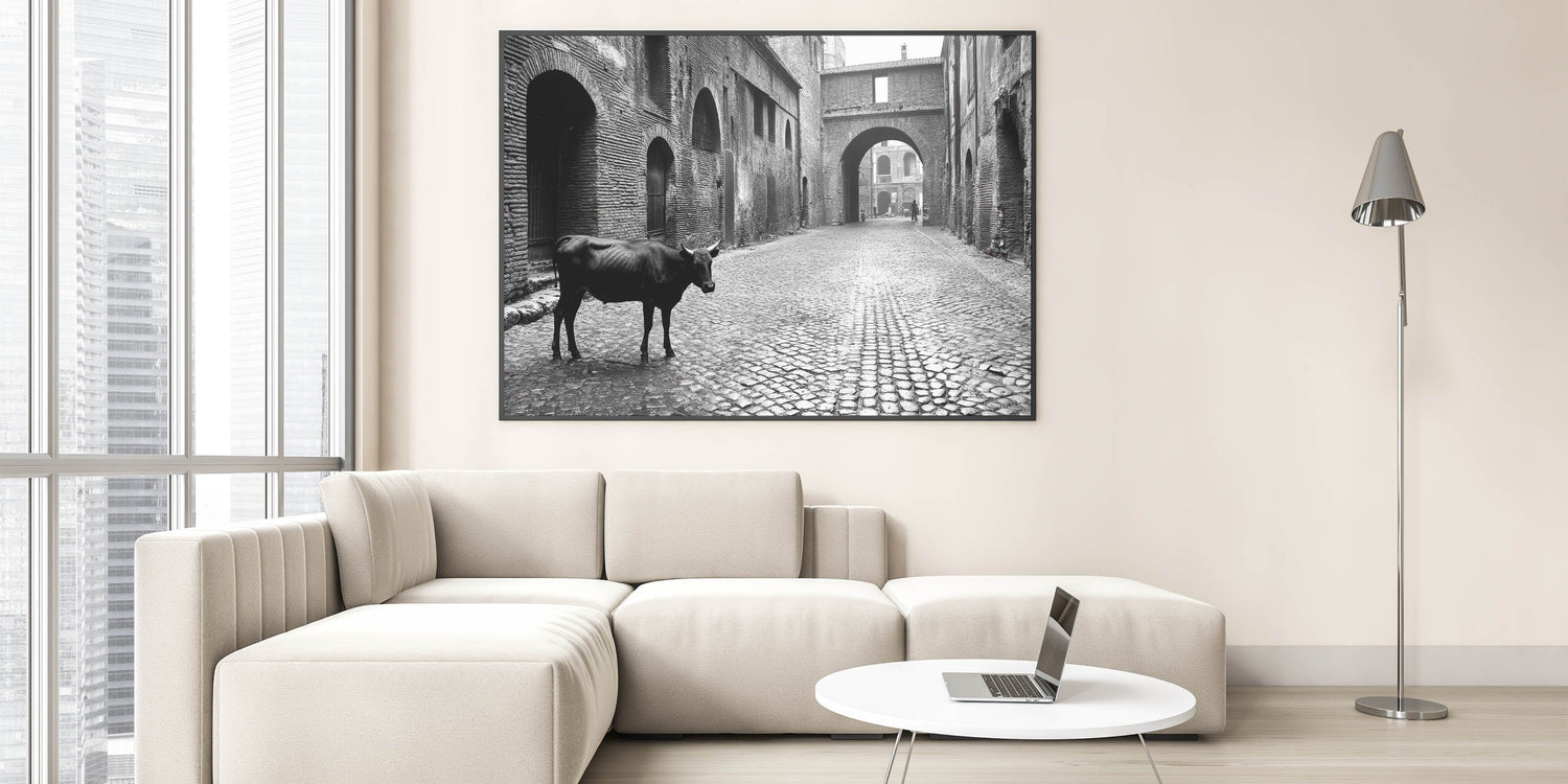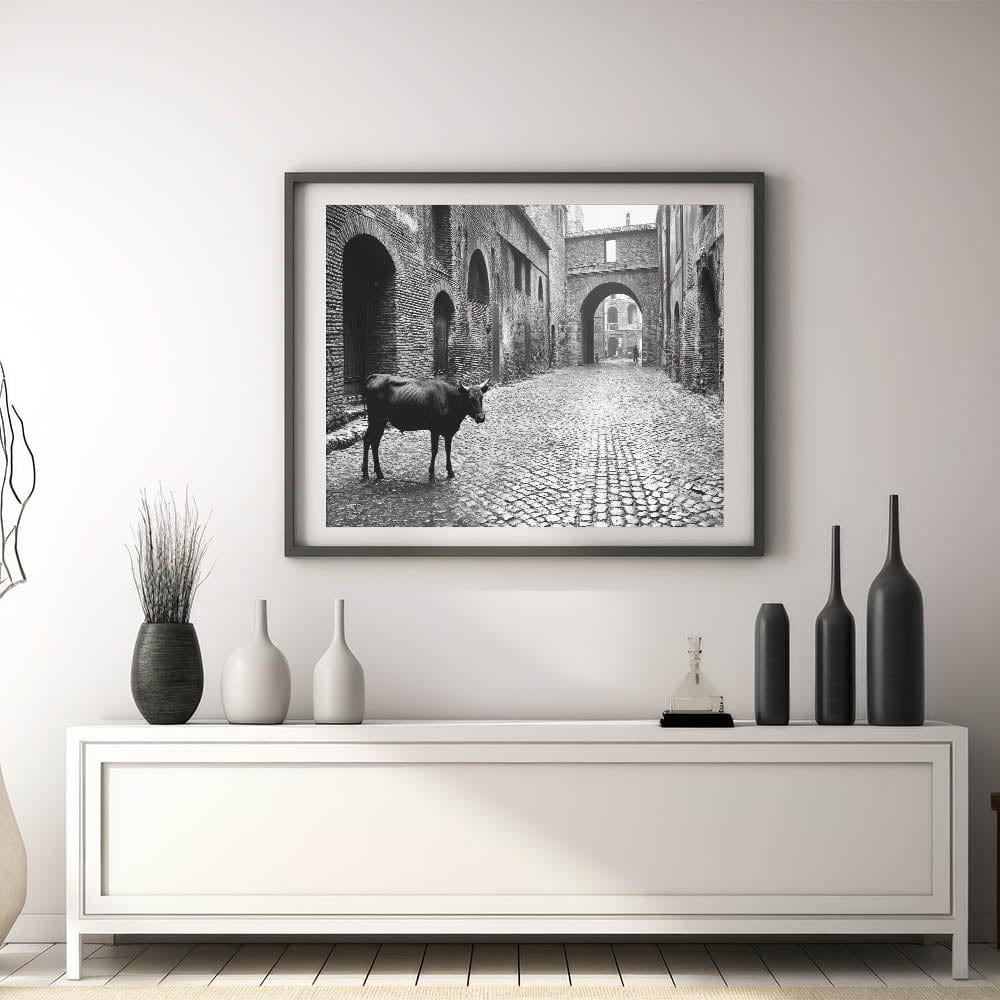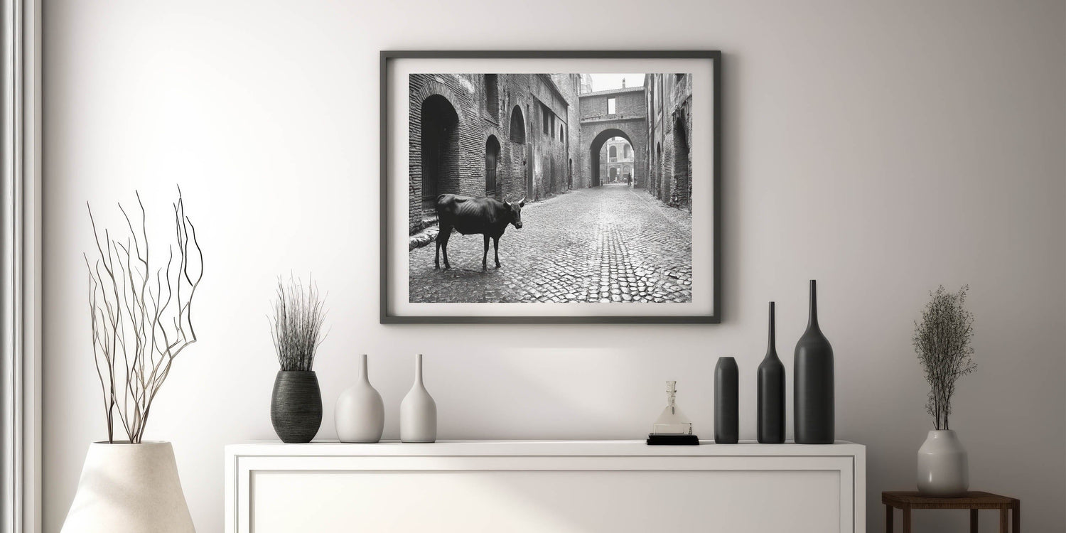 Bring a touch of history and character to your space with this urban landscape photography decor piece. Capturing an old cobblestone street with a lone cow standing in the foreground, this metropolitan photography art blends rustic charm with an urban aesthetic. The black-and-white composition enhances the textures of aged brick walls, archways, and stone pathways, making it a unique and timeless statement piece.