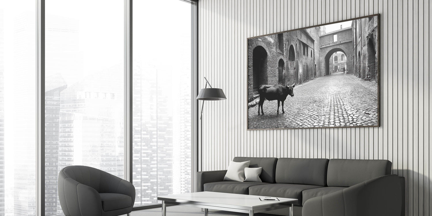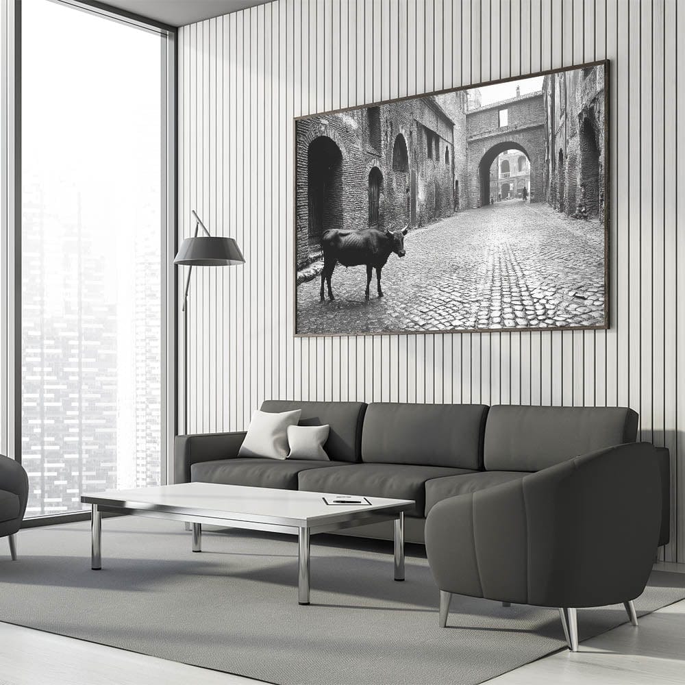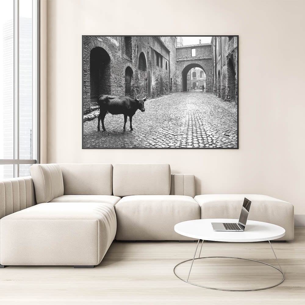 Bring a touch of history and character to your space with this urban landscape photography decor piece. Capturing an old cobblestone street with a lone cow standing in the foreground, this metropolitan photography art blends rustic charm with an urban aesthetic. The black-and-white composition enhances the textures of aged brick walls, archways, and stone pathways, making it a unique and timeless statement piece.