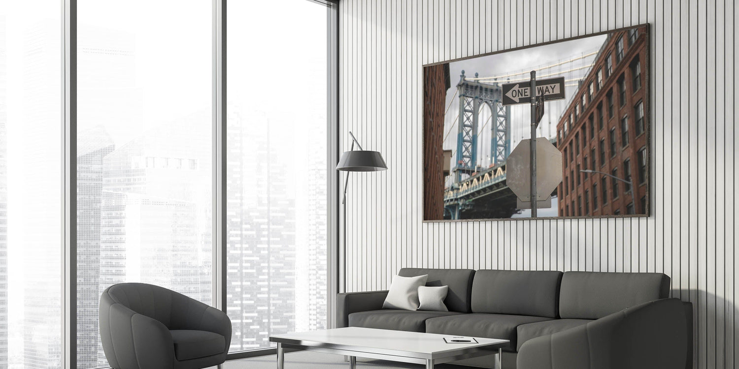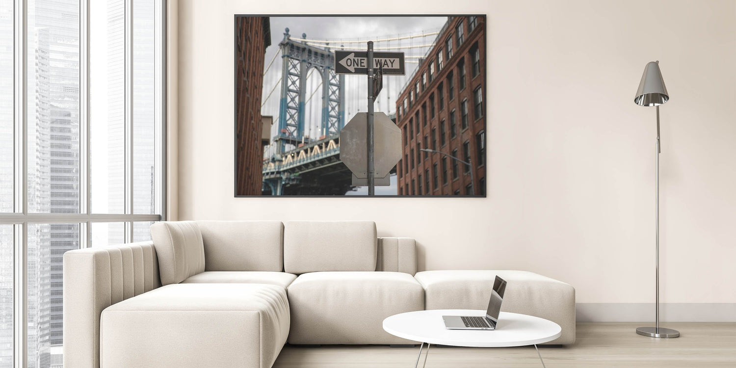 Channel the essence of the urban environment with this urban scenery wall art featuring an iconic city bridge framed between red-brick buildings and a one-way street sign. The photograph captures the raw geometry, grit, and historic character of a metropolitan scene, where past and present coexist in steel, stone, and direction. Perfect for those who appreciate the subtle beauty of structured city life.