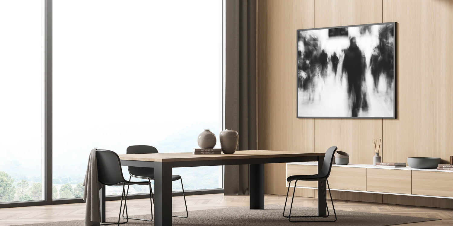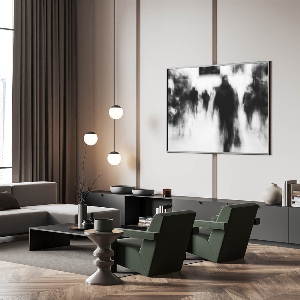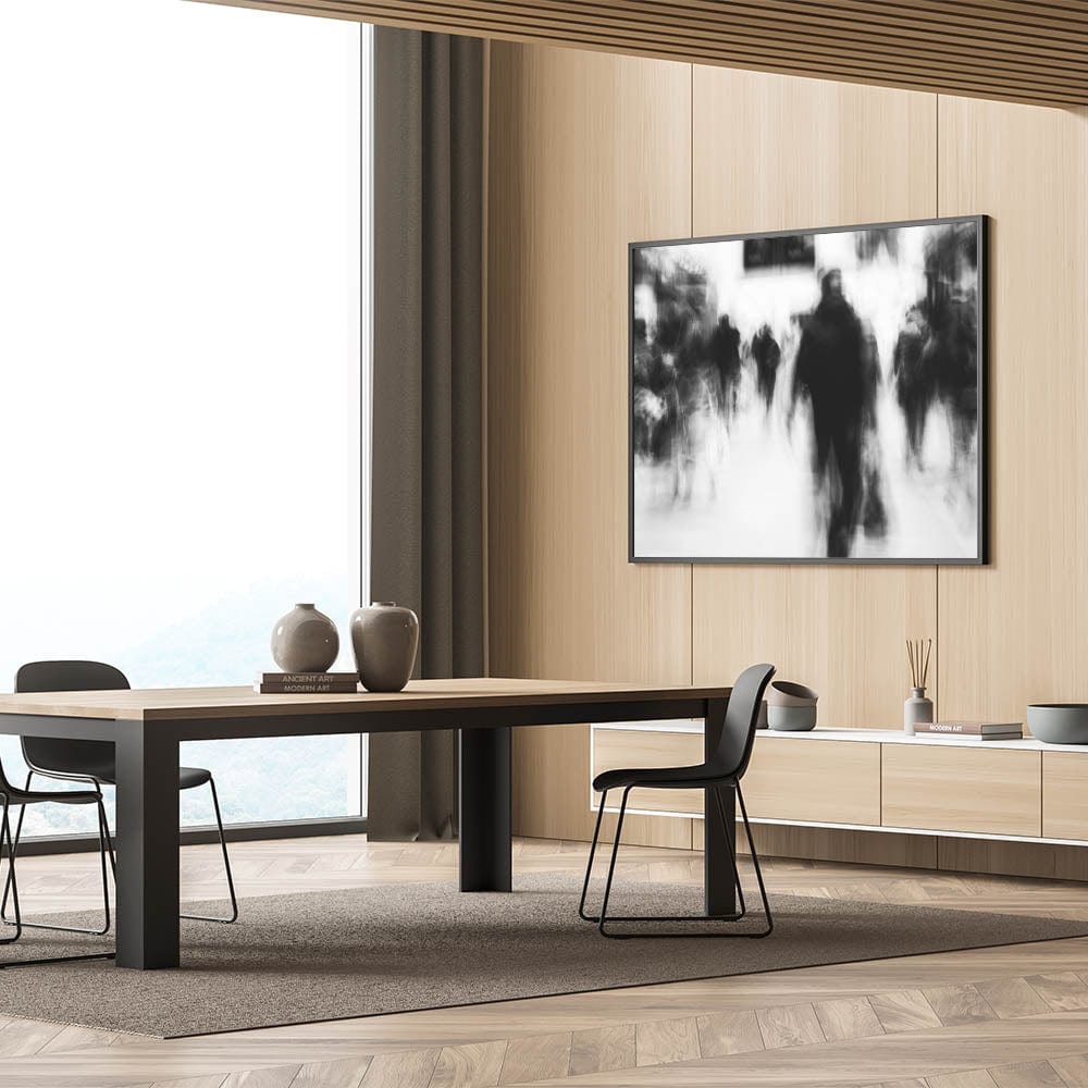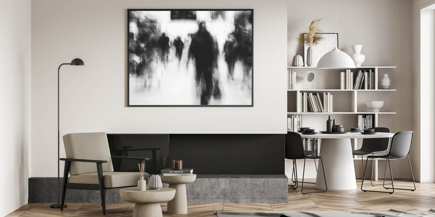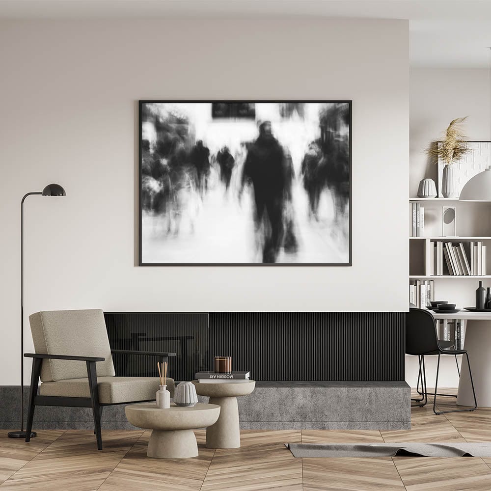 Immerse yourself in the rhythm of the city with this captivating urban skyline canvas print. Featuring blurred silhouettes navigating through a crowded street, this high-contrast black-and-white artwork captures the movement and energy of metropolitan life.