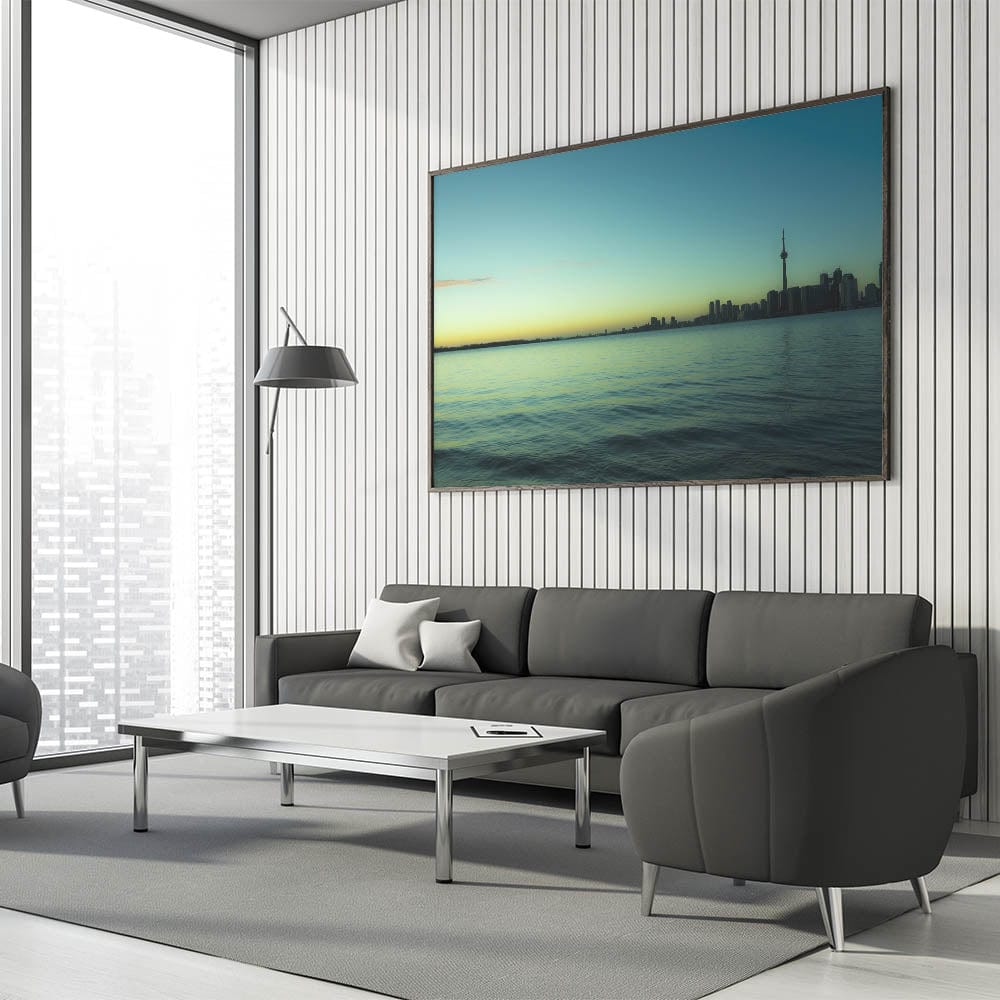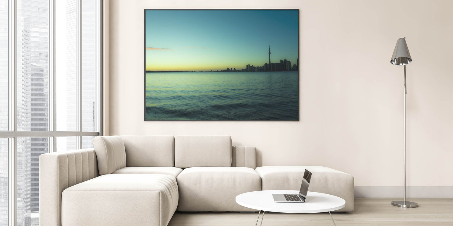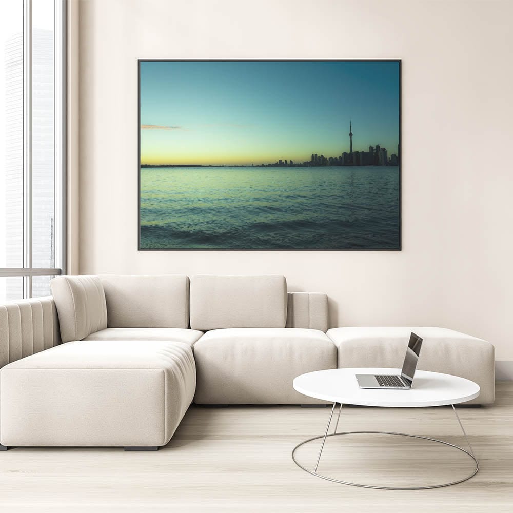 Capture the beauty of city and nature merging with this urban skyline canvas print, featuring a serene waterfront and a silhouetted skyline against a soft sunset. The modern cityscape wall art composition showcases a tranquil yet vibrant atmosphere, perfect for bringing a calming yet sophisticated urban aesthetic into your space. The gradient sky and gentle water reflections make this piece a stunning focal point.