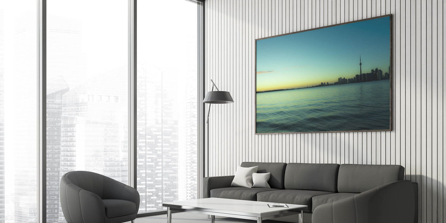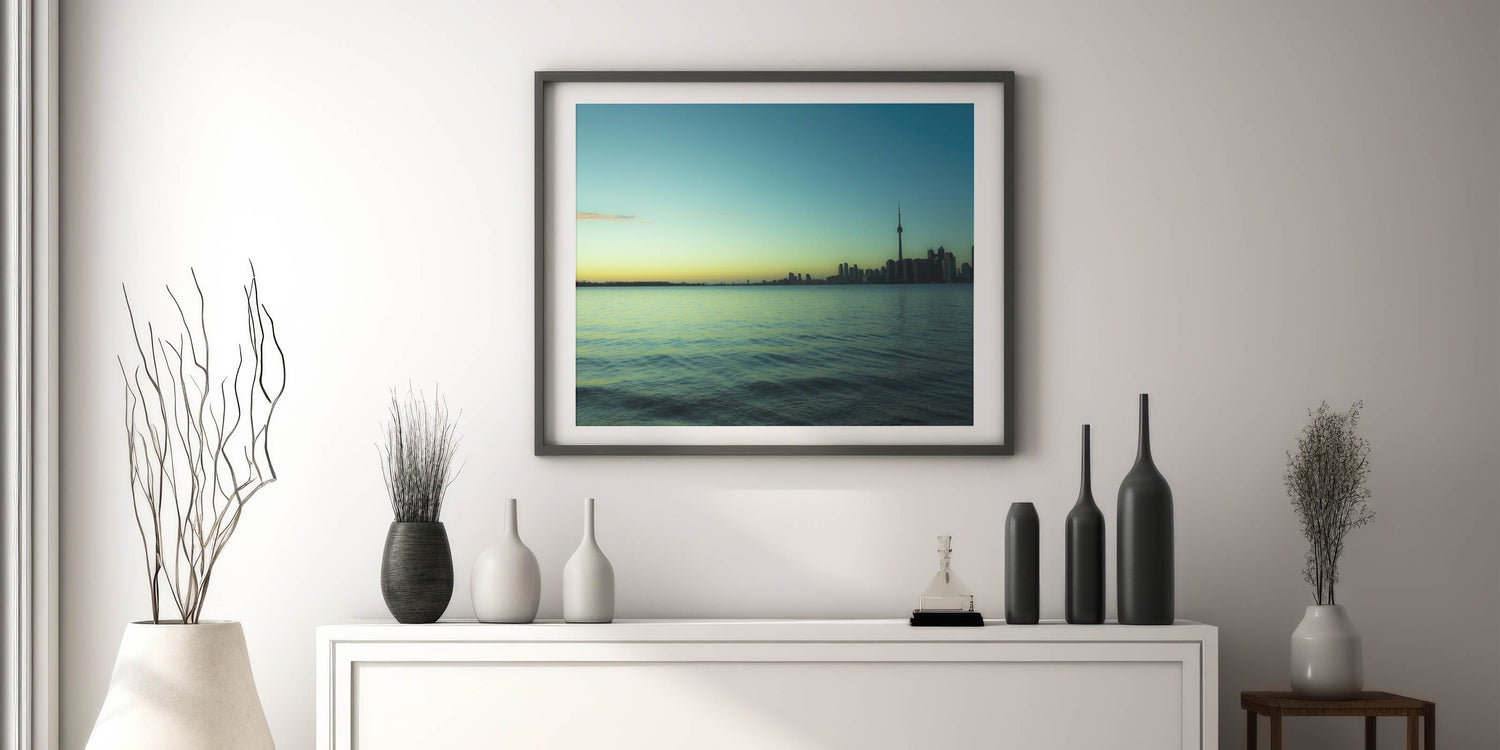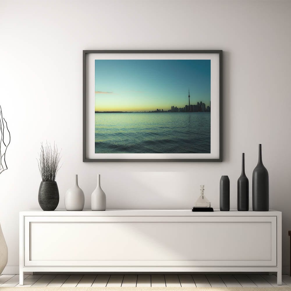 Capture the beauty of city and nature merging with this urban skyline canvas print, featuring a serene waterfront and a silhouetted skyline against a soft sunset. The modern cityscape wall art composition showcases a tranquil yet vibrant atmosphere, perfect for bringing a calming yet sophisticated urban aesthetic into your space. The gradient sky and gentle water reflections make this piece a stunning focal point.