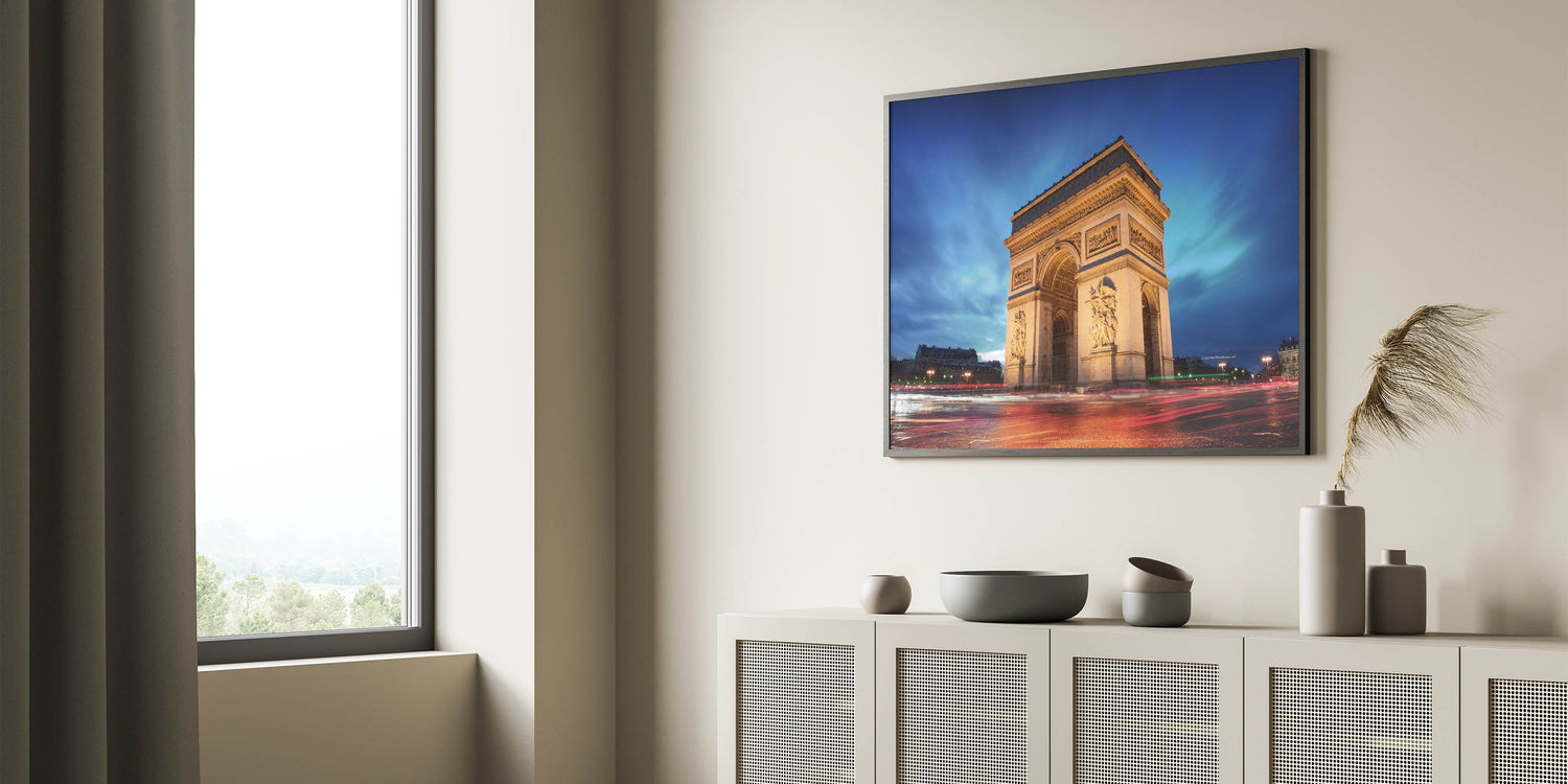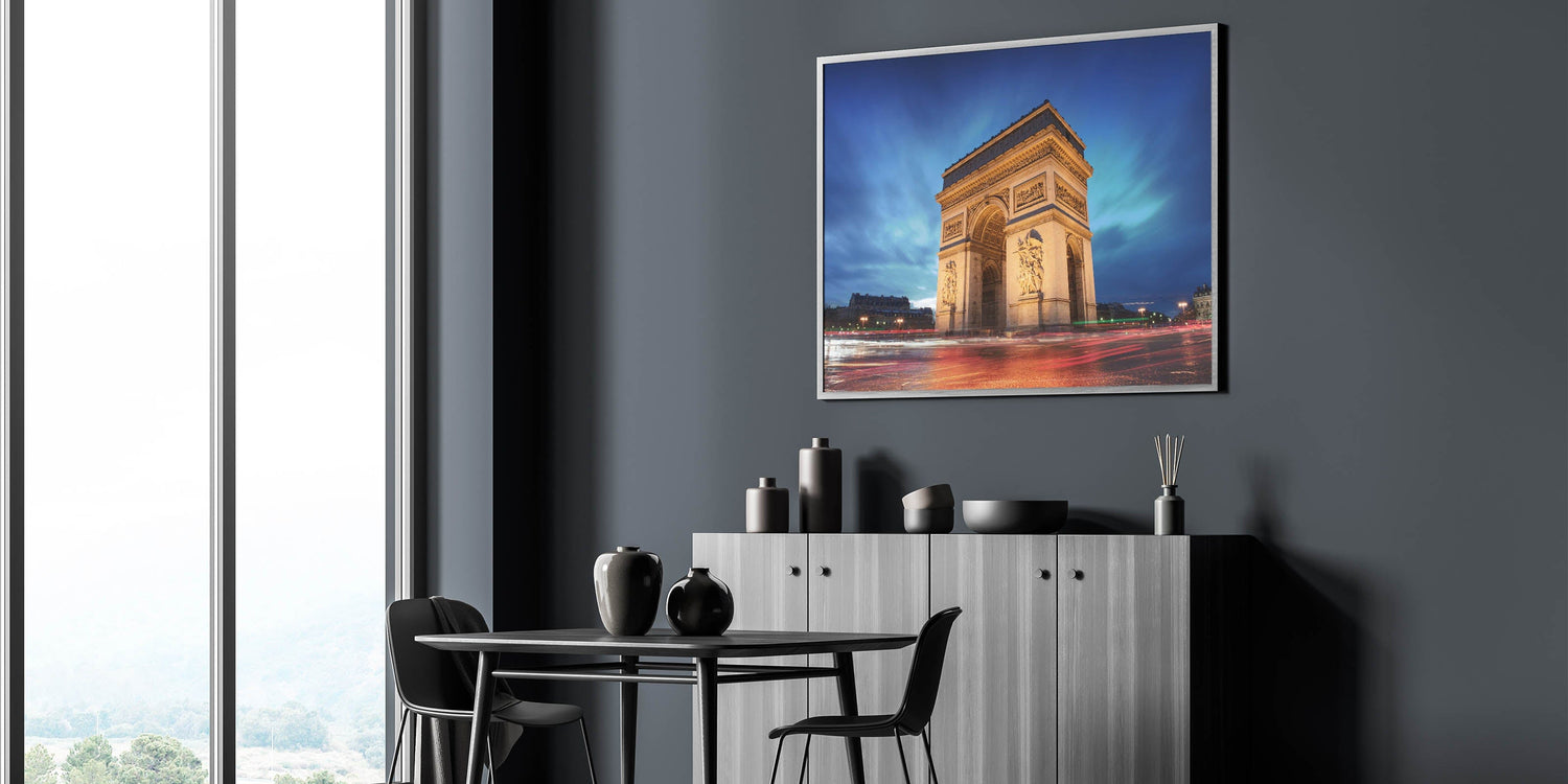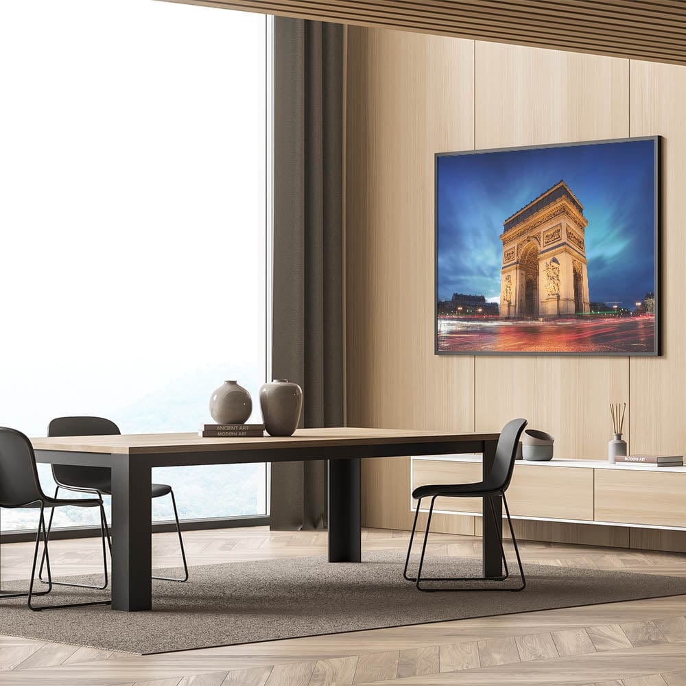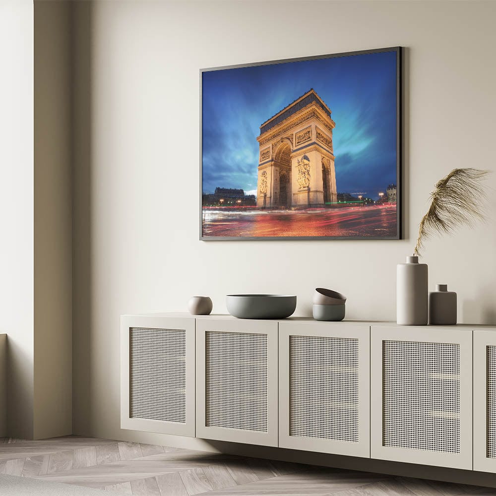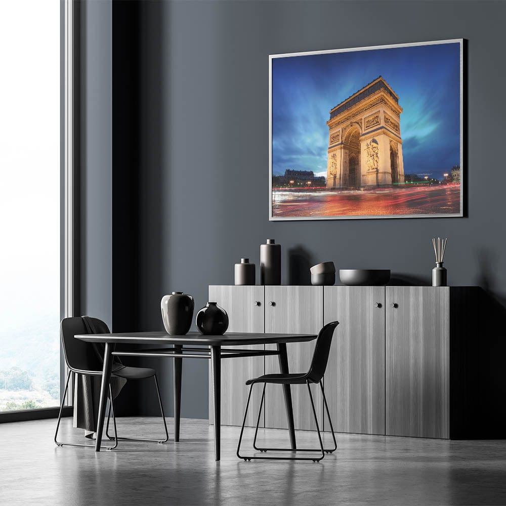 Bring the charm of Paris into your space with this breathtaking urban skyline canvas print, featuring the iconic Arc de Triomphe against a vibrant evening sky. The fusion of historic architecture, glowing city lights, and dynamic motion trails creates an exquisite blend of past and present, making this piece a perfect addition to any modern decor.