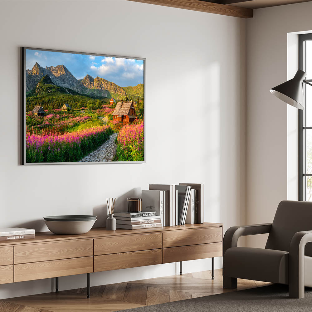 Transport yourself to a tranquil mountain retreat with this charming mountain village wall art. This captivating artwork features a peaceful valley surrounded by rugged mountains, where quaint wooden cabins are nestled amidst vibrant wildflowers. The warm light of the setting sun bathes the scene in a golden glow, highlighting the natural beauty of the landscape and the rustic charm of the village.