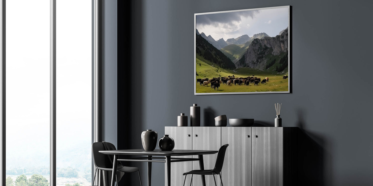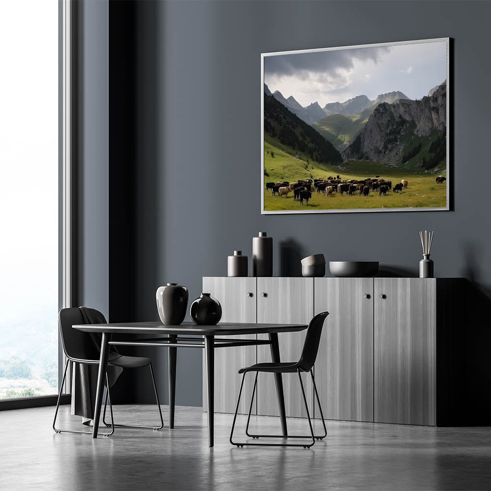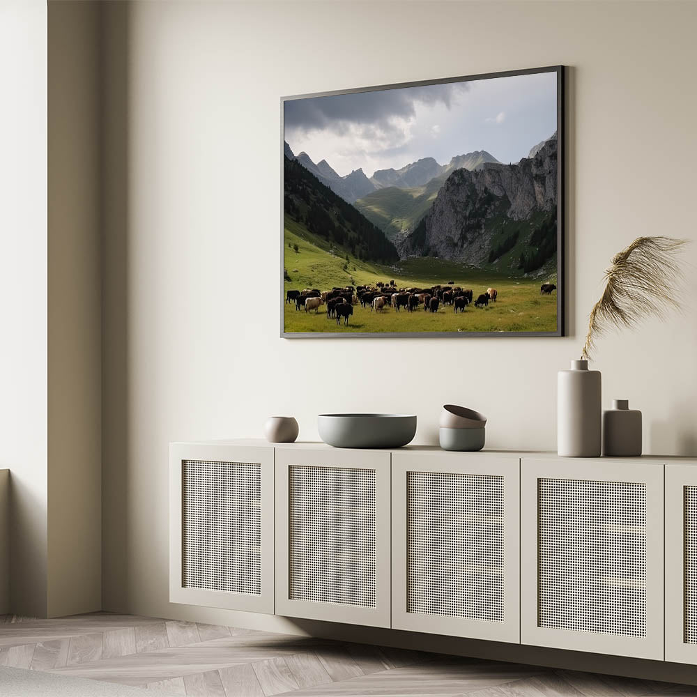 Experience the rugged beauty of nature with this striking mountain valley landscape wall art. The artwork showcases a herd of cattle peacefully grazing in a lush, green valley surrounded by majestic mountains. The play of light and shadow across the rolling hills and the dramatic sky overhead adds depth and drama to the scene, making this piece a perfect addition to any nature lover’s decor.