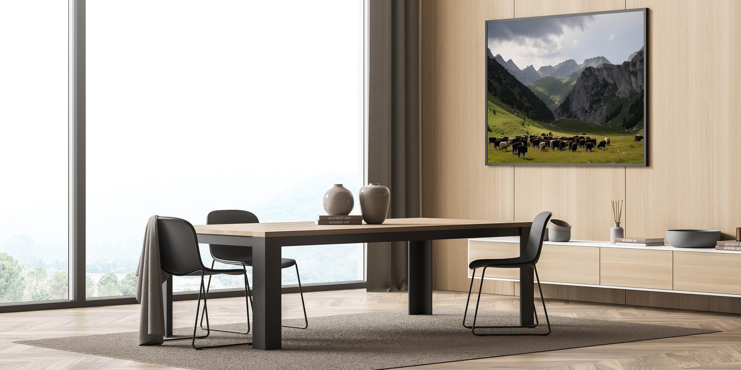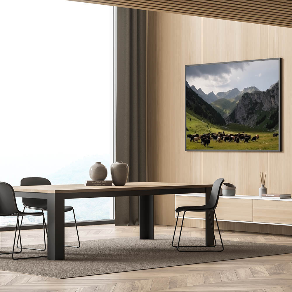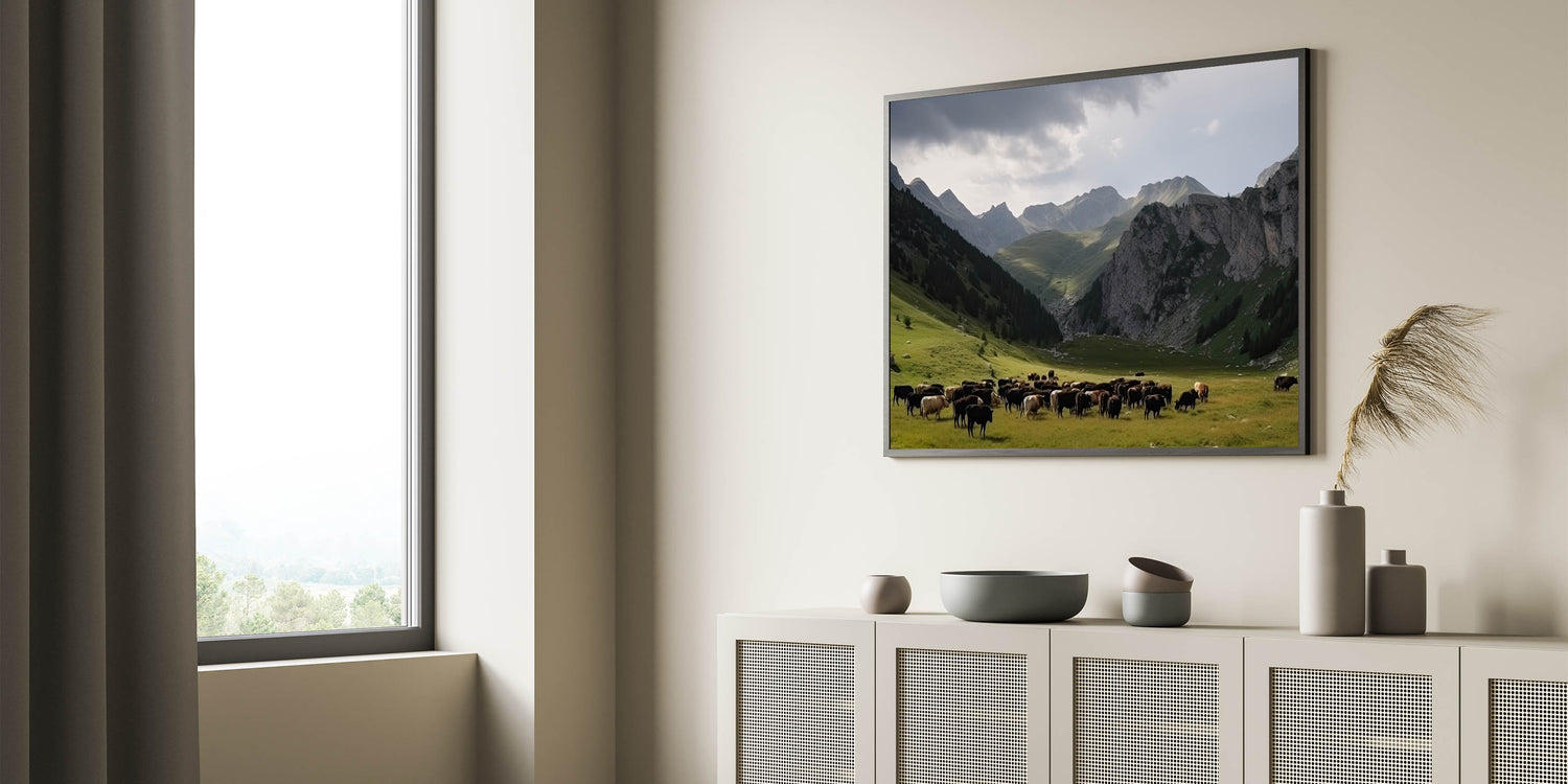 Experience the rugged beauty of nature with this striking mountain valley landscape wall art. The artwork showcases a herd of cattle peacefully grazing in a lush, green valley surrounded by majestic mountains. The play of light and shadow across the rolling hills and the dramatic sky overhead adds depth and drama to the scene, making this piece a perfect addition to any nature lover’s decor.