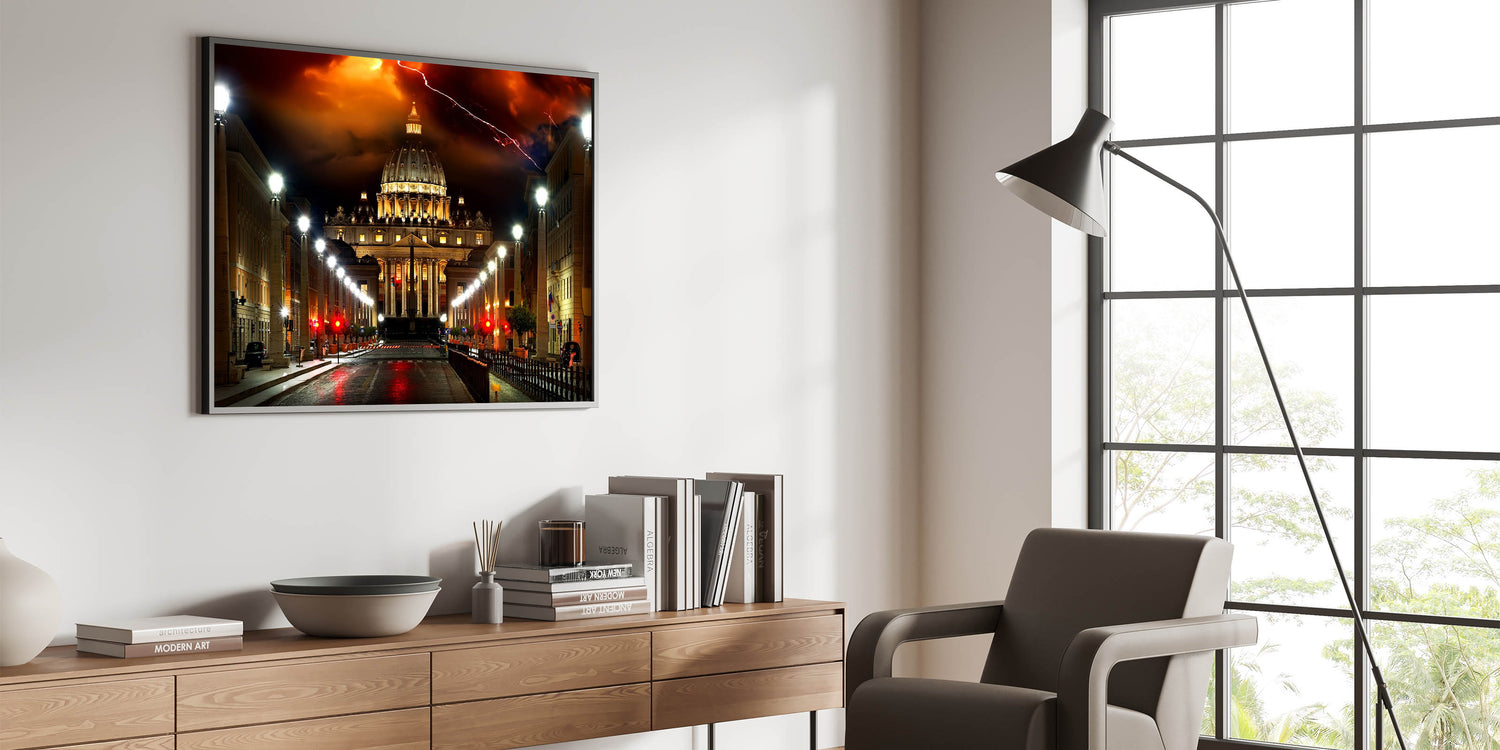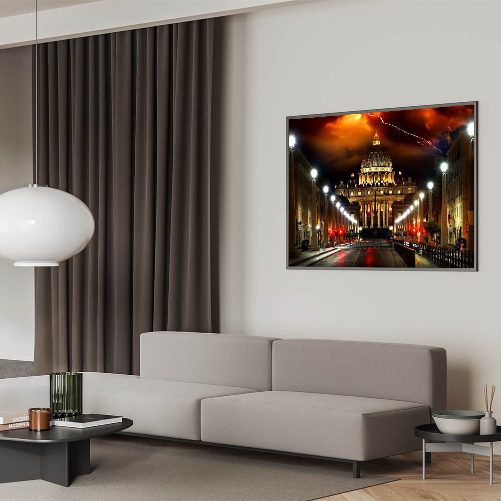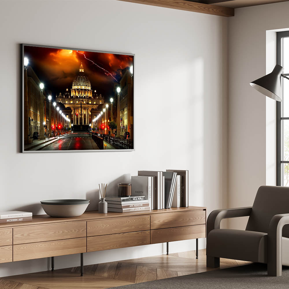 This high-quality print combines the timeless beauty of St. Peter’s Basilica with an electrifying atmosphere, making it a standout addition to any space. Whether you're looking to make a bold statement or enhance your decor with a piece of European scenery wall art, this artwork is the perfect choice.