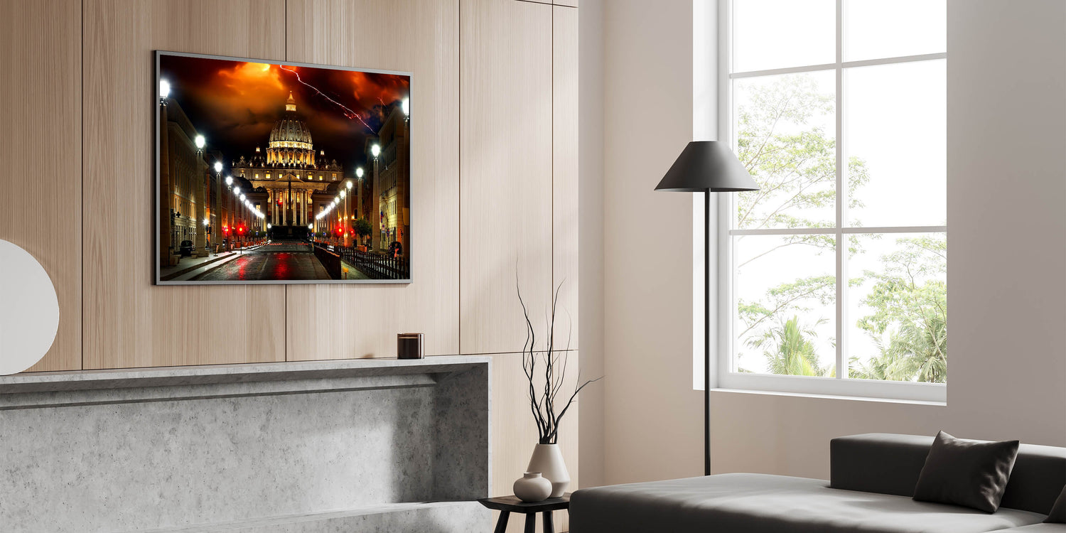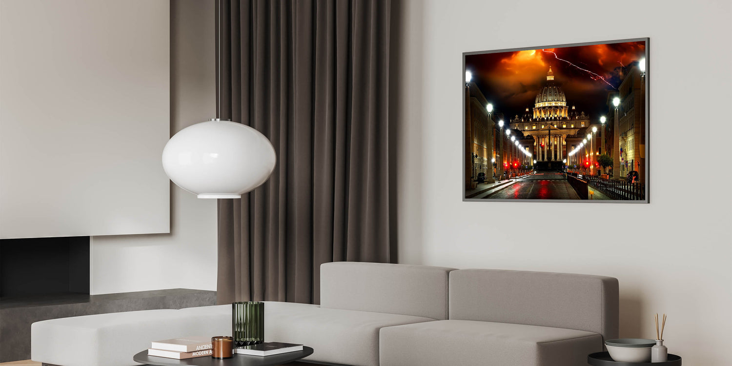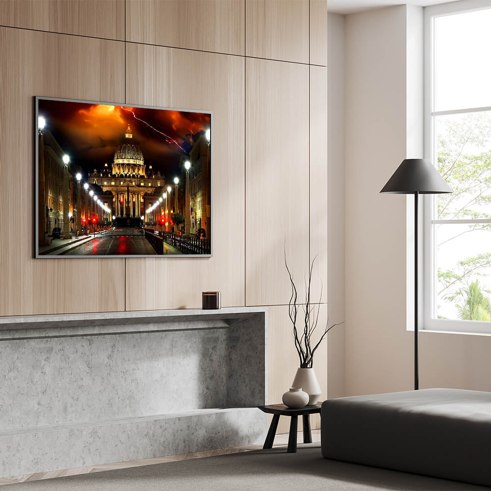 This high-quality print combines the timeless beauty of St. Peter’s Basilica with an electrifying atmosphere, making it a standout addition to any space. Whether you're looking to make a bold statement or enhance your decor with a piece of European scenery wall art, this artwork is the perfect choice.