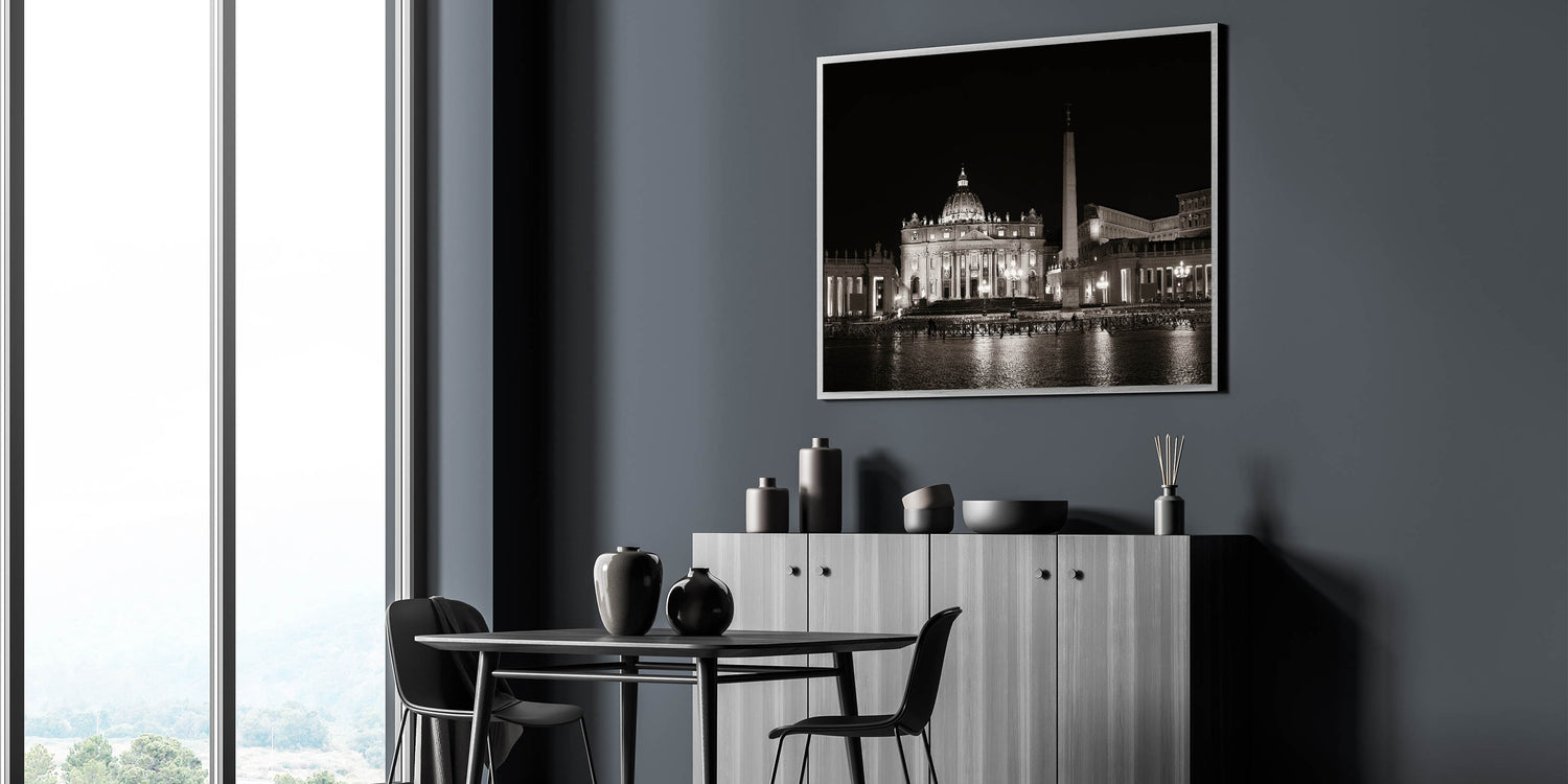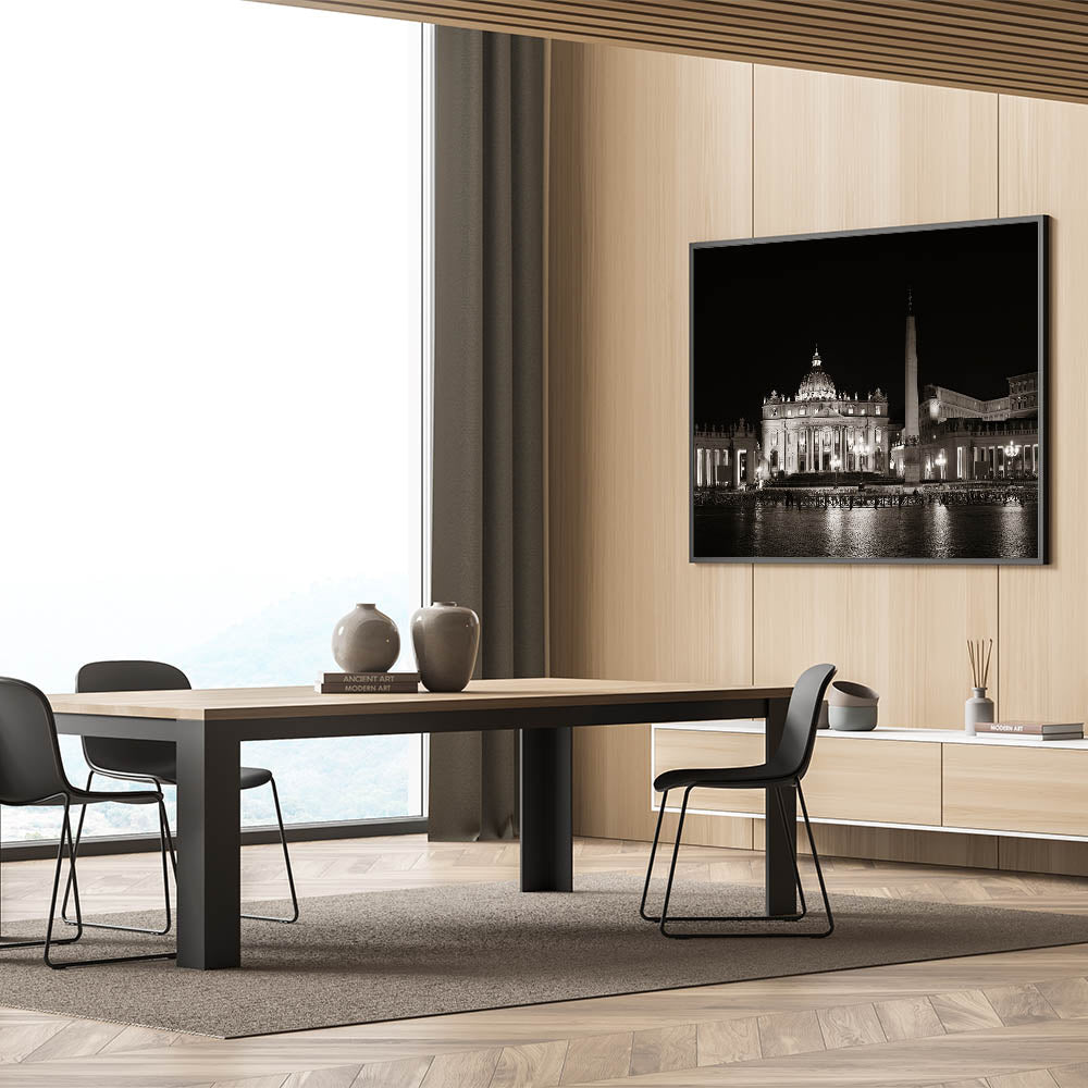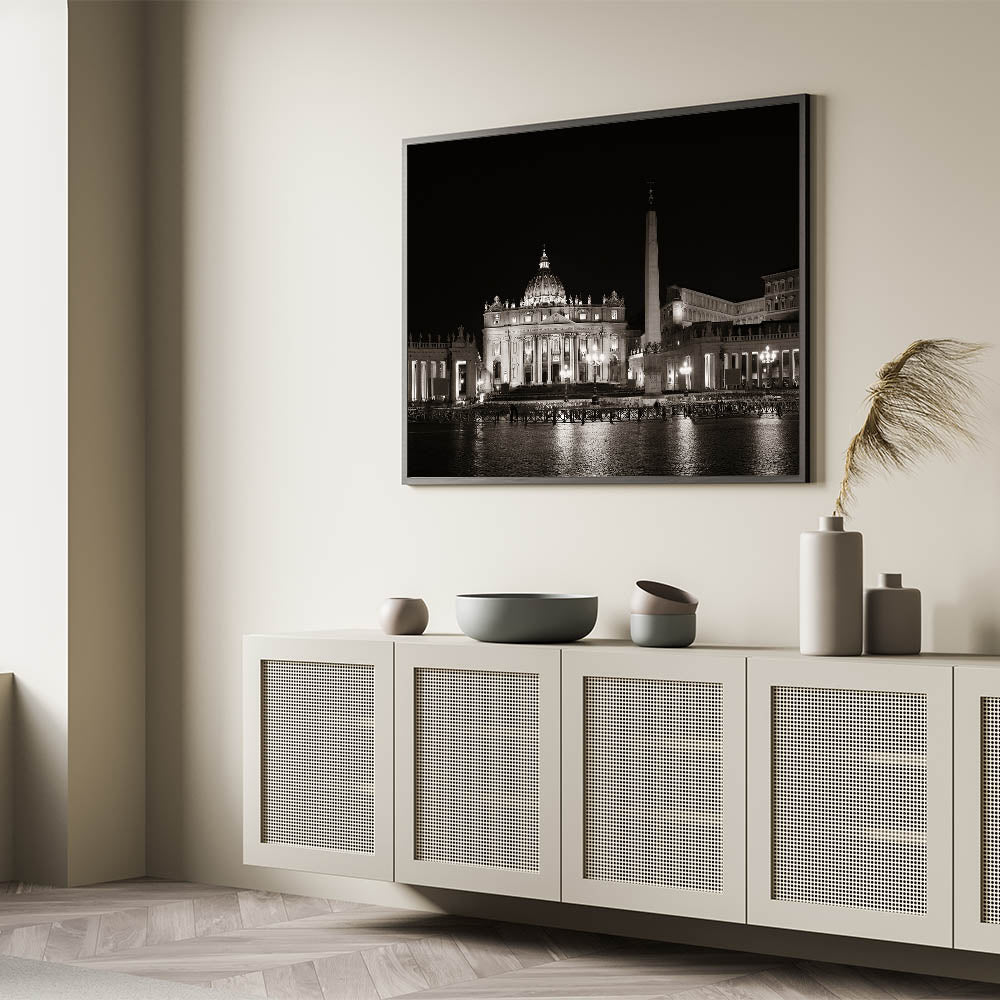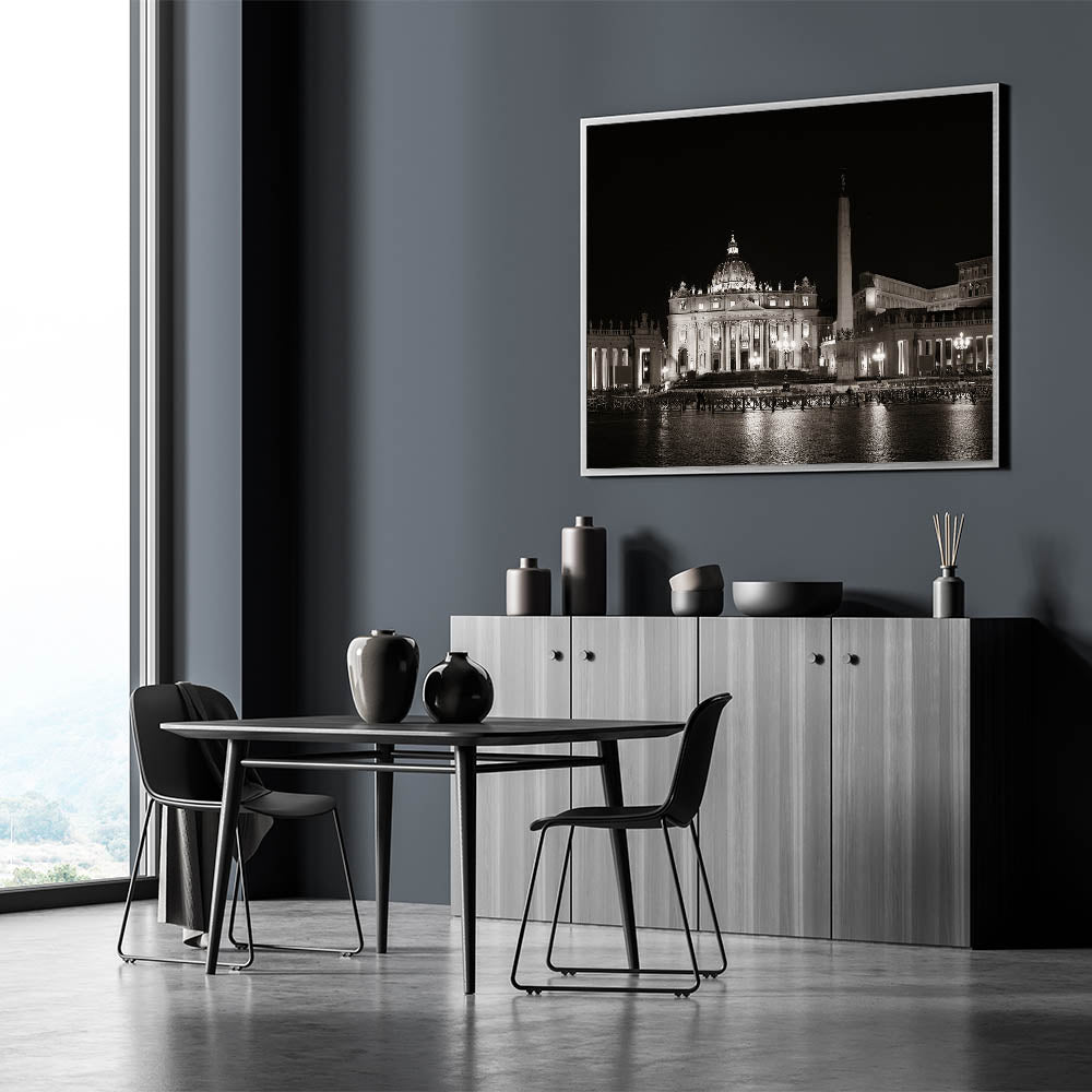 This historical Vatican art print is designed to add sophistication and timeless beauty to your home. The serene atmosphere of St. Peter's Basilica at night creates a striking focal point, making this European scenery wall art a must-have for your decor.