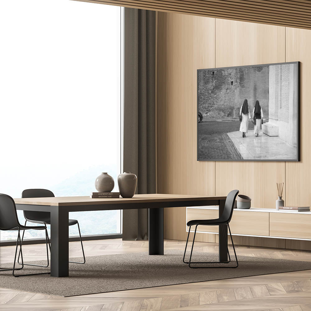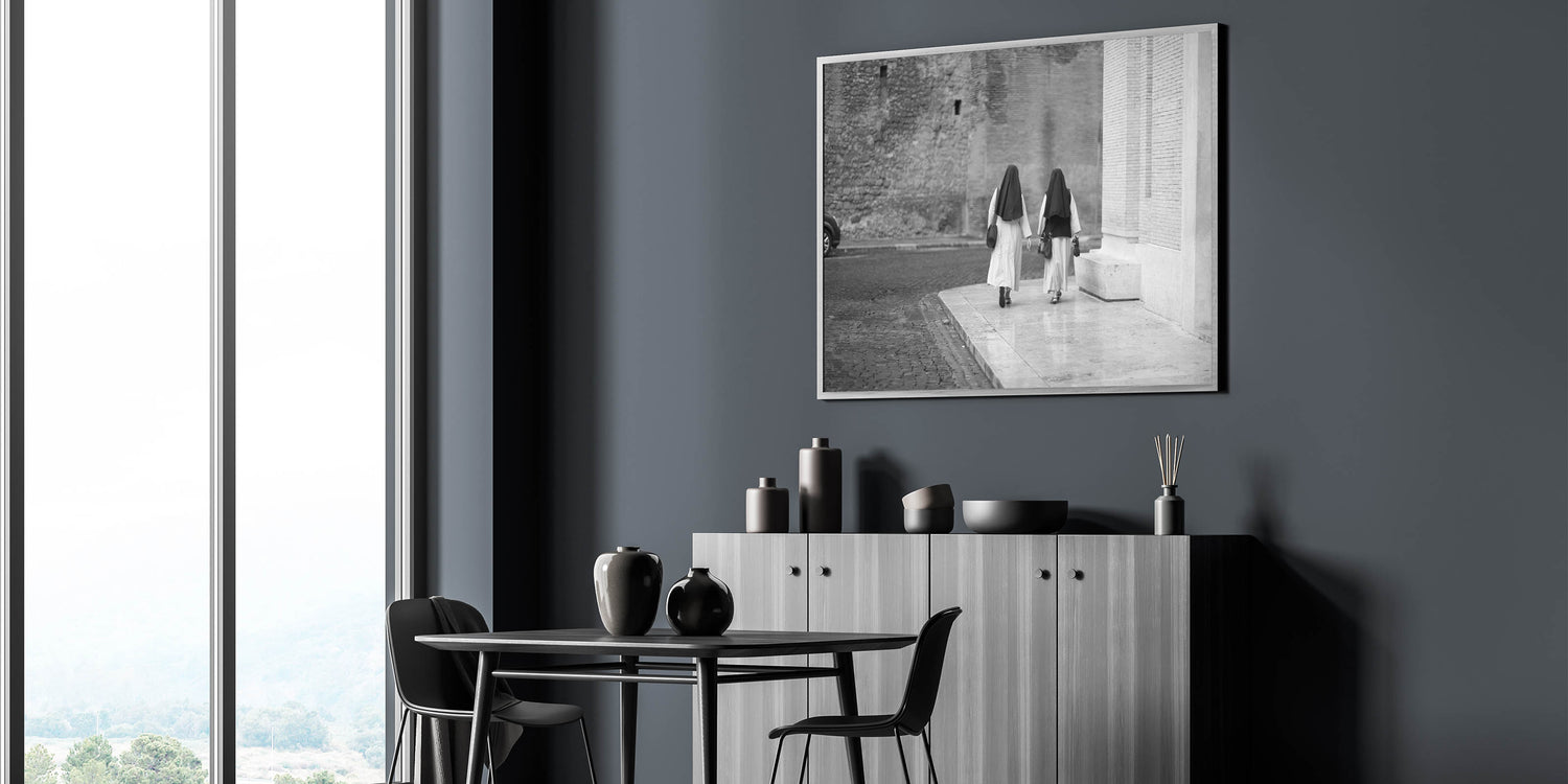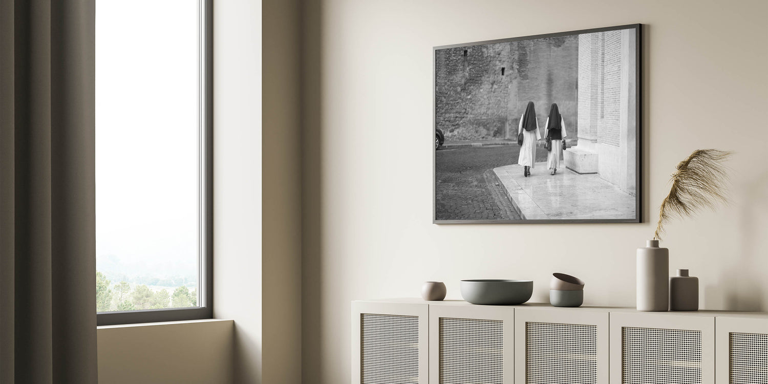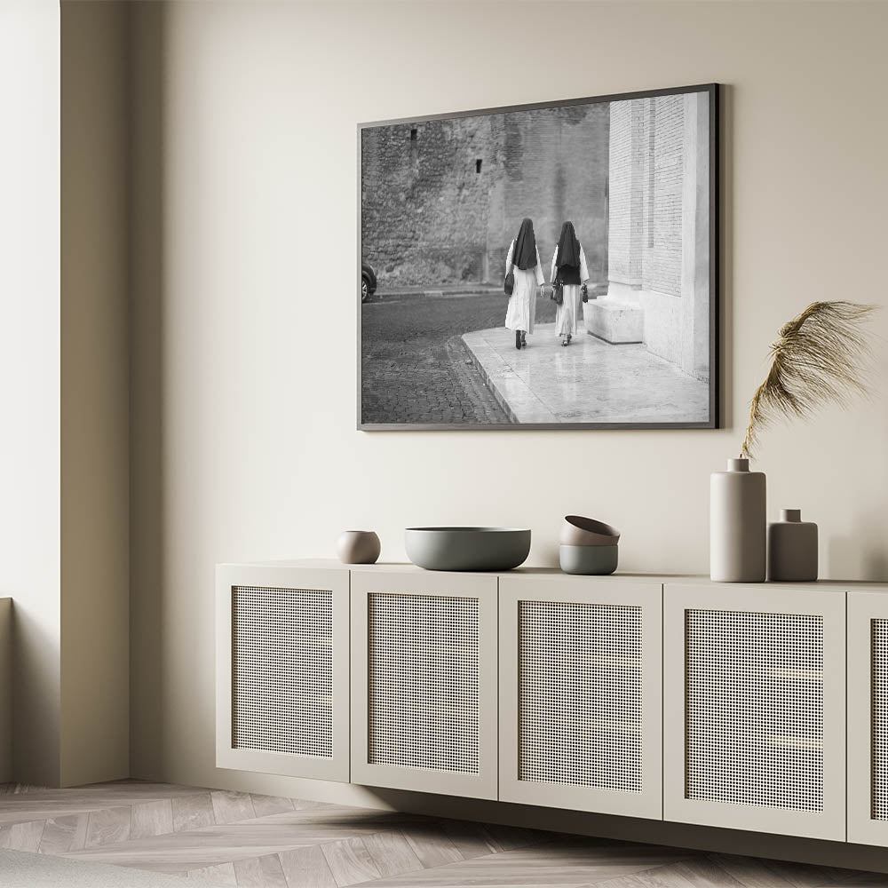 This elegant Vatican wall art captures the quiet serenity of two nuns walking through a historic Vatican street. The black-and-white tones highlight the timeless quality of this scene, evoking a sense of peace, contemplation, and spirituality. This print is perfect for those who appreciate historical Vatican art and wish to bring a touch of spiritual beauty into their home decor.