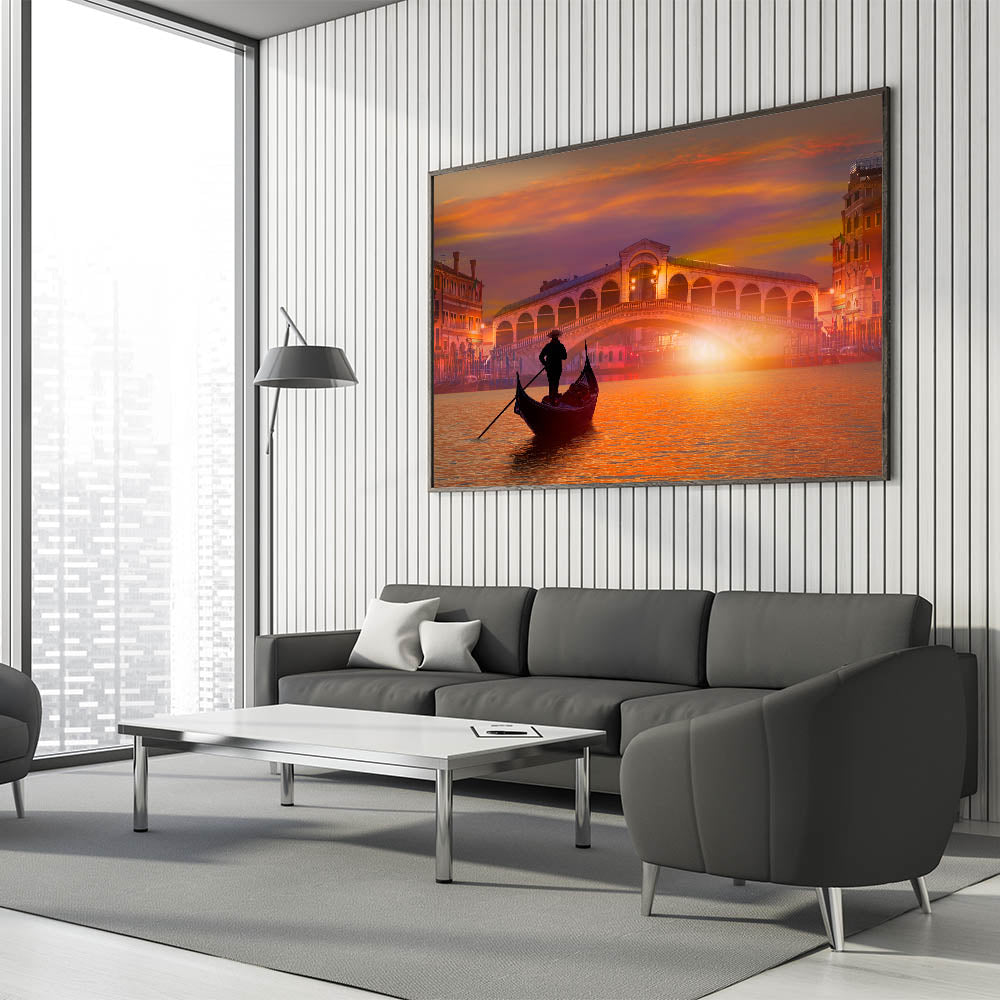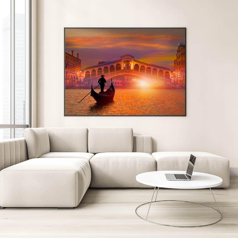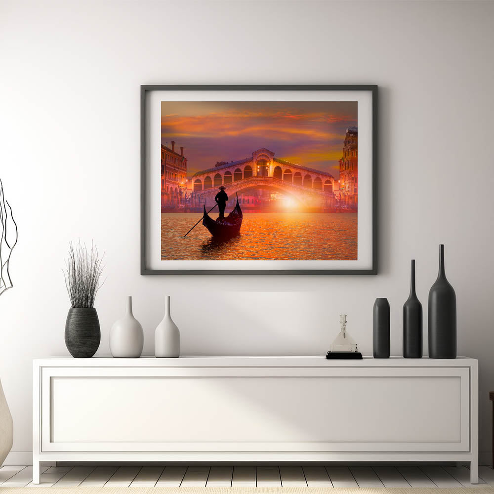 This Venice artwork, showcasing a gondola at sunset with the majestic Rialto Bridge in the background, is perfect for anyone looking to bring the warmth and beauty of Venetian scenery into their space. Whether for home or office, this Venice cityscape will transport you to the heart of Italy's romantic waterways.