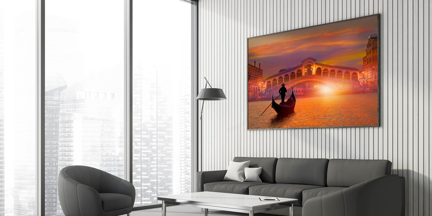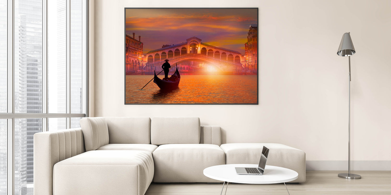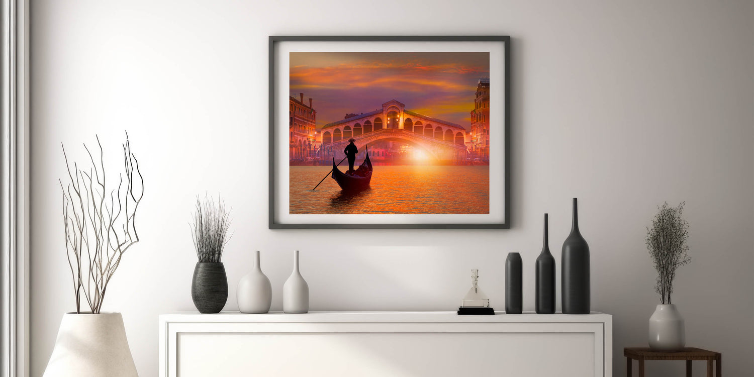 This Venice artwork, showcasing a gondola at sunset with the majestic Rialto Bridge in the background, is perfect for anyone looking to bring the warmth and beauty of Venetian scenery into their space. Whether for home or office, this Venice cityscape will transport you to the heart of Italy's romantic waterways.