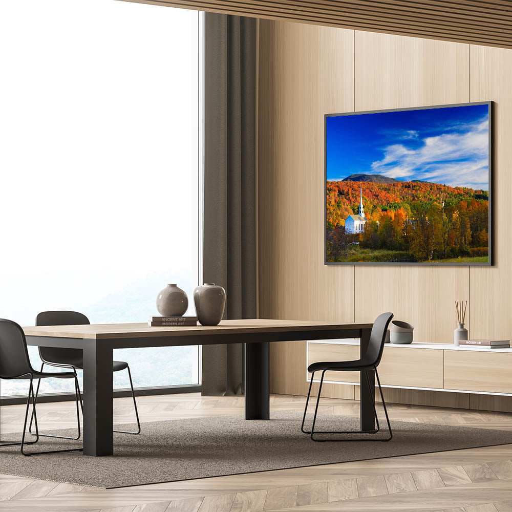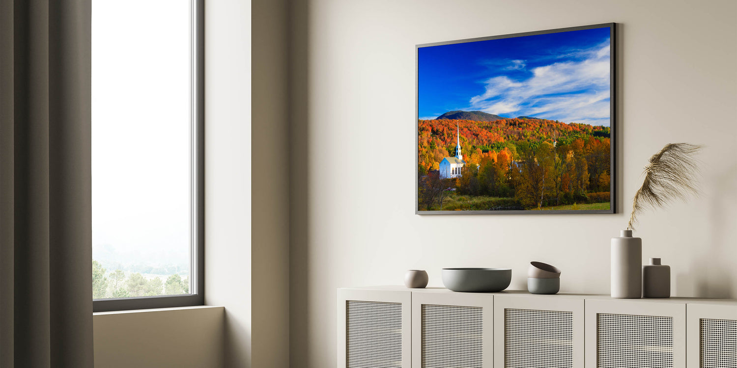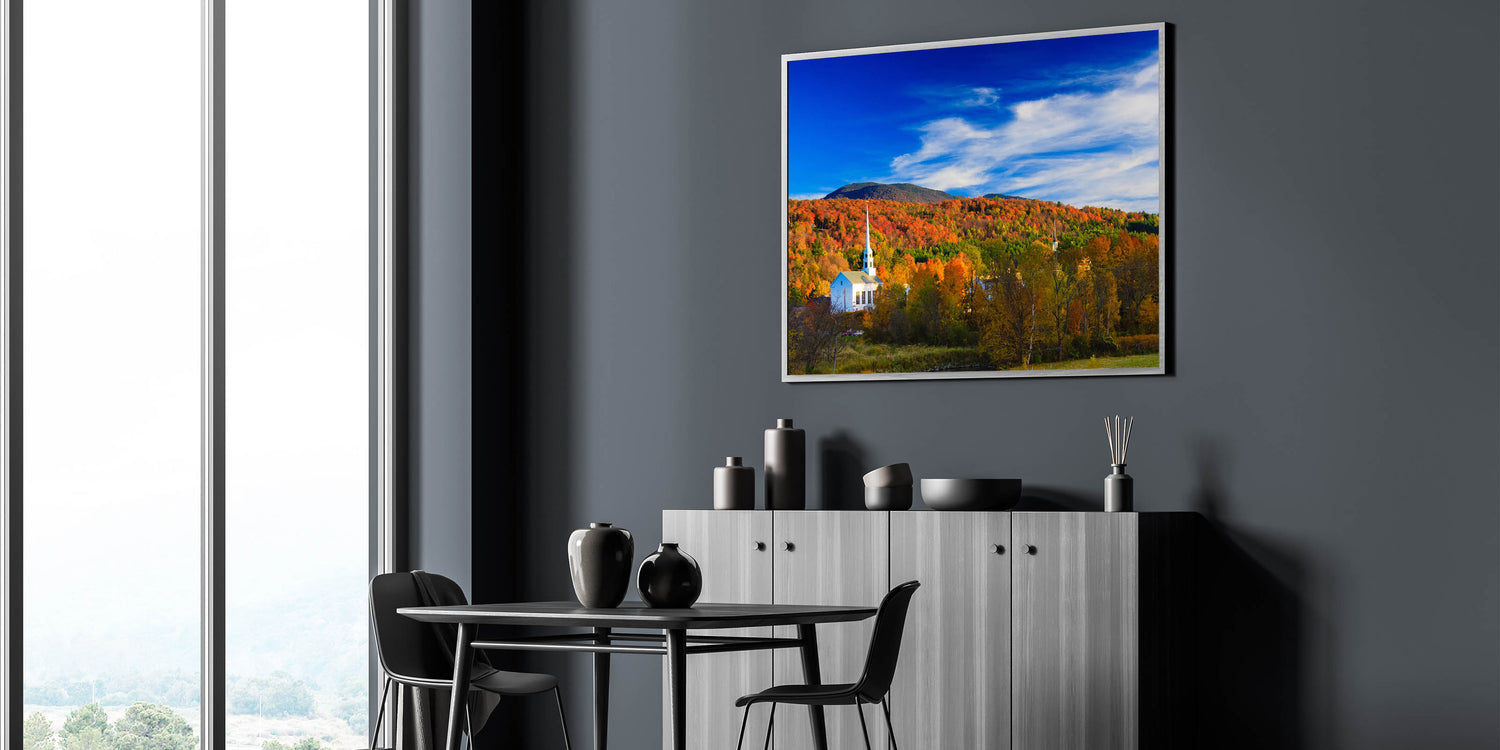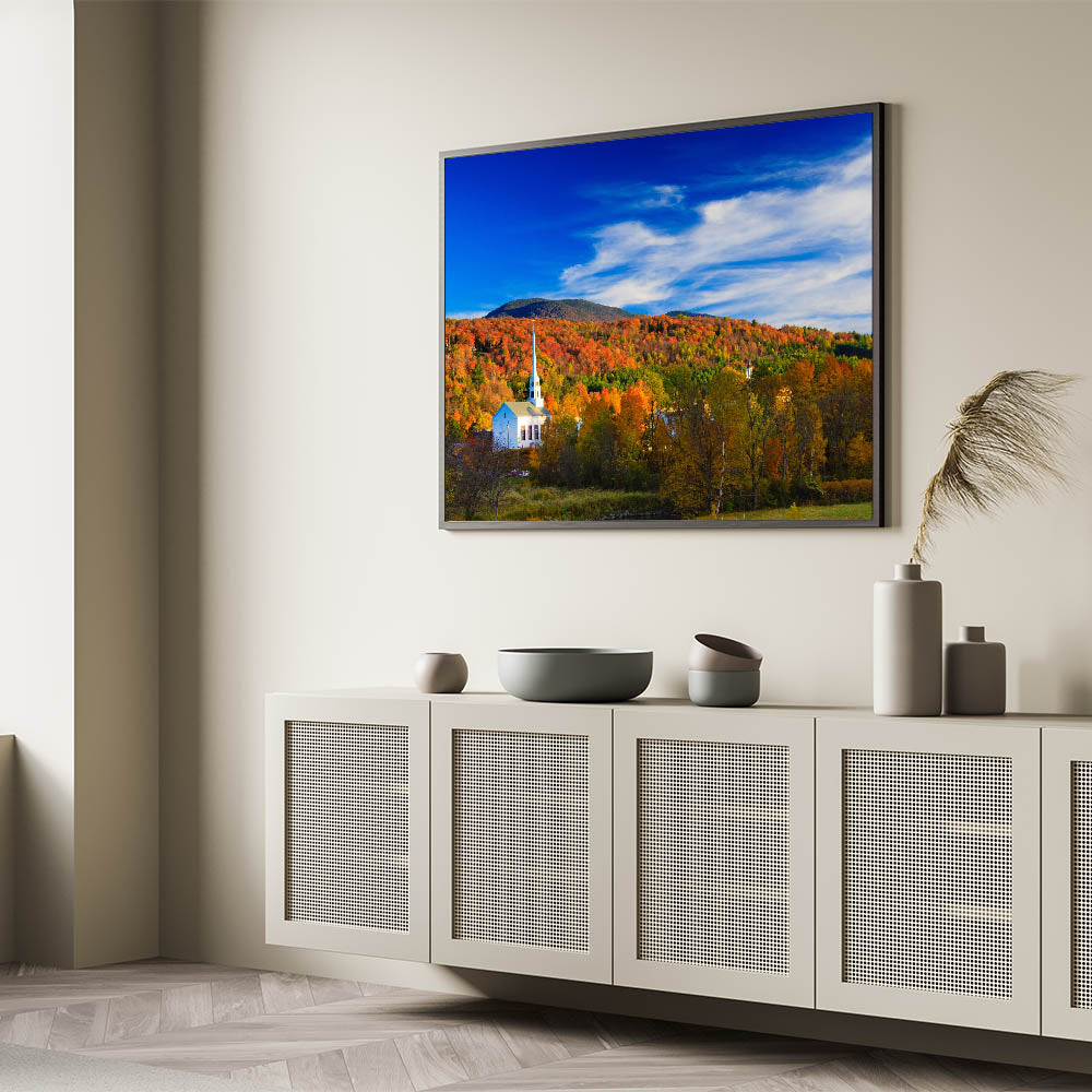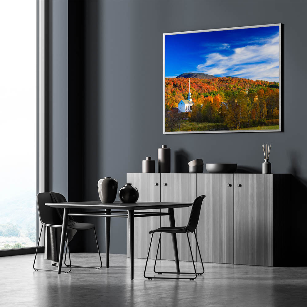 Experience the vibrant beauty of Vermont’s fall season with this stunning wall art piece. Featuring a classic New England church surrounded by the brilliant hues of autumn foliage, this artwork captures the essence of Vermont's charm. Set against the backdrop of rolling mountains and a bright blue sky, this Vermont scenic art is perfect for those who love the natural beauty and peaceful serenity of the countryside.