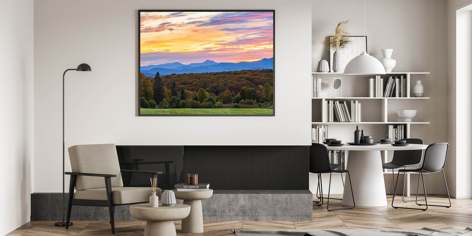 - Stunning Vermont nature art featuring a colorful sunset over the Green Mountains.