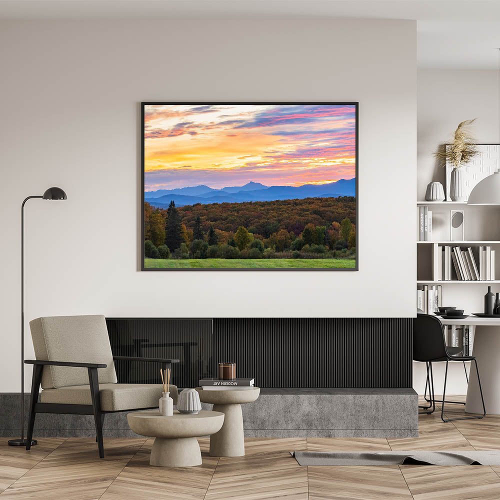 Bring the tranquility of Vermont’s natural beauty into your home with this stunning Vermont canvas art. Featuring a vibrant sunset over the rolling Green Mountains, this piece of Vermont landscape art captures the serene colors of dusk, blending shades of orange, pink, and blue across the sky. The lush green forest in the foreground completes this picturesque view, creating a peaceful and calming addition to any room.
