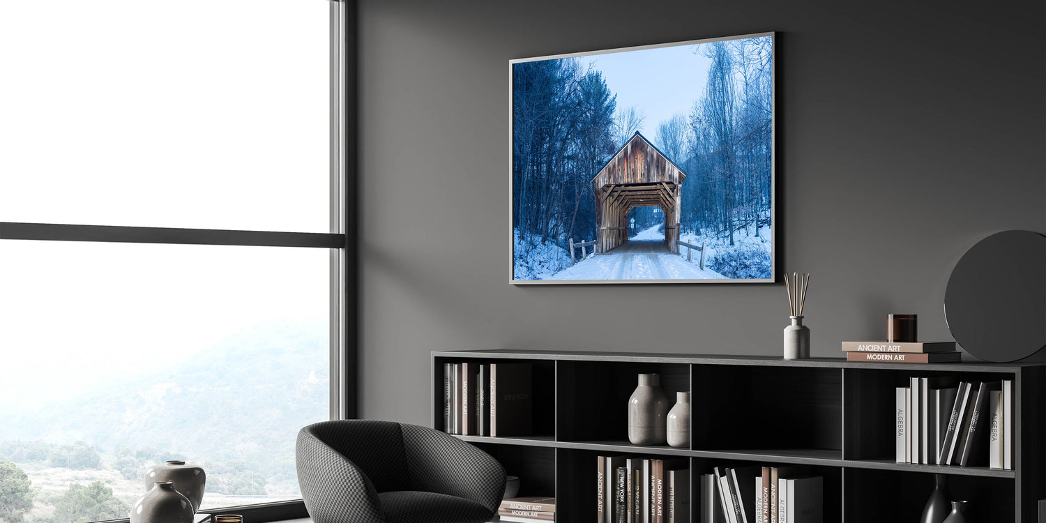 Capture the rustic charm of Vermont with this striking wall art of a classic wooden covered bridge nestled in a snow-covered forest. This serene winter scene brings out the peaceful and timeless beauty of Vermont’s landscapes, perfect for those who love the simple elegance of nature in the colder months. The aged wood of the bridge contrasts beautifully with the snow and trees, creating a captivating piece of Vermont scenic art.