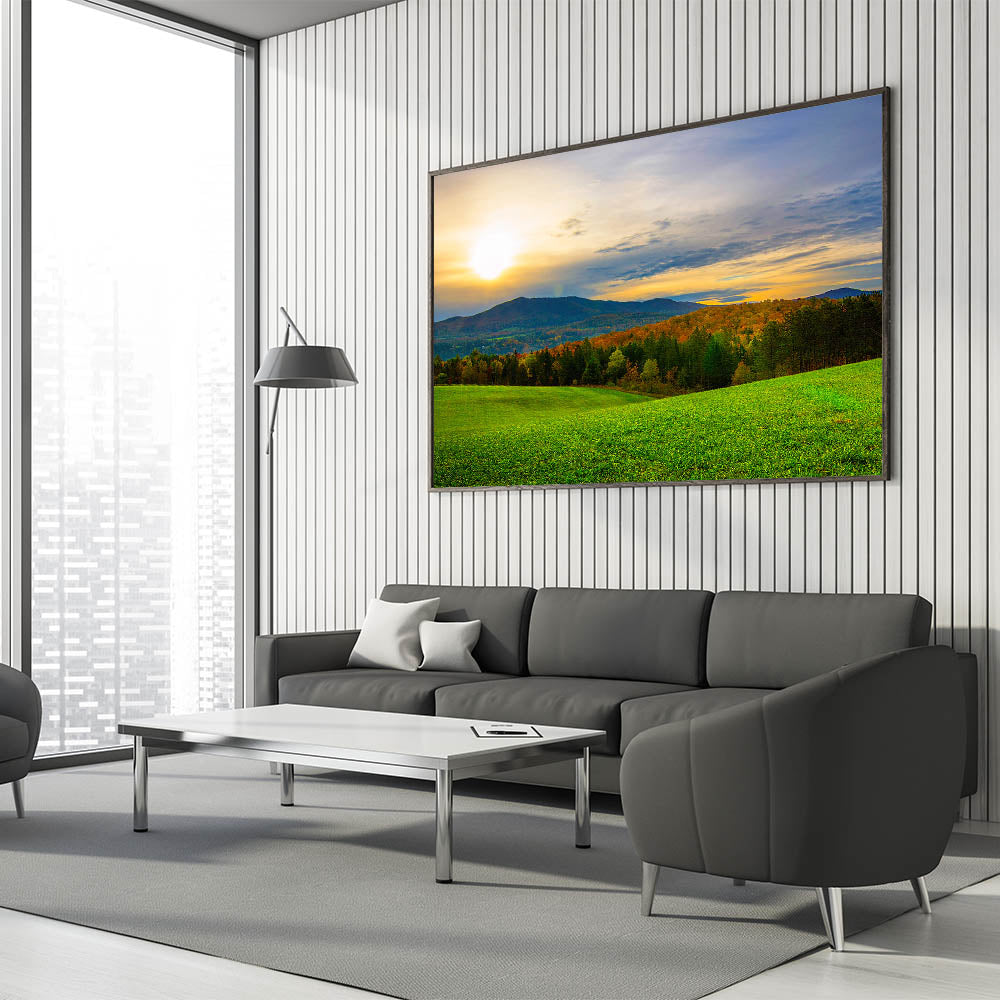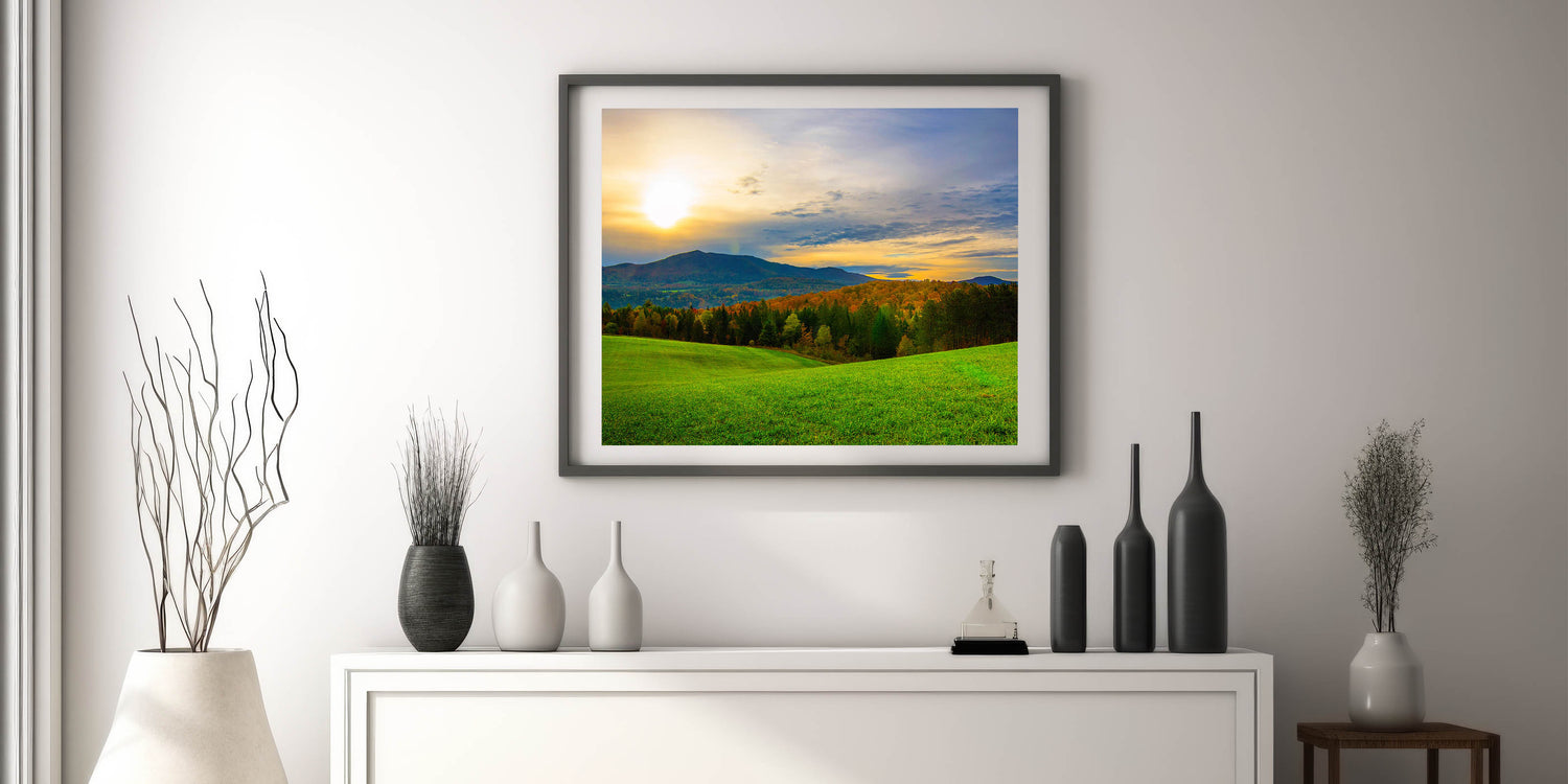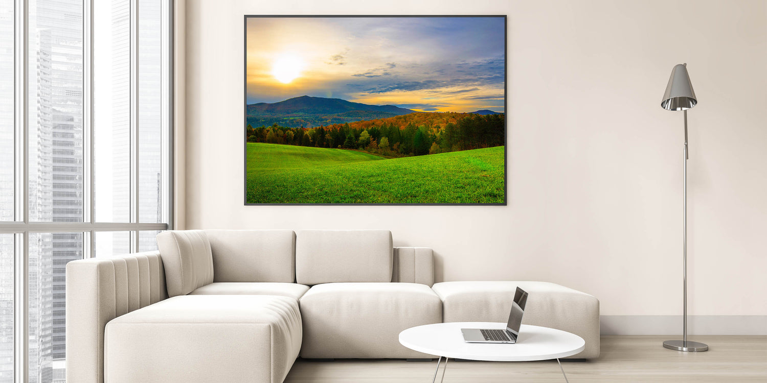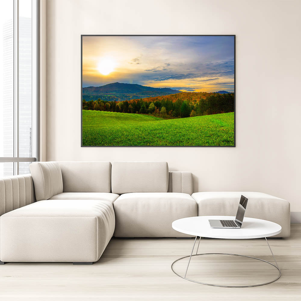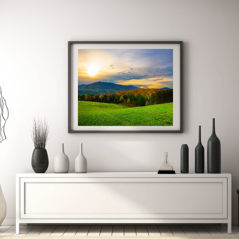 Capture the peaceful beauty of Vermont’s rolling hills and stunning sunsets with this breathtaking wall art. This Vermont landscape art features a serene view of green fields bathed in the golden glow of the setting sun, with vibrant autumn trees and distant mountains providing a majestic backdrop. The natural beauty and calming atmosphere of this Vermont scenic art make it a perfect addition to any home or office.