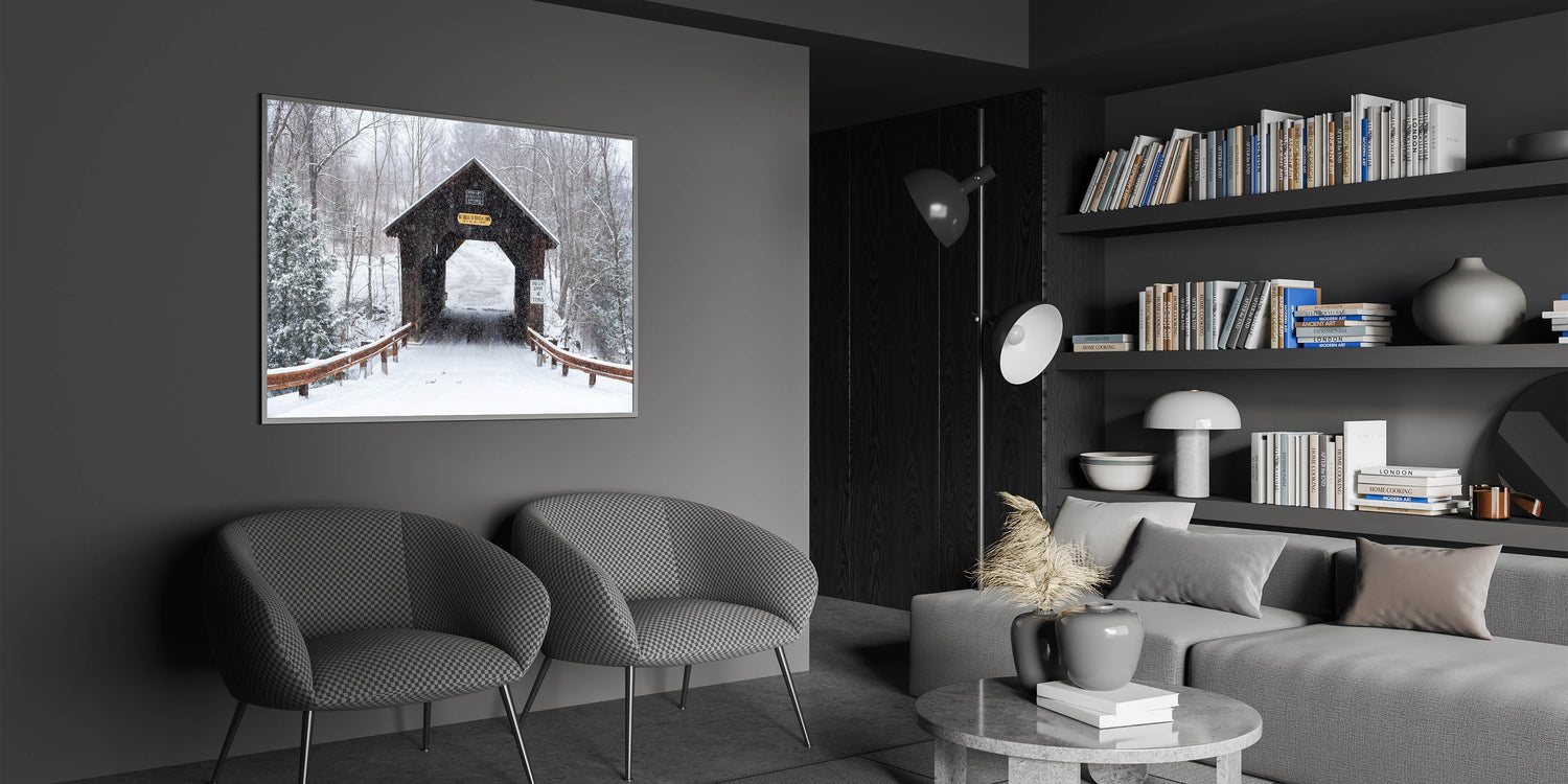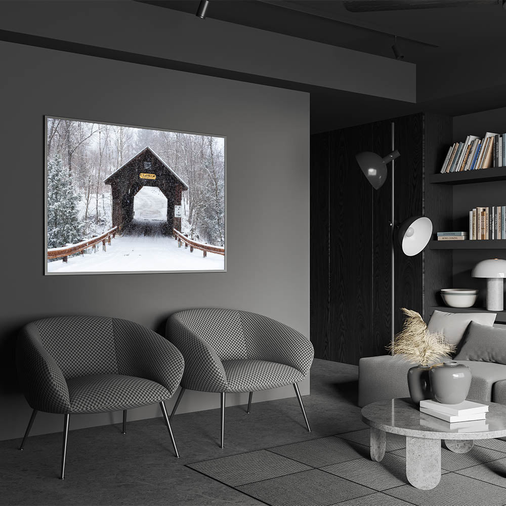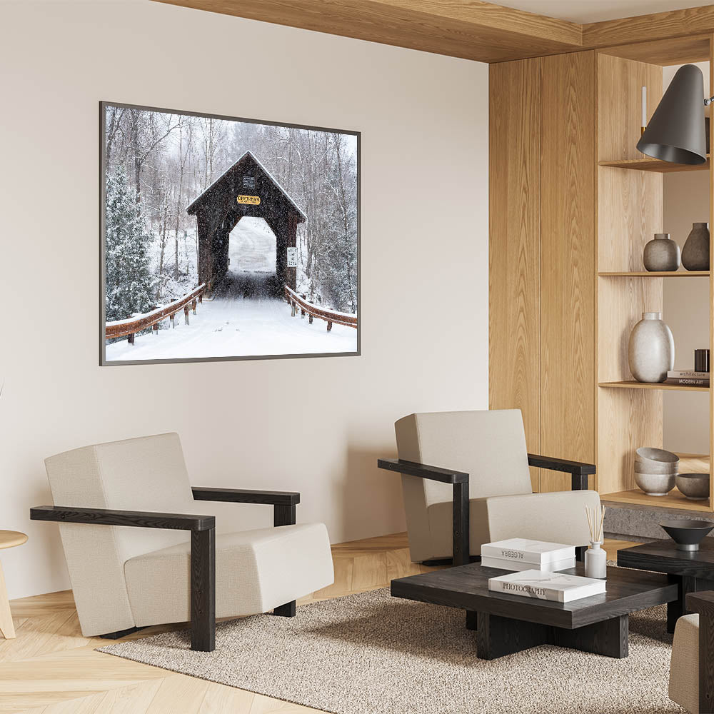 Experience the quiet charm of a Vermont winter with this stunning wall art featuring a classic covered bridge surrounded by a snow-covered landscape. The snowfall gently frames the rustic bridge, highlighting the simple beauty of Vermont’s countryside in winter. This Vermont scenic art captures the magic of a snowy day, with its soft colors and timeless design making it a perfect addition to any space.