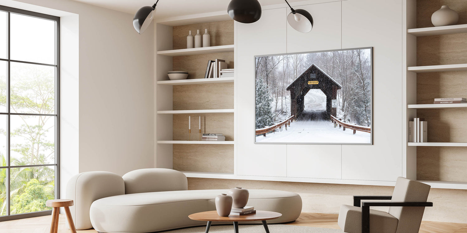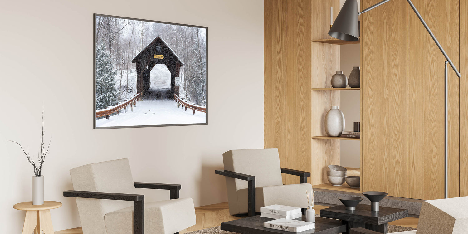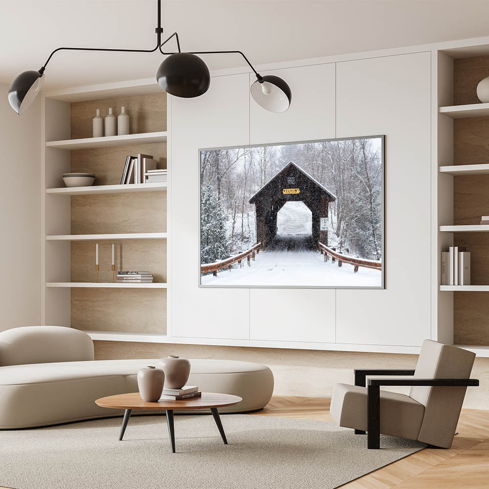 Experience the quiet charm of a Vermont winter with this stunning wall art featuring a classic covered bridge surrounded by a snow-covered landscape. The snowfall gently frames the rustic bridge, highlighting the simple beauty of Vermont’s countryside in winter. This Vermont scenic art captures the magic of a snowy day, with its soft colors and timeless design making it a perfect addition to any space.