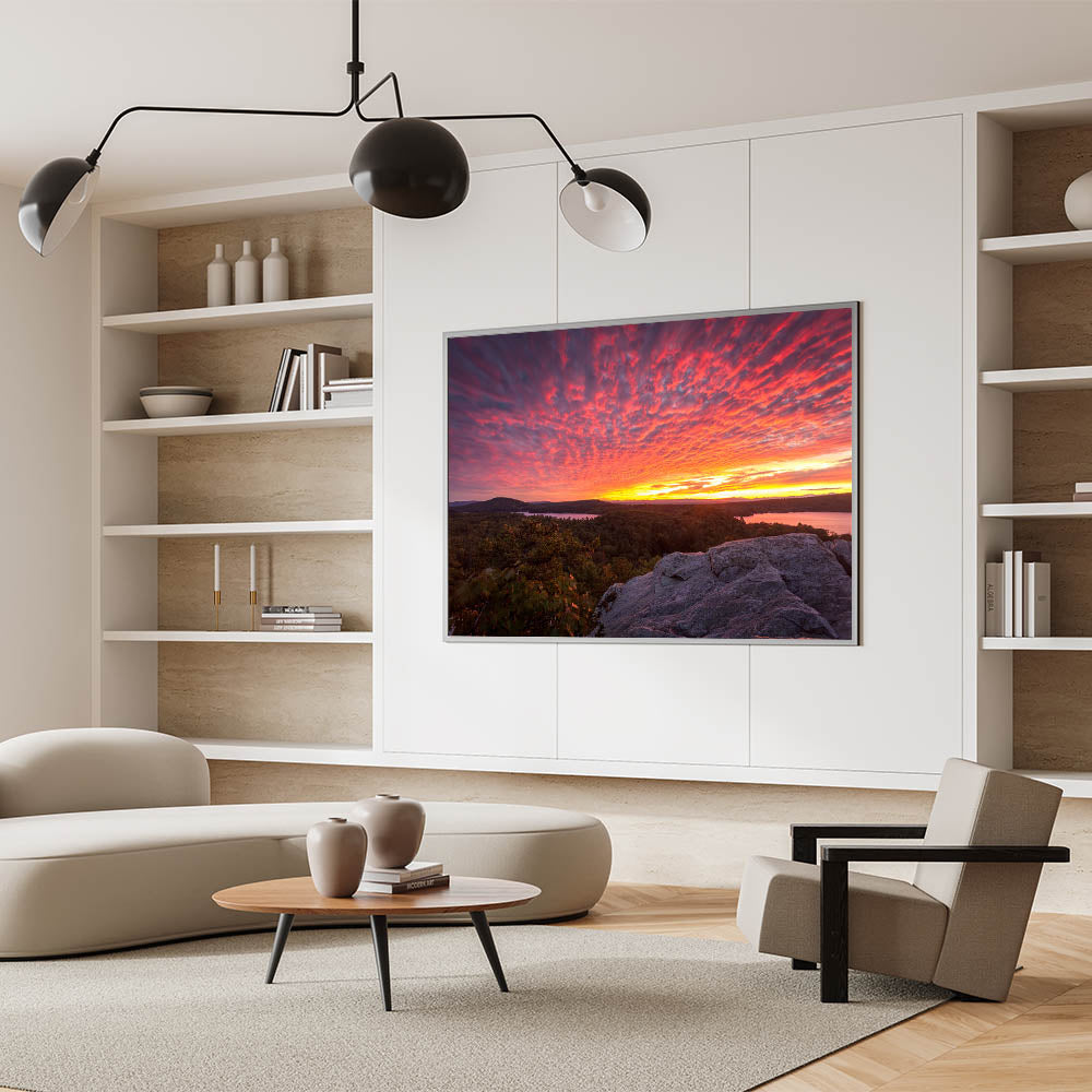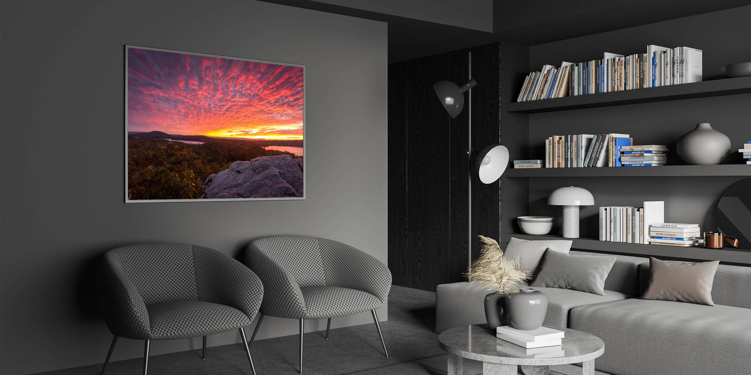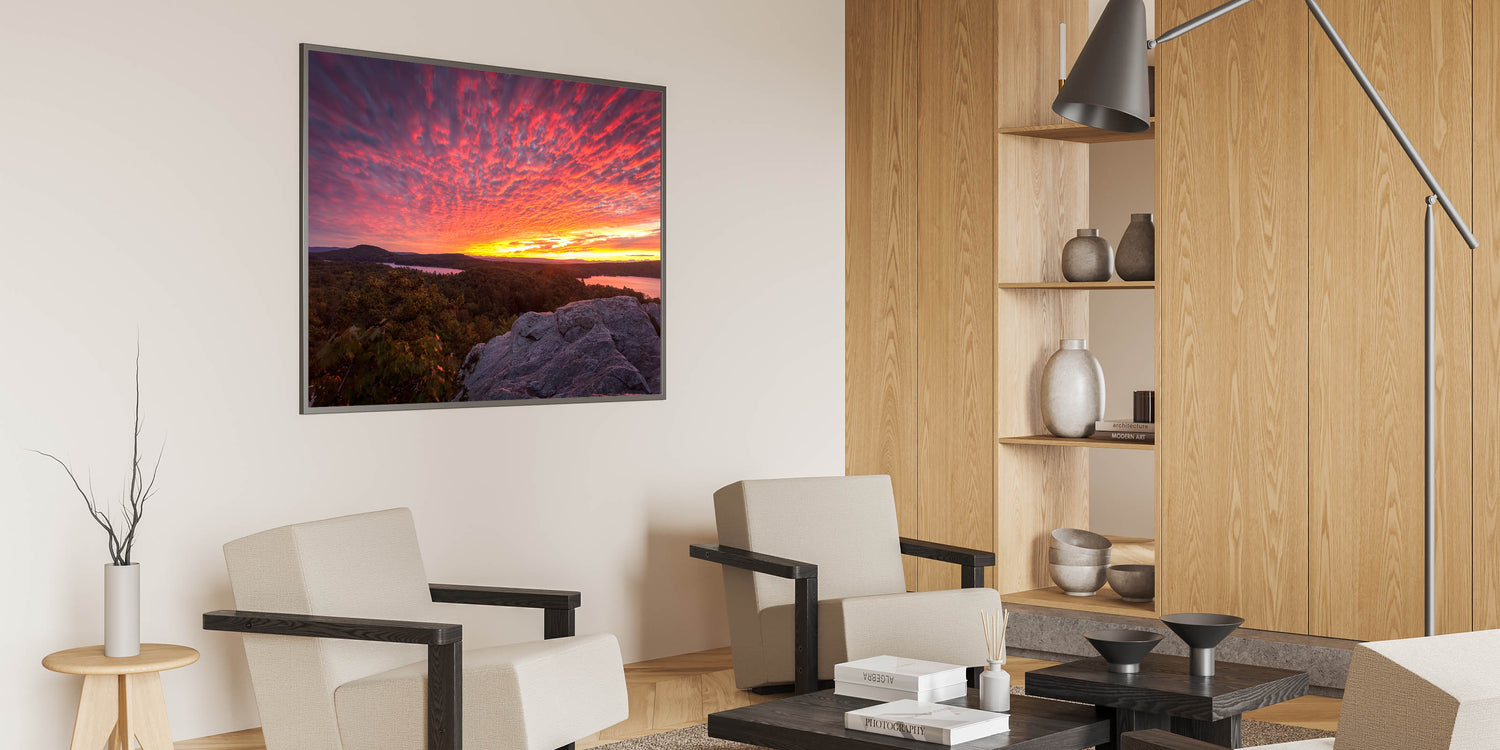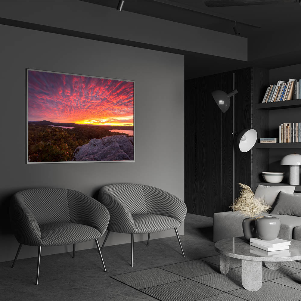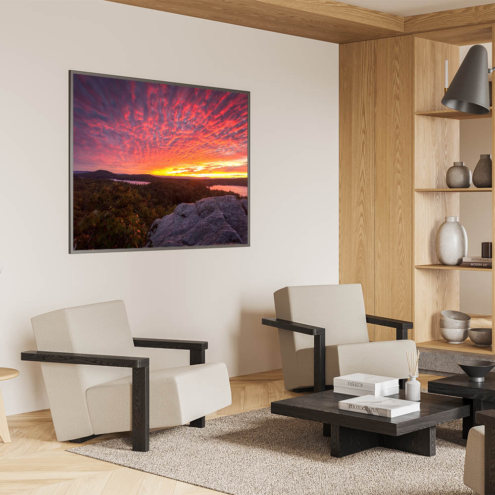 Capture the breathtaking beauty of a Vermont sunset with this stunning landscape wall art. This Vermont photography print showcases a dramatic, fiery sky above the serene mountains and lush forests. The vibrant oranges, pinks, and reds of the sunset contrast beautifully against the dark green foliage and rocky foreground, creating an eye-catching masterpiece. Perfect for anyone who loves nature and bold colors, this Vermont sunset art will add warmth and energy to any space.