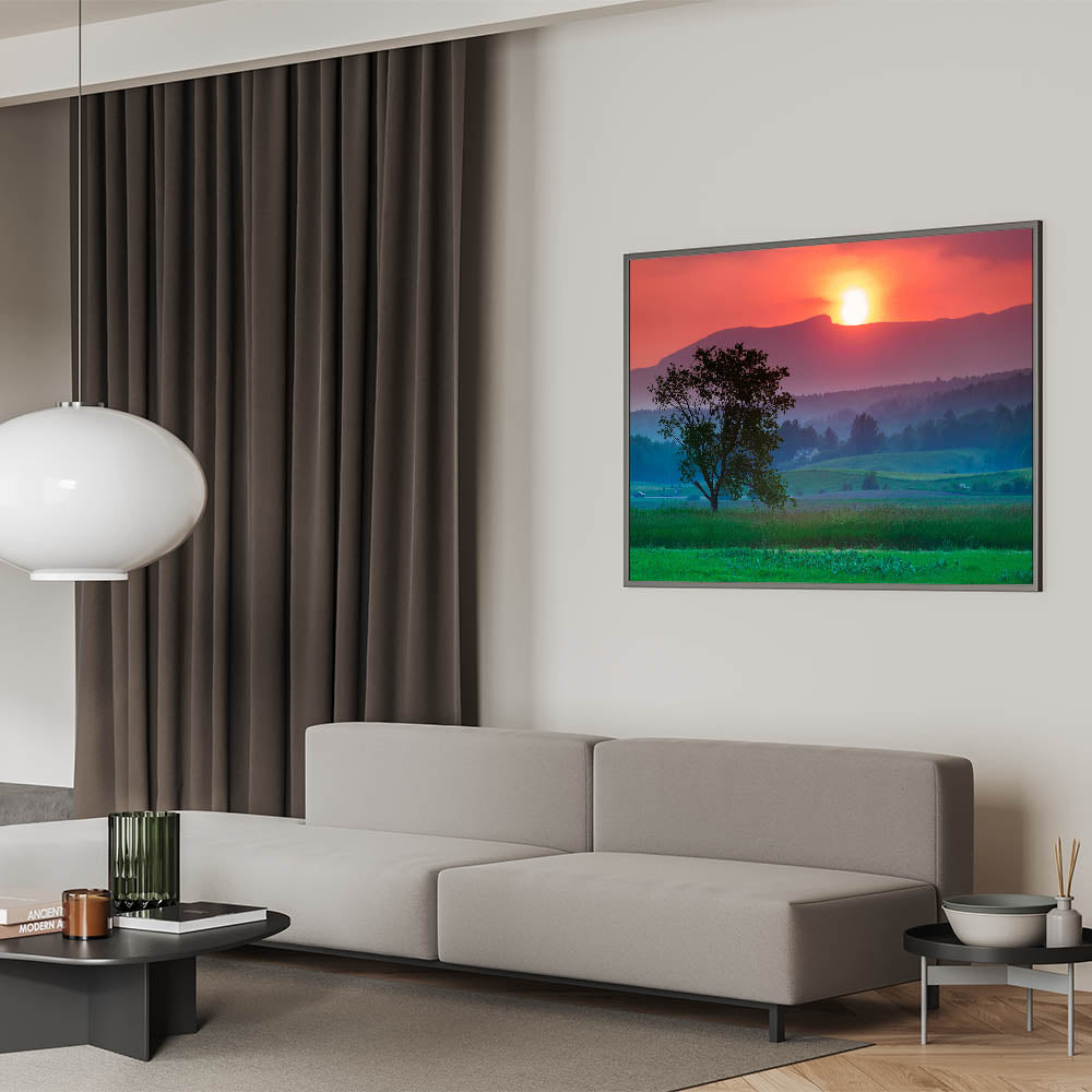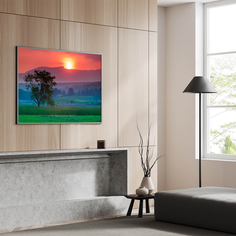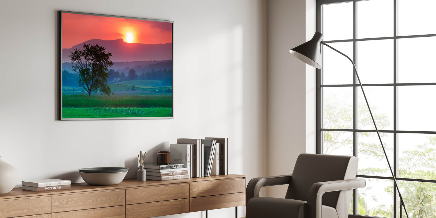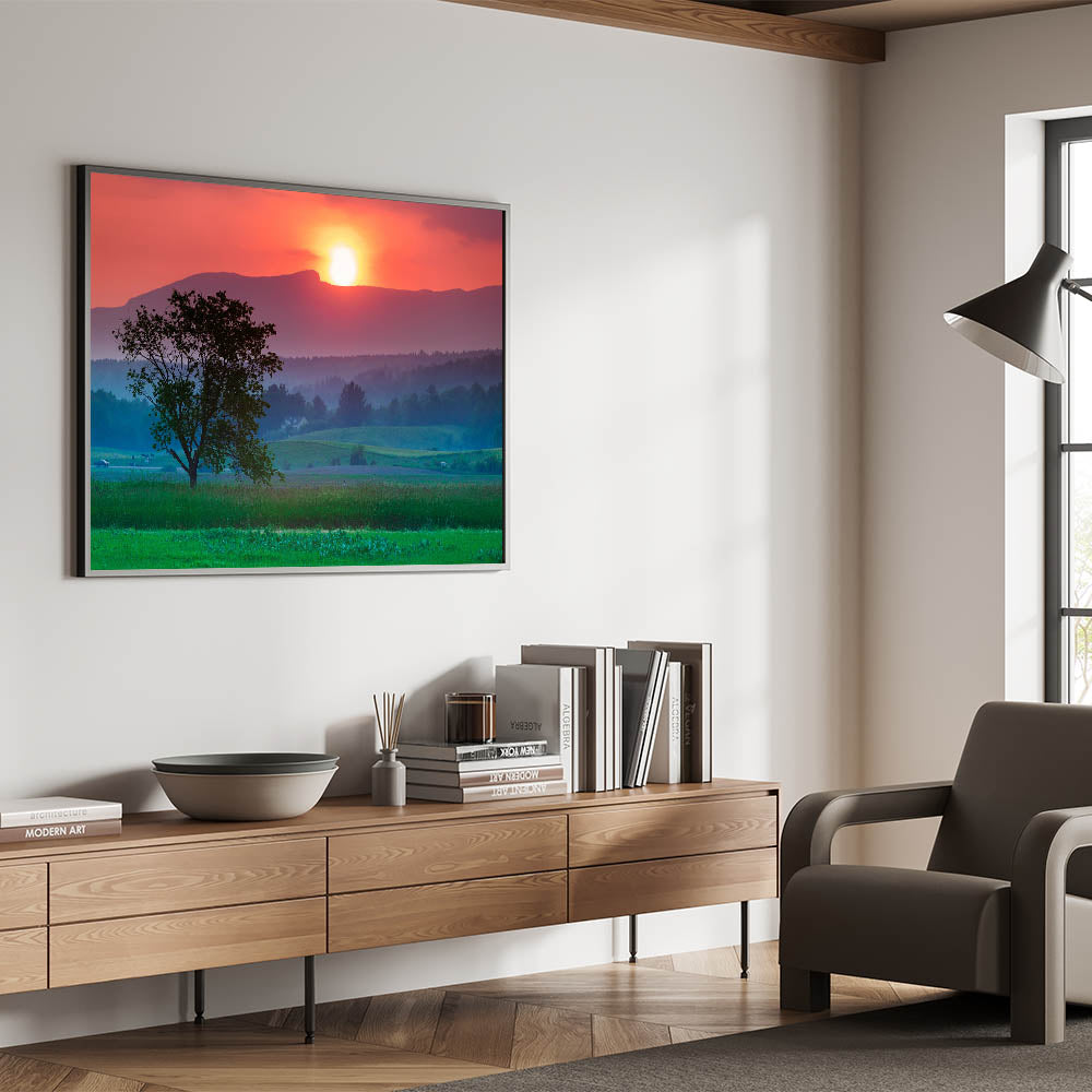 Transform your space with this captivating piece of Vermont wall art, showcasing a stunning sunset over the lush green hills of Vermont. This photograph captures the natural beauty of Vermont, offering a perfect blend of vibrant colors and serene landscapes.