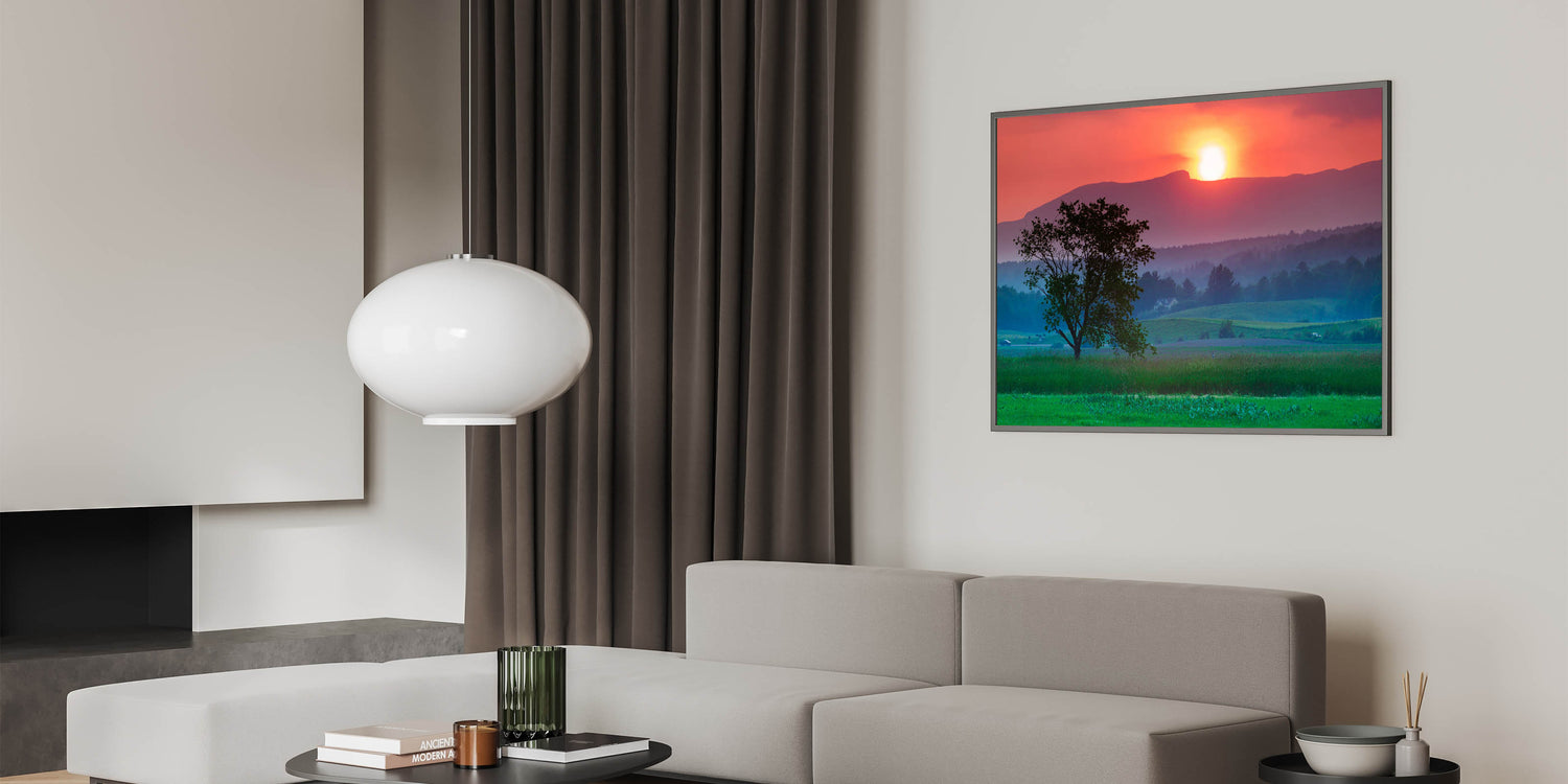 - High-quality Vermont wall art available in stretched canvas, framed canvas, and acrylic glass.